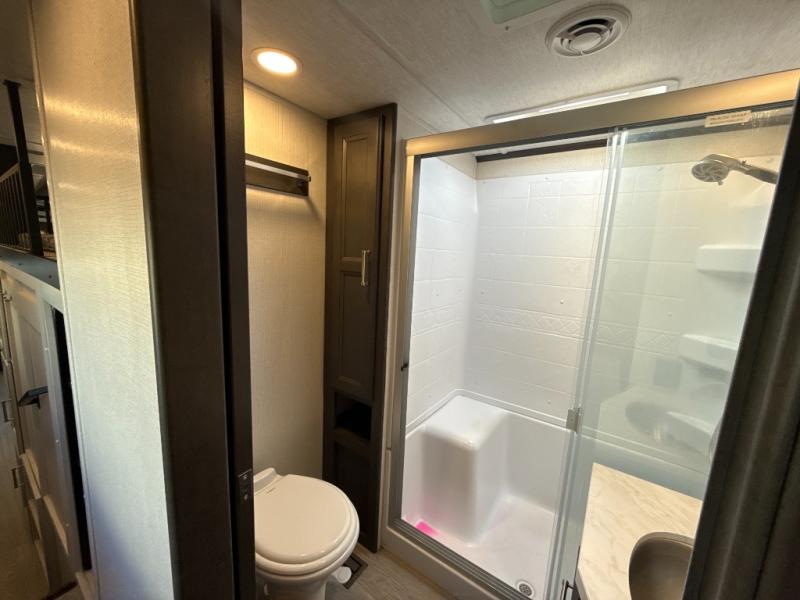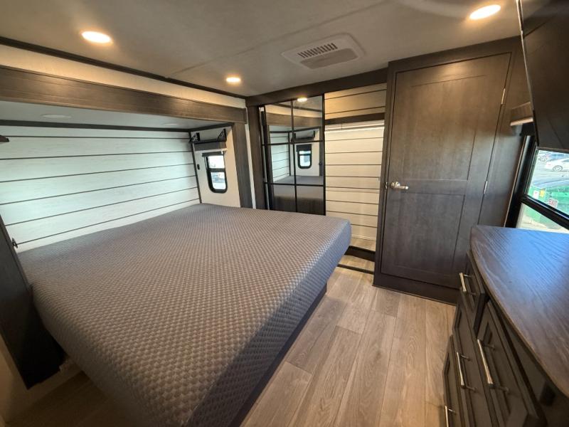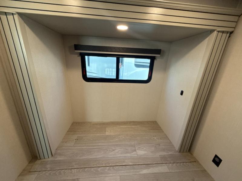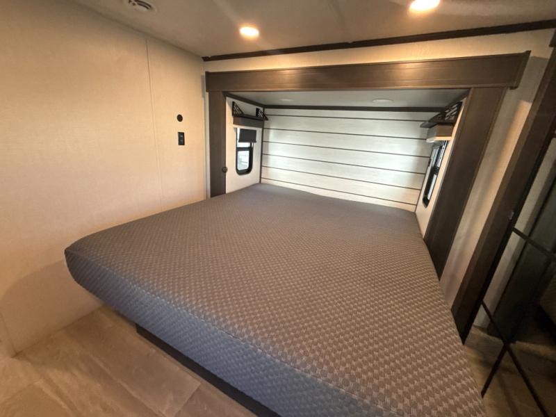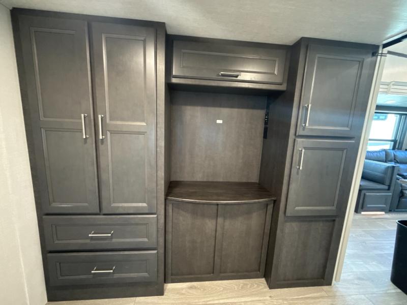 You'll love having an extra room that you can decide what to do with on this Cougar fifth wheel! There is a tri-fold sleeper sofa here, a desk plus two wardrobes for storage. Above this room is a loft which adds more sleeping space without taking up precious interior living space. And speaking of space, you'll find more of it in the main living area when you push out the opposing slides. A second tri-fold sleeper sofa sits in the living area, and there is also theater seating that you can rest on in front of the entertainment center with a hidden pantry and cordless vacuum prep behind. The full bathroom has a linen closet for your towels and washcloths, and there is also great storage in the front private bedroom with the under-bed storage, dresser with a sliding top, and a full-height wardrobe. Outside, you'll find two power awnings, an unobstructed pass-thru storage, and an outdoor kitchen prep area!