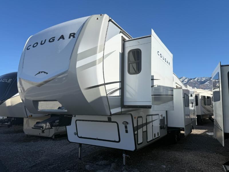 Spend more time having fun and less time worrying about your RV with the Keystone Cougar fifth wheel! These units have all that you will need for excellent vacations. The interior comes with 5/8" one-piece DynaSpan® flooring, tall slide outs for added comfort and head room, night roller shades throughout, and residential, raised-panel hardwood cabinet doors and drawers. You will also enjoy decorative crown molding, a 5,500 BTU electric fireplace with thermostat control and remote, and a Max Air exhaust fan with rain sensor. The exterior is also fully outfitted with a convenience center, friction-hinge entry door, electric four-point auto leveling system, and Lippert SolidStep® on the main entry. Each model is available with the optional Hero Edition. By choosing this edition, you can help support our nation's heros and their families by contributing to the Wounded Warrior Project. This optional package features an industry exclusive full-body paint matte finish, frameless windows, a glass entry door, blackout rims, and green LED exterior accent lighting; see dealer for more details!