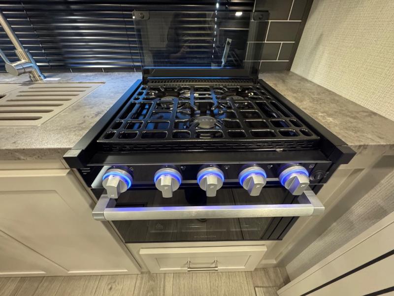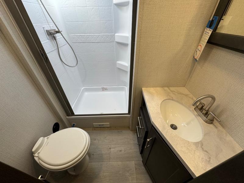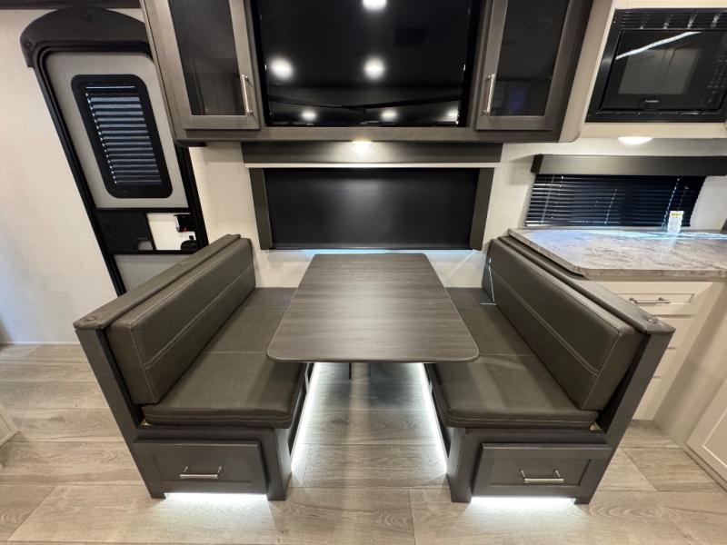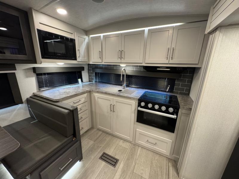 If you're ready for fun summers at the lake, make your adventures complete with this travel trailer in tow. The rear kitchen includes ample counter space to prep burgers, and you can take your preparations outside to cook on the outdoor kitchen! If the weather is nice, you might just want to eat outside too under the 18' power awning, or dine inside at the booth dinette. There is also a tri-fold sleeper sofa within the large slide out and an LED HDTV for movie nights. You'll find plenty of storage throughout, including a kitchen pantry, overhead cabinets, plus dual bedroom wardrobes on either side of the king bed!