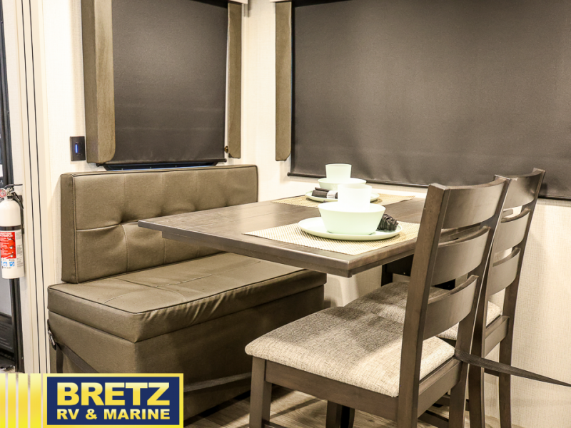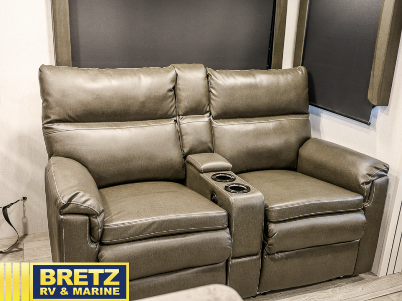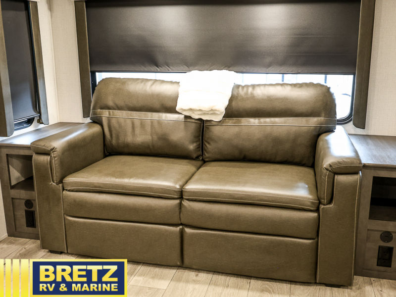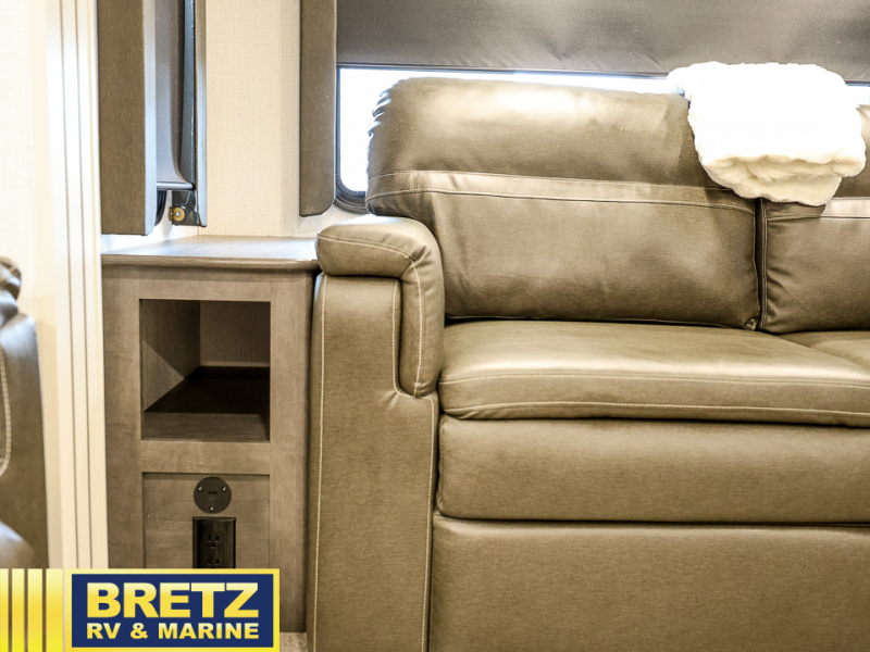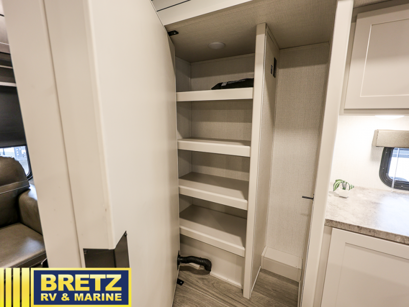 Trips spent in this travel trailer are sure to bring memories! The dual opposing slides in the combined kitchen and living area provide your crew with plenty of space to relax on the theater seating, dine at the dinette table, and prep meals with the kitchen island. There is also a tri-fold sleeper sofa here for guests and a pivoting entertainment center with a hidden pantry to keep snacks stocked. And a second pantry and hutch provides even more storage! You'll love having your own private bedroom up front, complete with a king bed, dual bedside drawers and nightstands and additional storage drawers to keep your space tidy. Outside, you'll find two power awnings, a 2" accessory hitch, and a drop frame pass-thru storage for fishing poles, hiking gear, and more!