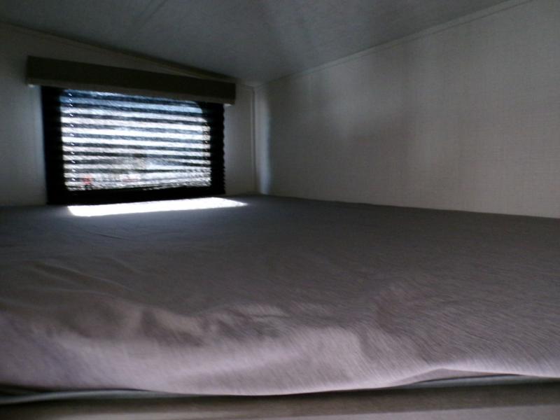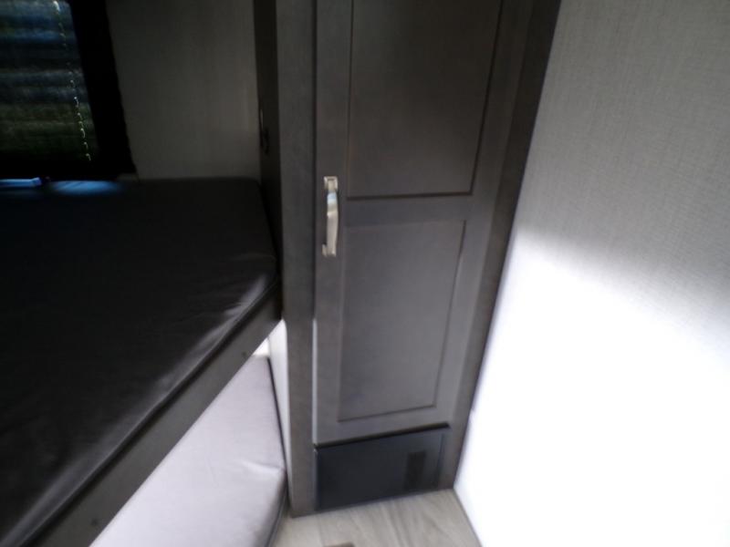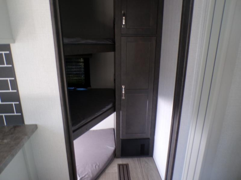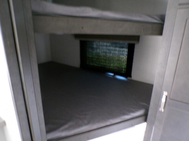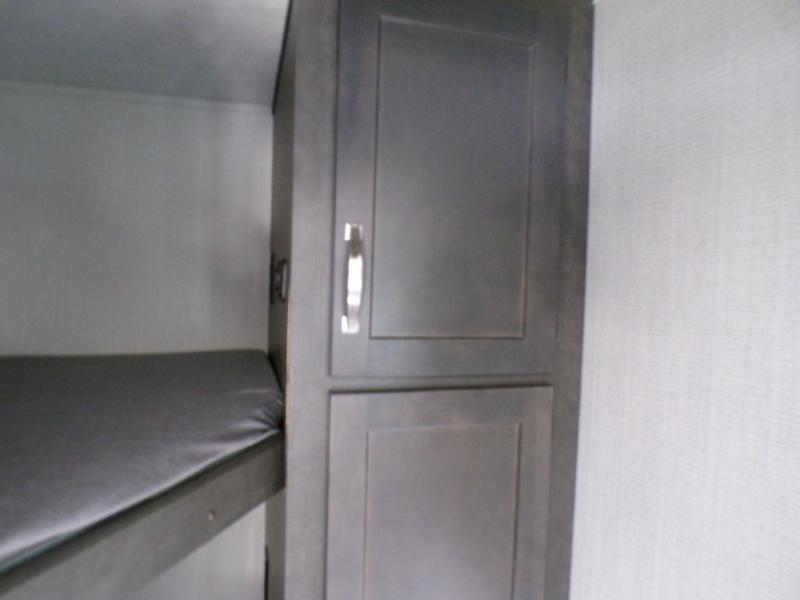 This lightweight Cougar Sport bunk model features sleeping for ten or more with triple stacked double bed bunks in the rear bunk room, a large U-shaped dinette that can be transformed into sleep space, as well as a tri-fold sofa sleeper and a queen bed in the private bedroom up front. The U-shaped dinette will seat quite a few of you for meals and even game time, plus the sofa is nearby for even more to kick back on. A fully equipped kitchen with overhead microwave, a three burner range, and large sink plus storage will make it easy to keep everyone fed and happy. A 10.4 Cu. Ft. 12 volt refrigerator will keep all of your perishable items fresh, and there are plenty of cabinets for storing snacks and dry goods as well. Head up the steps to the bathroom featuring a shower with a skylight, sink with overhead medicine cabinet, and toilet. The private front bedroom takes you away from the hustle and bustle of the main living area and bunkhouse to provide a relaxing retreat including a comfy queen bed, dual nightstands and shirt wardrobes as well as an additional wardrobe along the interior wall for even more storage.