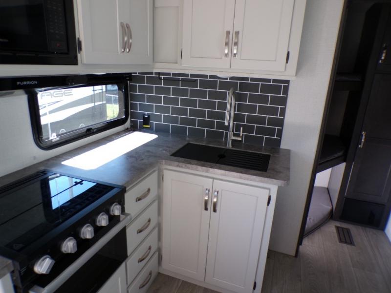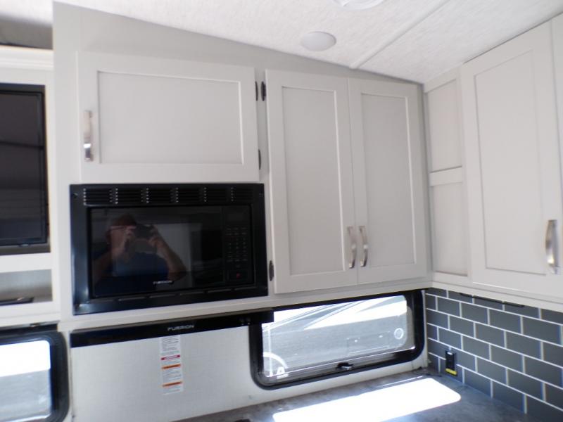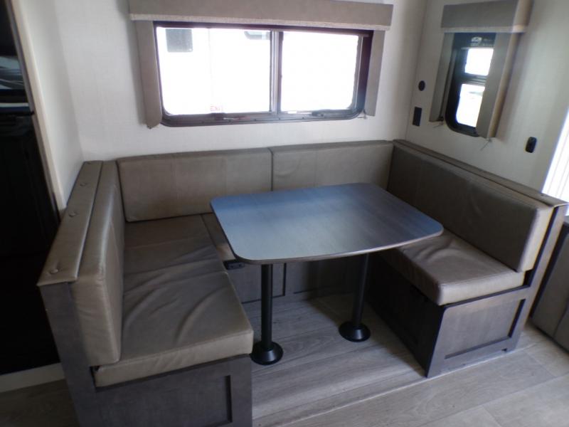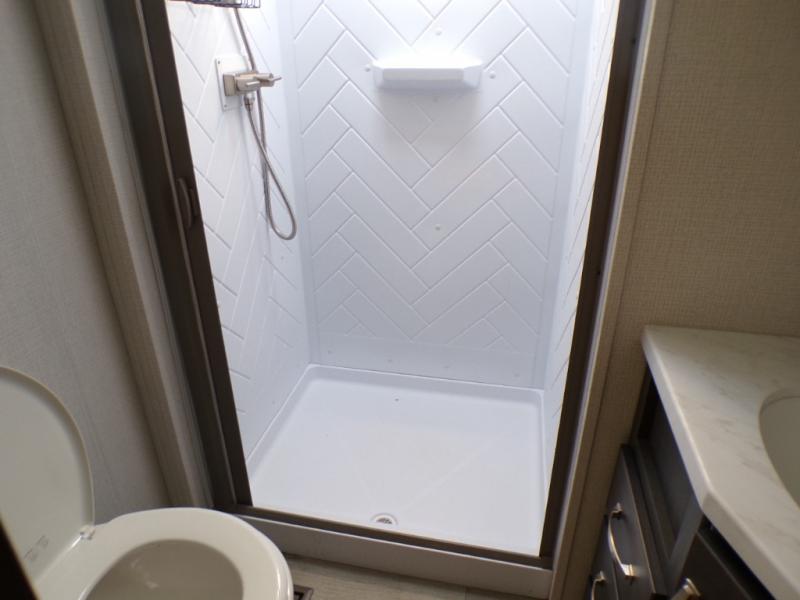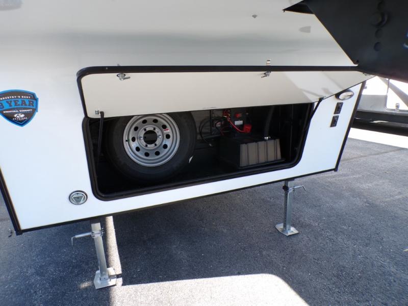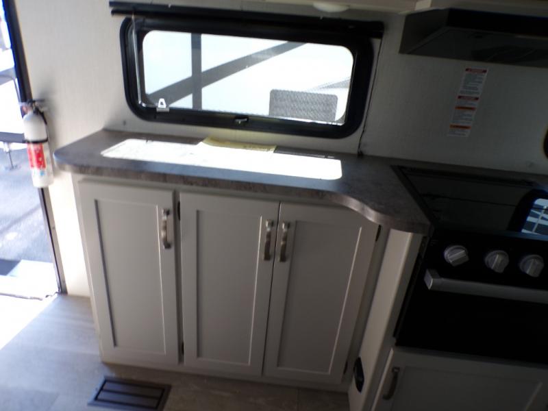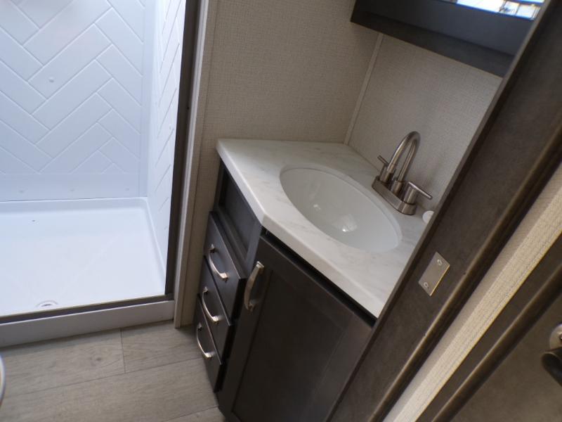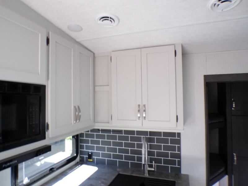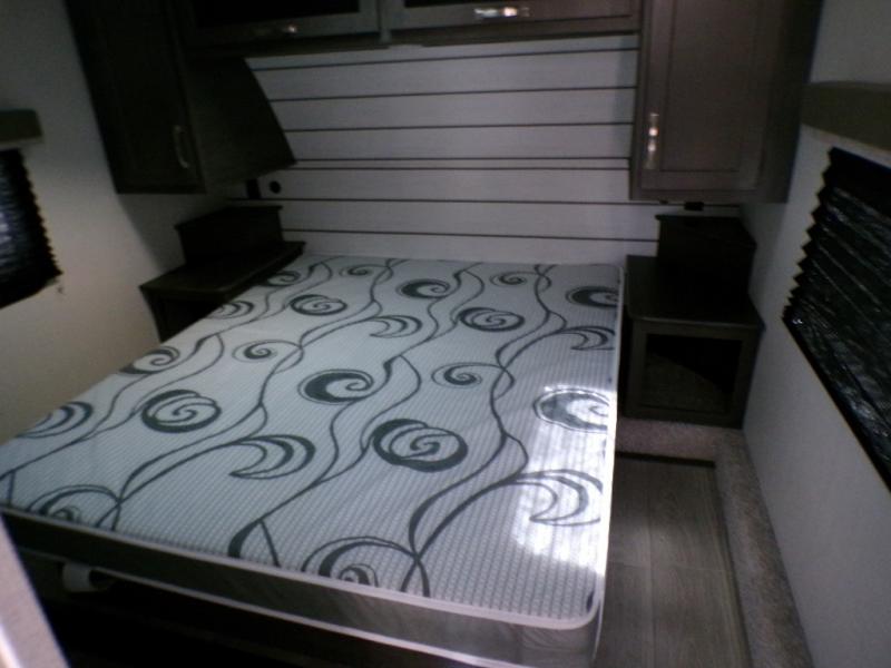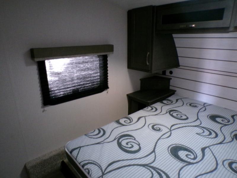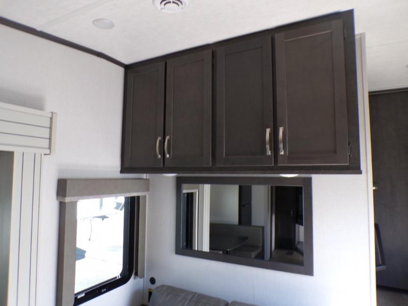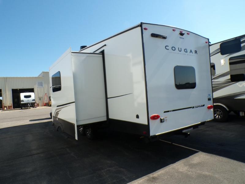 The Cougar Sport structural I-beam frame with stamped steel cross-members and outriggers, plus its laminated sidewalls with five-sided aluminum superstructure and Alpha Super Flex roof membrane are what active RVers love about the construction of the Cougar line. The Cougar Sport models are no exception when it comes to a great package, as well as being smaller and lighter weight than their big brother Cougar models. A one-piece, heated and enclosed polypropylene underbelly means a longer camping season. On the inside, residential shaker style hardwood cabinet doors and decorative crown molding, plus seamless pressed countertops and an on-demand water heater will make your unit feel even more like home. You are also sure to appreciate the shiplap style decorative accent wall behind the bed, a porcelain foot flush toilet in the bathroom, plus residential kitchen hardware, and so much more.