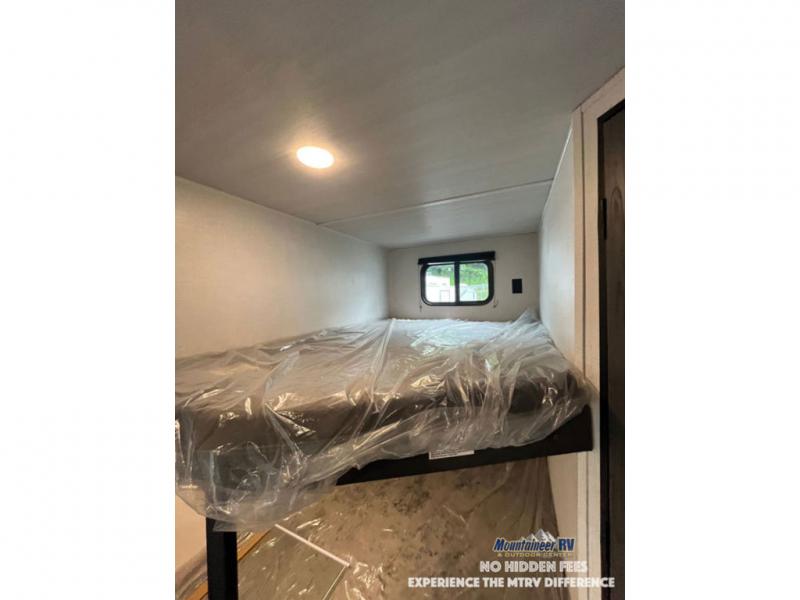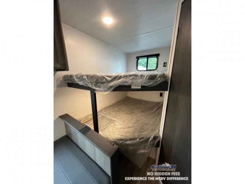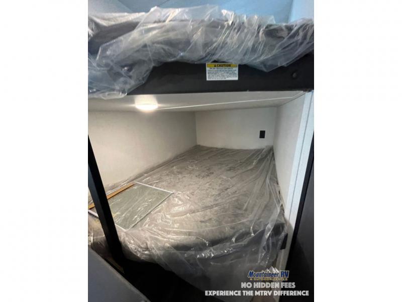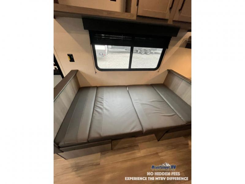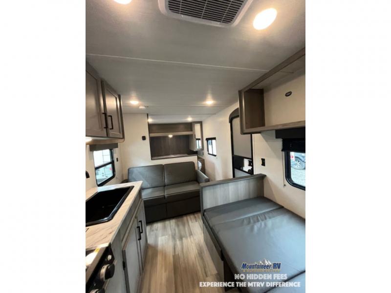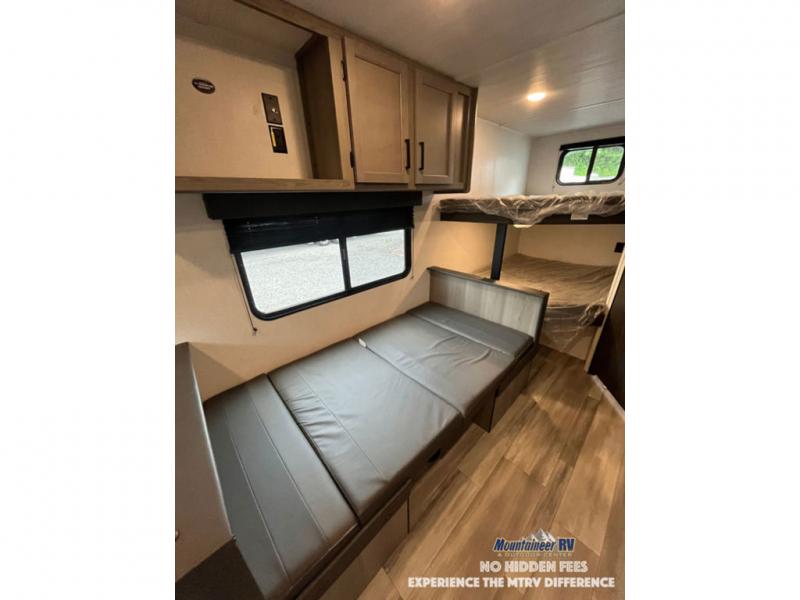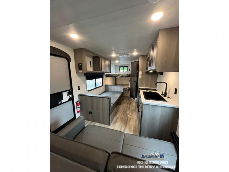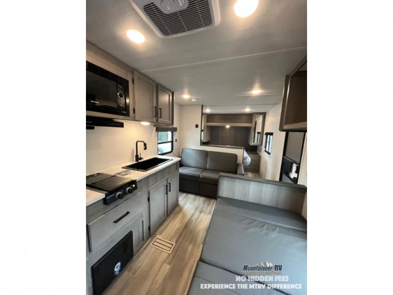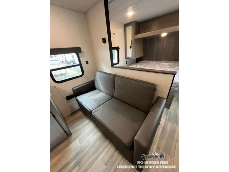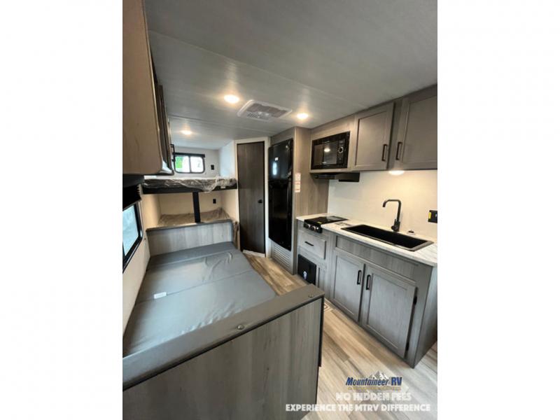If you're looking for a travel trailer with a little more sleeping space, look no further than this unit! There are double-size bunks with inside and outside storage, a walk-around queen bed in the front bedroom, plus a sofa and booth dinette for even more sleeping space. The kitchen comes with a cooktop to cook meals on, a sink for clean up, and a 10 cu. ft. 12V refrigerator to store the milk and eggs. You will also find TV prep in this model if you enjoy movie nights while at the campground.