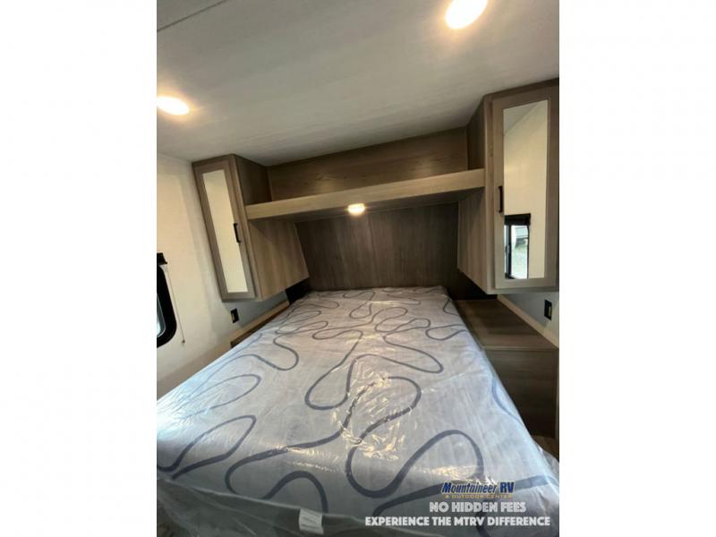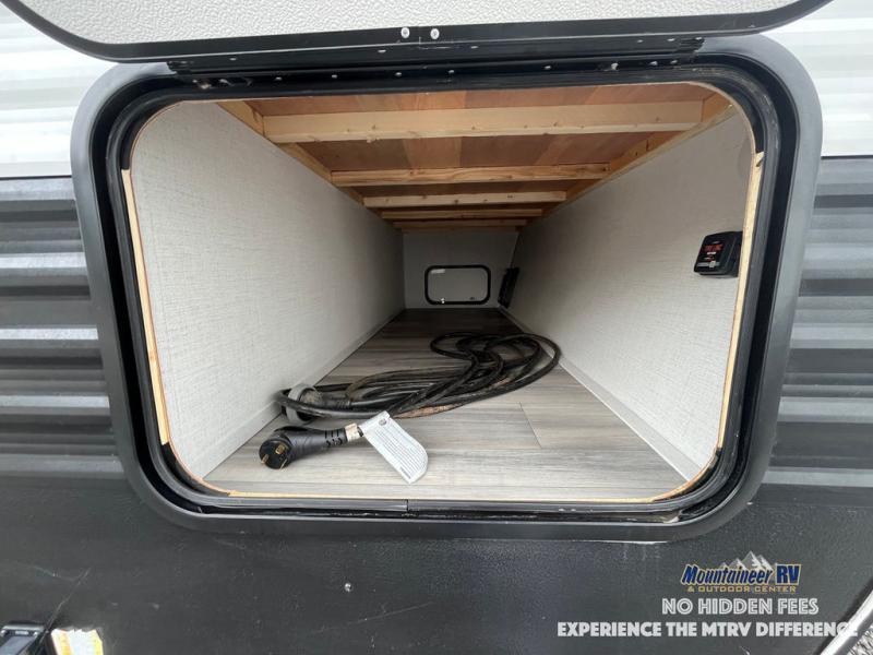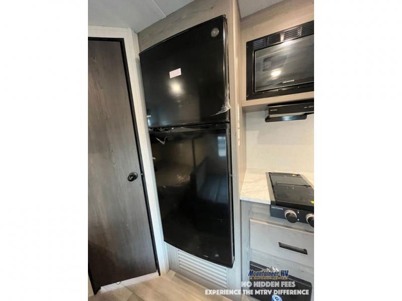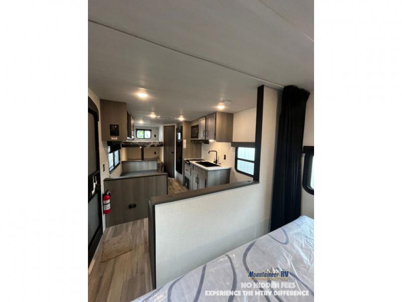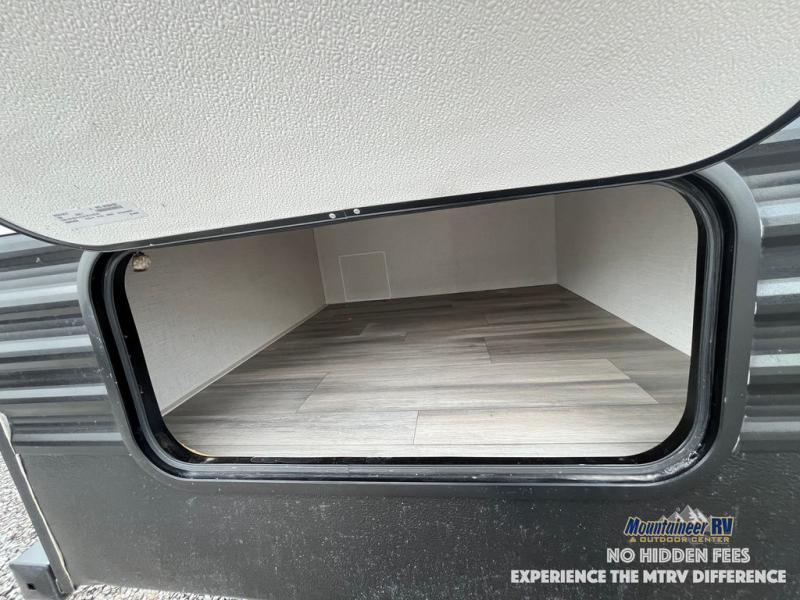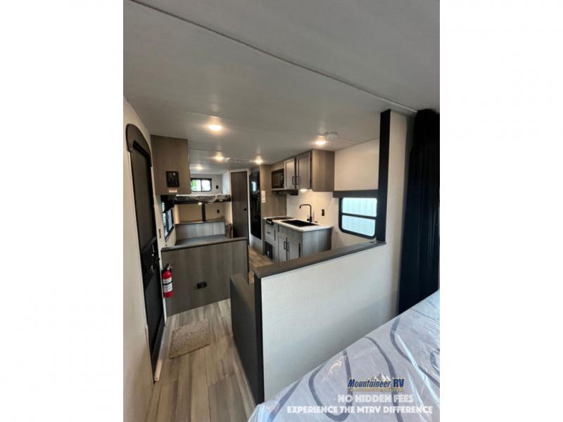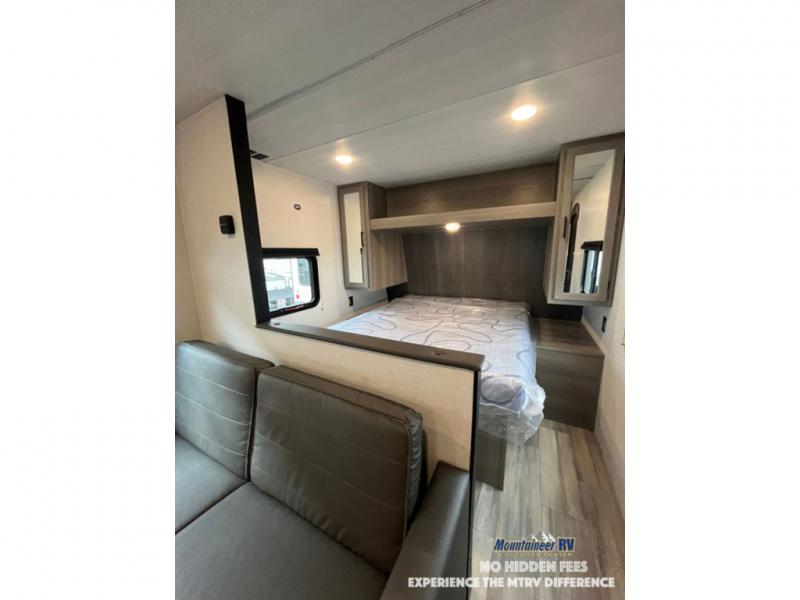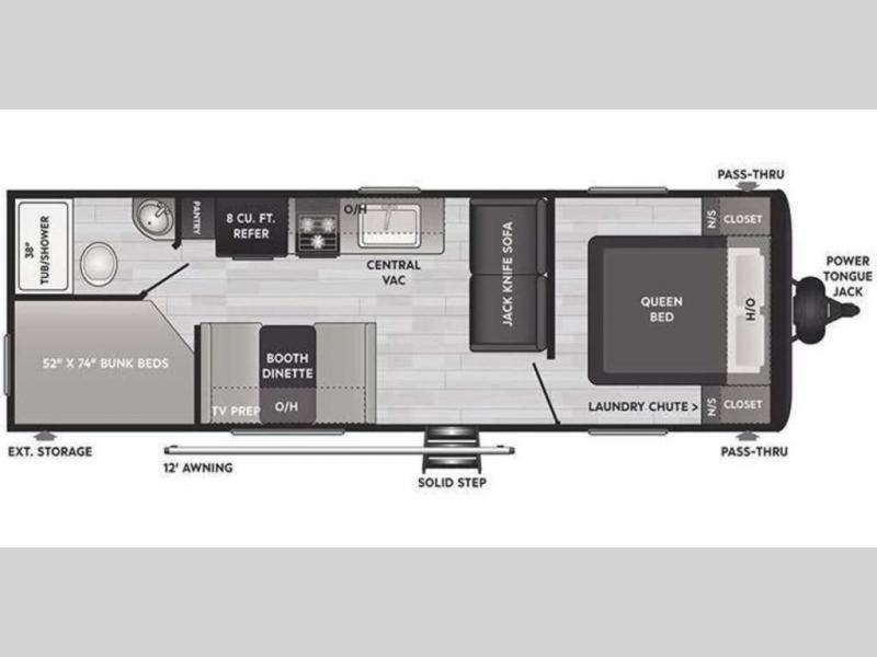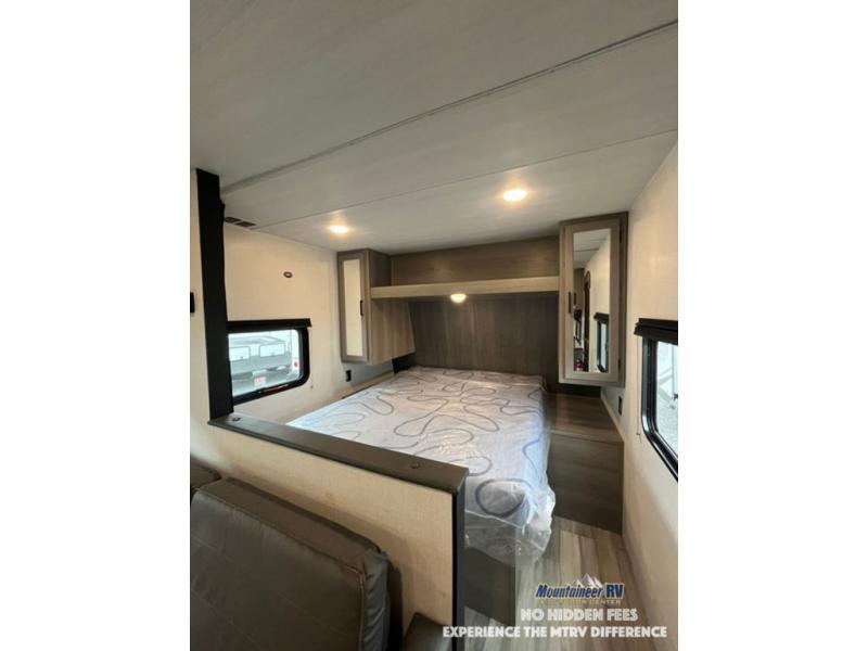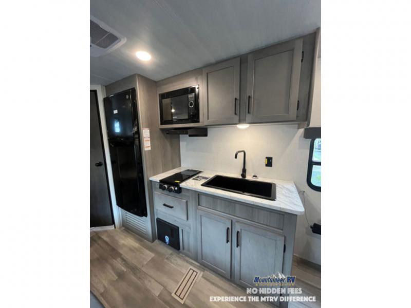 If you're looking for a travel trailer with a little more sleeping space, look no further than this unit! There are double-size bunks with inside and outside storage, a walk-around queen bed in the front bedroom, plus a sofa and booth dinette for even more sleeping space. The kitchen comes with a cooktop to cook meals on, a sink for clean up, and a 10 cu. ft. 12V refrigerator to store the milk and eggs. You will also find TV prep in this model if you enjoy movie nights while at the campground.