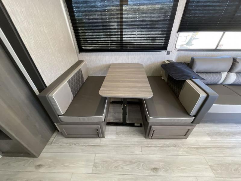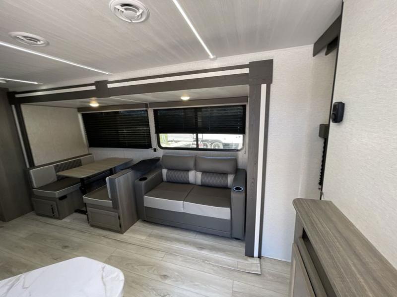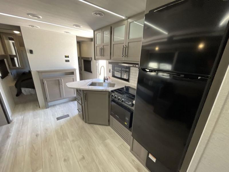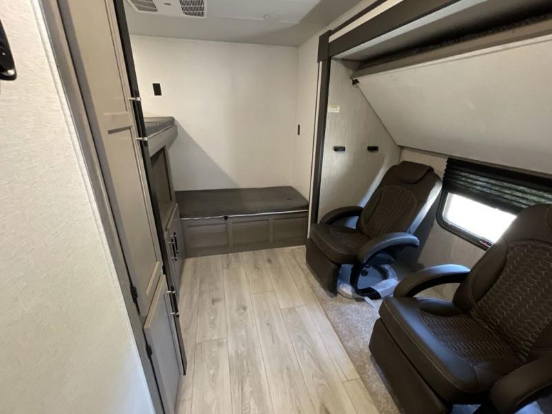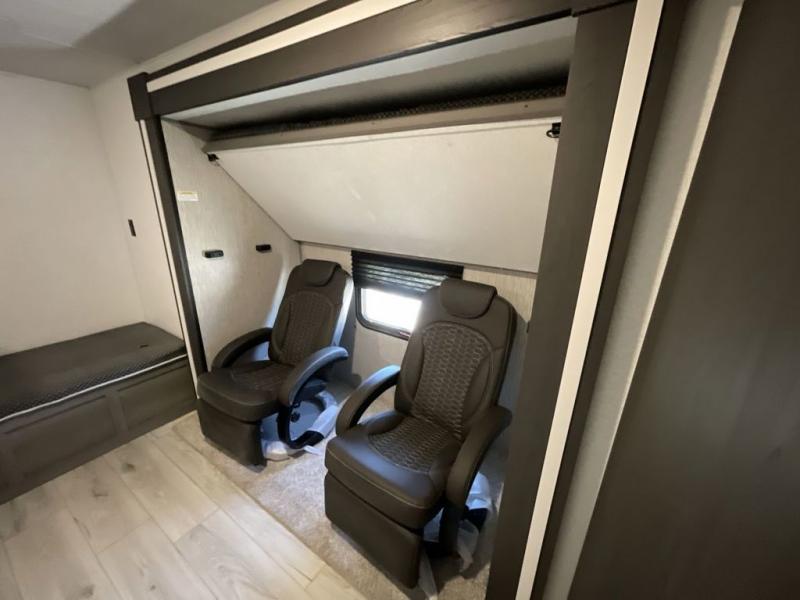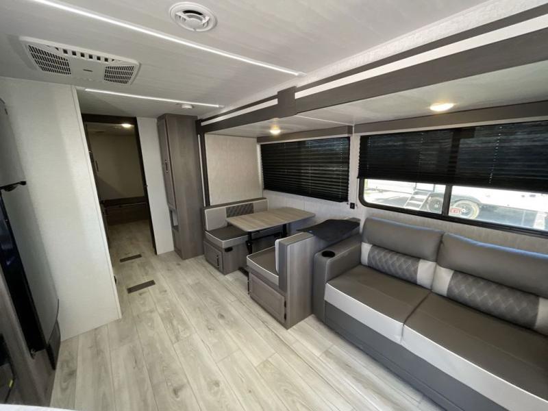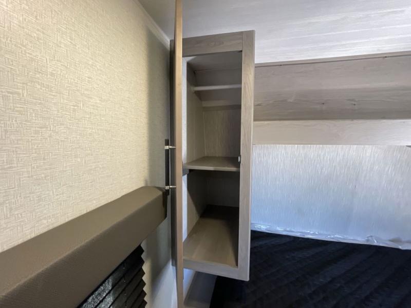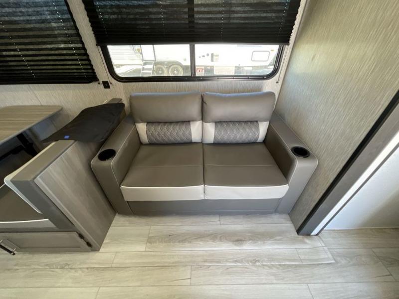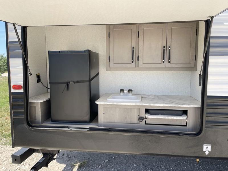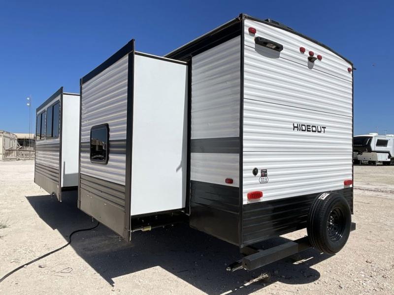You will be quite impressed by the large private bunkhouse on this Hideout travel trailer! This bunkhouse has a slide out for more space, two bunks, a flip-up bunk, plus a toy chest to keep everything tidy. Now your kids can play all day and store their toys when it's time for bed. The full bathroom is located right next to the bunkhouse for easy access at night, and the bathroom also contains the second exterior entry door. The main living area is full of great features as well with a large slide, a standard sofa, and a booth dinette. And you can choose the optional tri-fold sofa or optional theater seating in place of the standard sofa, depending on your needs.