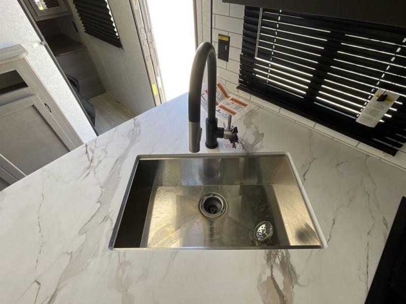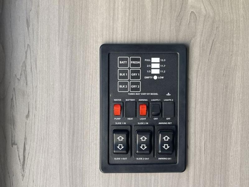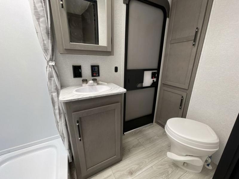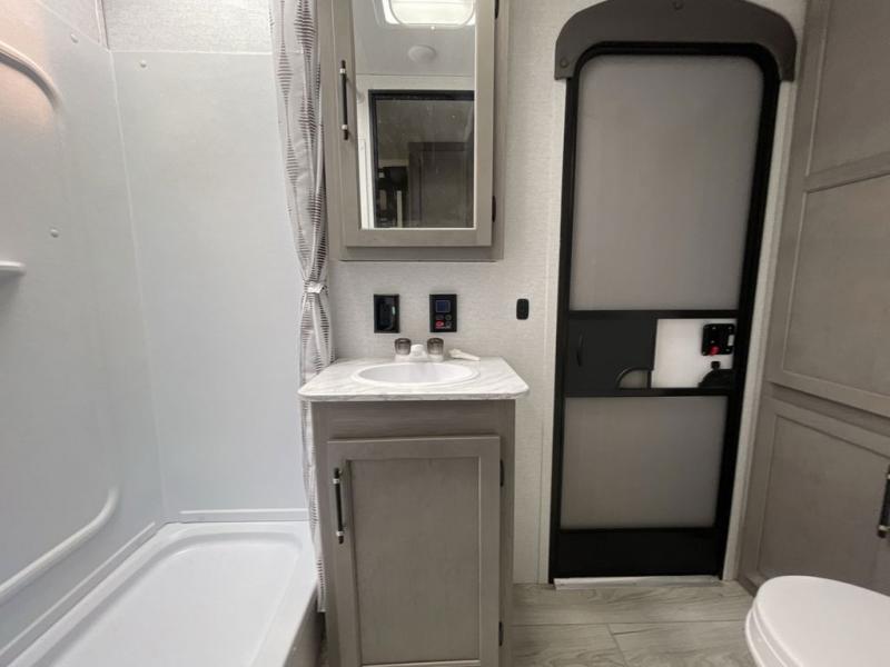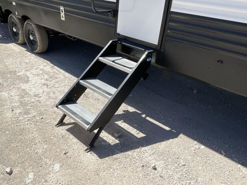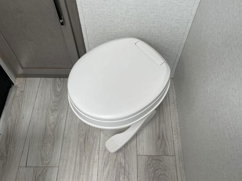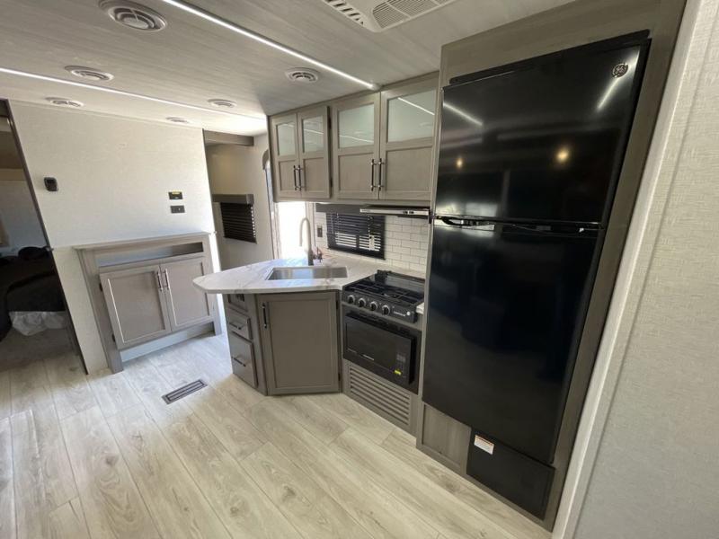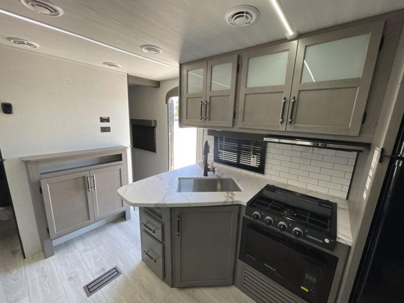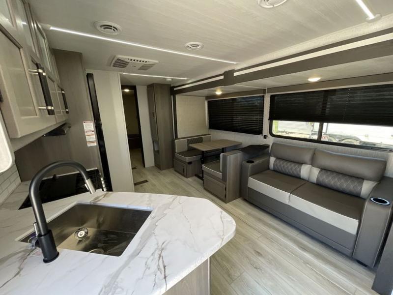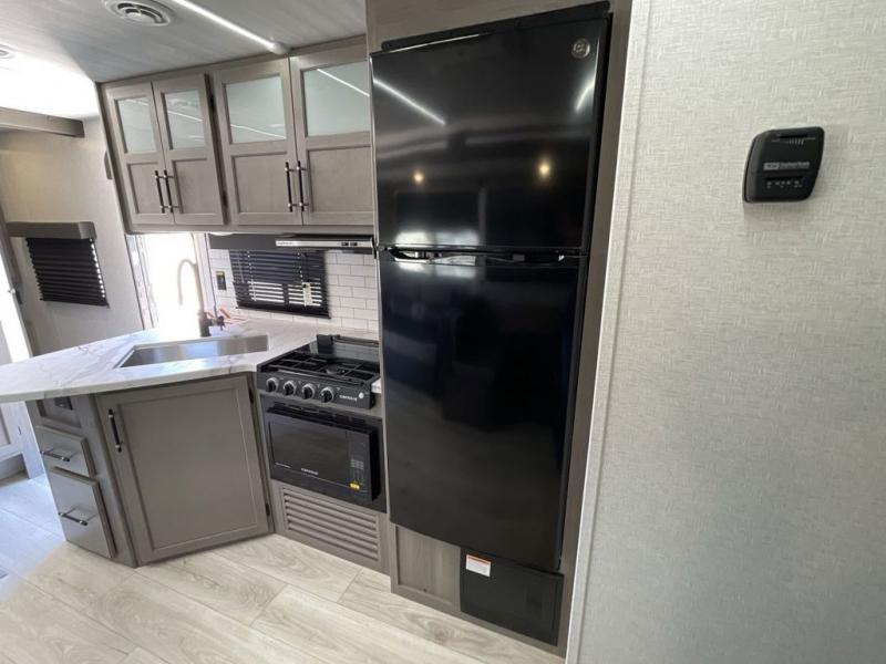 You will be quite impressed by the large private bunkhouse on this Hideout travel trailer! This bunkhouse has a slide out for more space, two bunks, a flip-up bunk, plus a toy chest to keep everything tidy. Now your kids can play all day and store their toys when it's time for bed. The full bathroom is located right next to the bunkhouse for easy access at night, and the bathroom also contains the second exterior entry door. The main living area is full of great features as well with a large slide, a standard sofa, and a booth dinette. And you can choose the optional tri-fold sofa or optional theater seating in place of the standard sofa, depending on your needs.