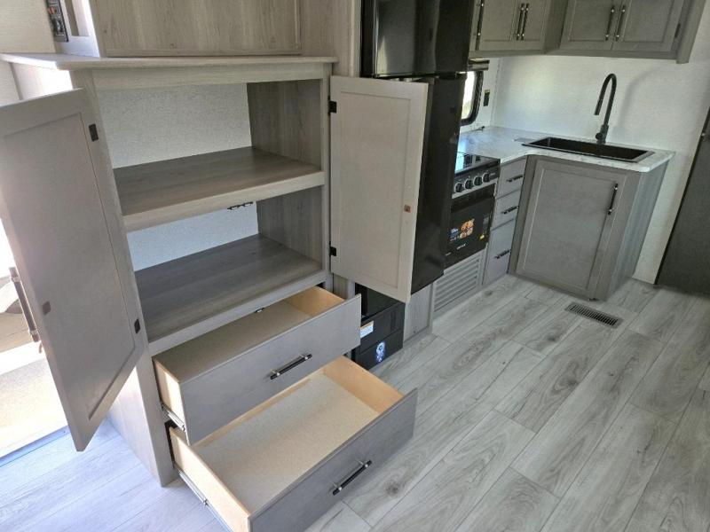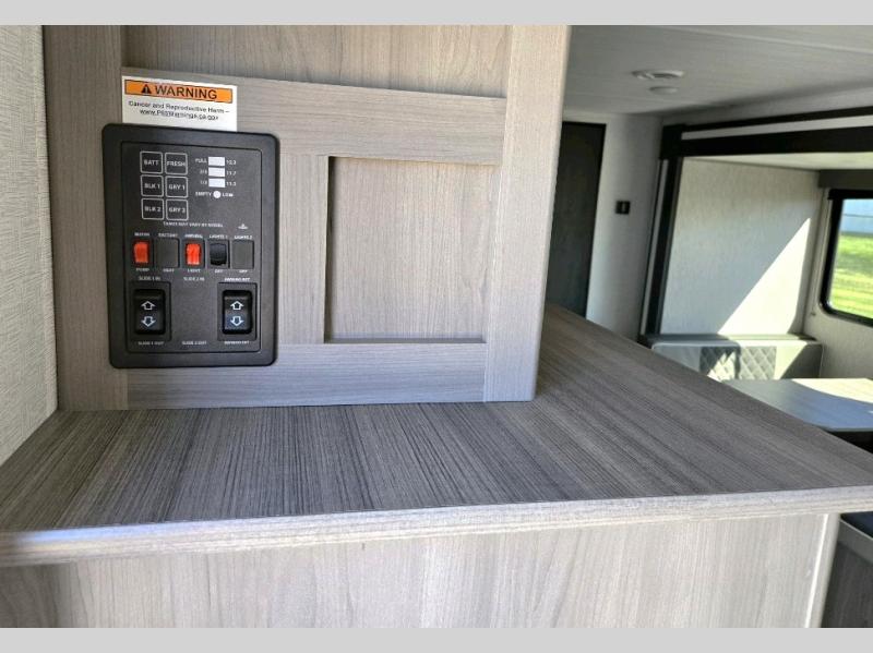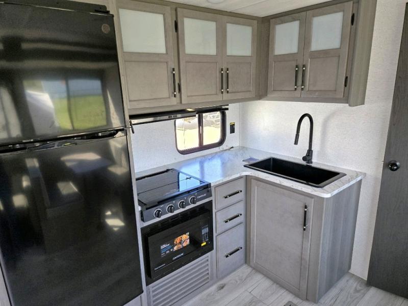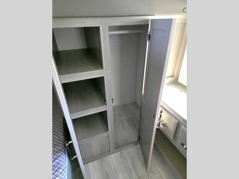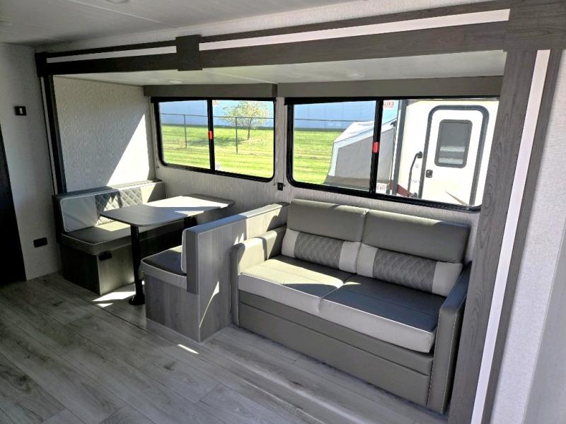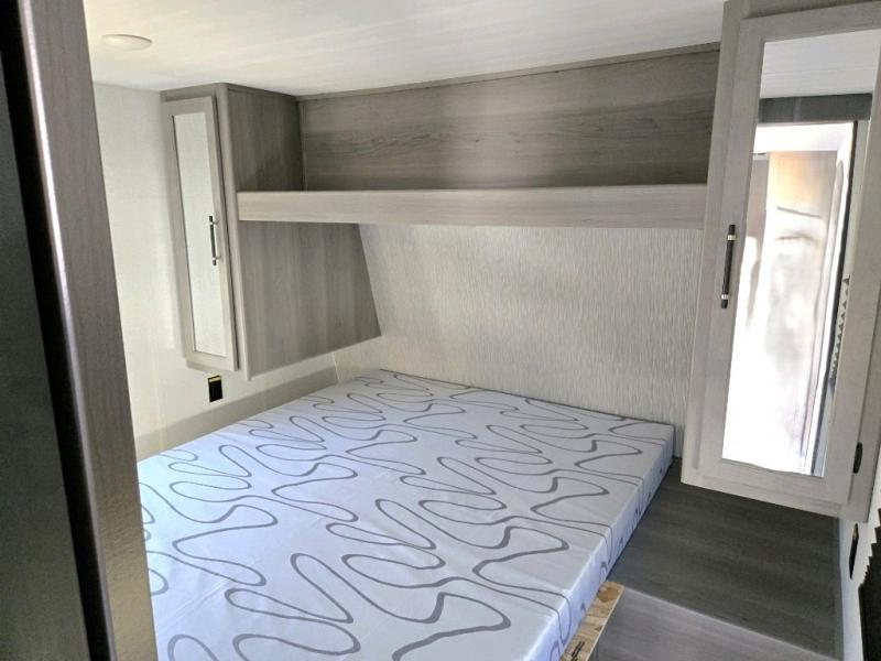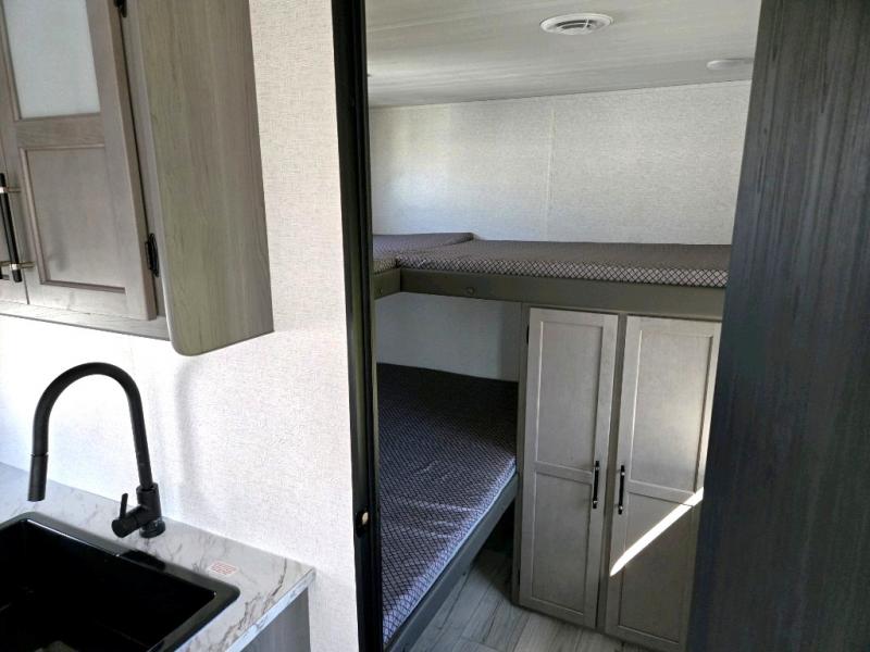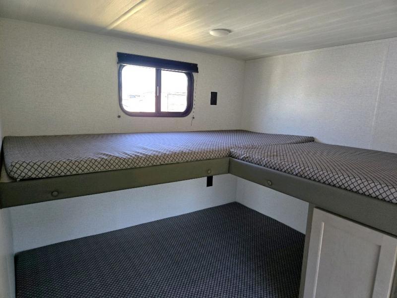 If you enjoy camping with extra friends and family, this travel trailer will be perfect for you! There is a rear bunkhouse with triple bunks, a dresser, plus a closet, making this room perfect for guests. Up front you'll find the private bedroom with a queen bed, dual nightstands and dual closets for your things, and the full bath is close by for convenience. The chef of your group will have a cooktop to prepare meals, ample counter space, plus a pantry for dry goods and snacks. Your crew can play a game at the booth dinette or relax on the sofa while dinner is being made, or they can relax outdoors under the 16' power awning!