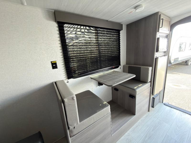 This lightweight travel trailer will be easy to tow and even easier to love! There is a unique rear entry door, a front queen bed, plus a full bath onboard so you don't have to use the camp's facilities. The two burner cooktop and 12V refrigerator will let you cook and store food, and the booth dinette provides dining and sleeping space for a guest. If the weather is nice, you may just want to head outdoors to sit under the 10' power awning!