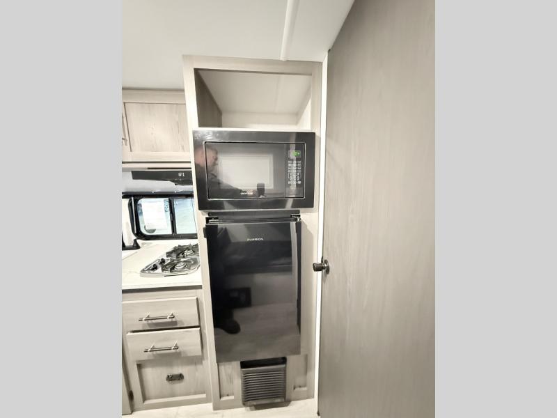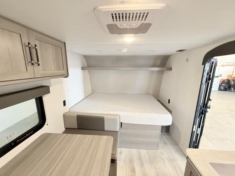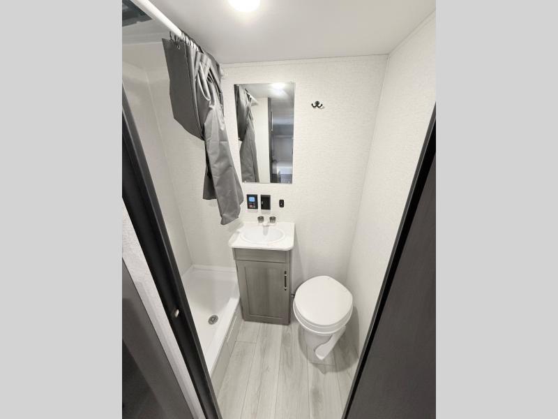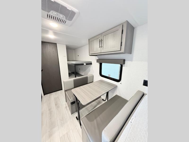 This trailer will fit perfectly for a group of five or less thanks to all the sleeping space! The owners will have a queen-size bed, and others can choose between the rear corner bunk beds or the booth dinette once set up for bedtime. There is a full bathroom for convenience when changing and getting cleaned up, a galley kitchen with a two burner cooktop plus a 3.3 cu. ft. refrigerator for the cold items. And you can stow your larger camping items in the exterior pass-through compartment.