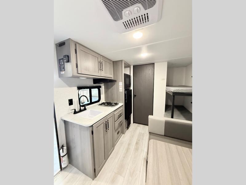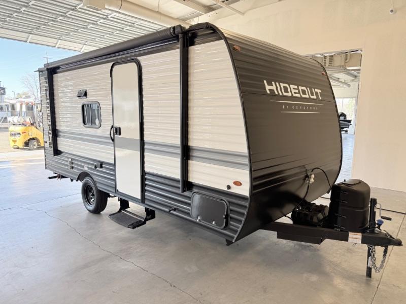 Open your horizons with the Hideout Sport Single Axle travel trailers by Keystone. They are compact, convenient, and lightweight; everything you're looking for in an RV! Each model features an aluminum exterior, tinted safety glass windows, and a Super Flex TPO roof membrane for added durability. The interior includes blackout night shades for added privacy and solid wood doors and drawers that will give a more at-home touch. The Girard tankless water heater is a feature you won't want to camp without, and the LED lighting will keep your space bright and open!