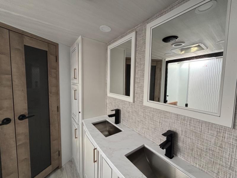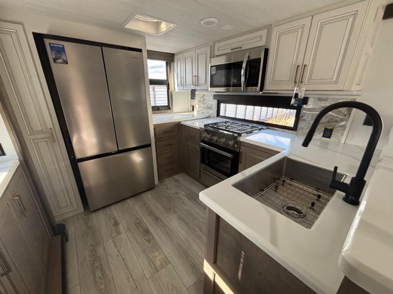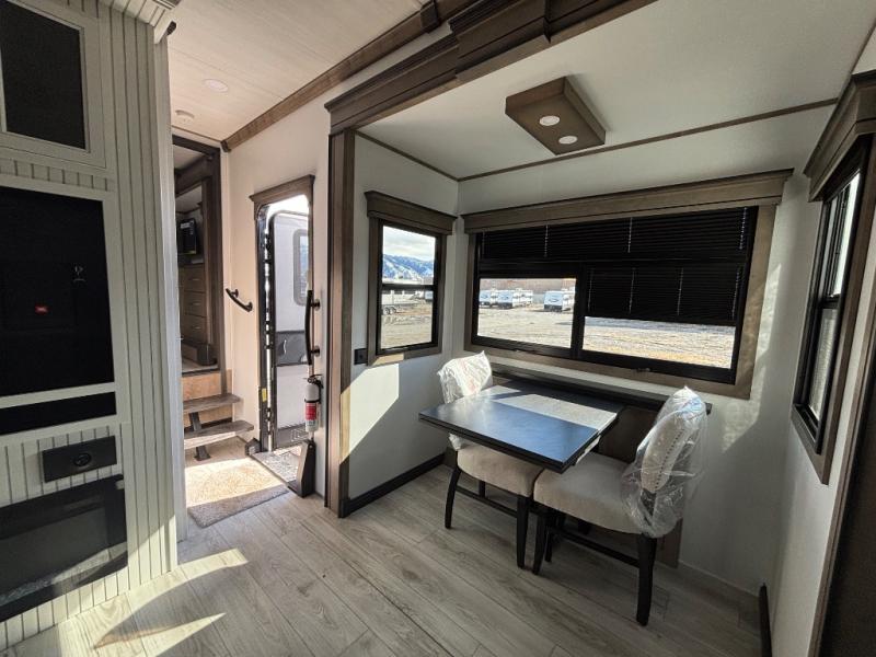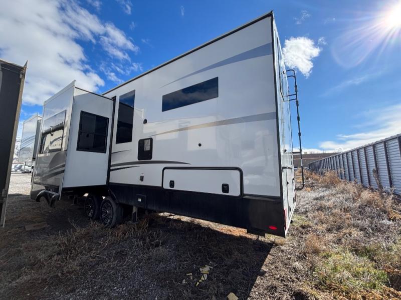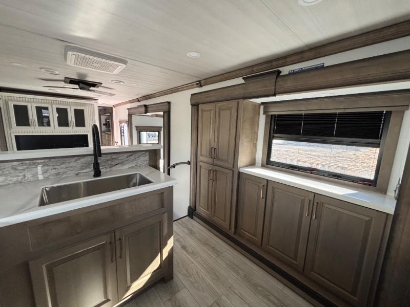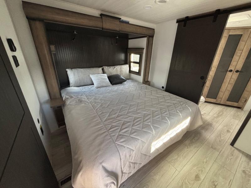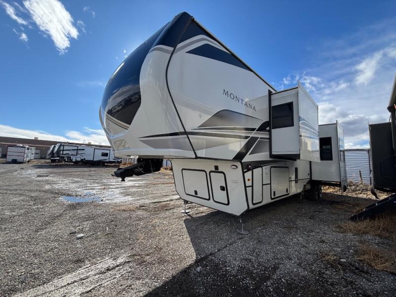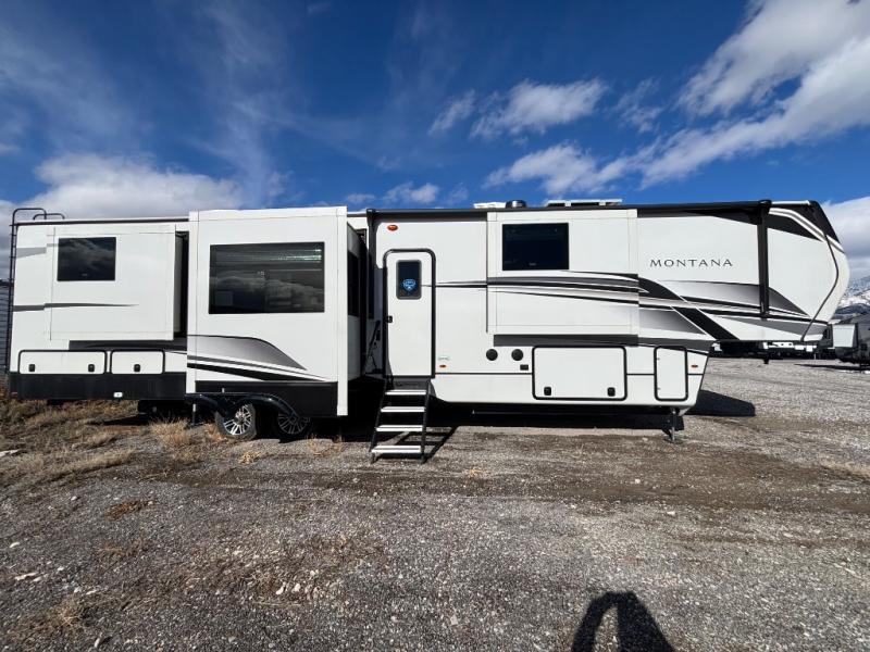 The perfect RV when you like to take "home"' with you when you travel! This Montana fifth wheel gives you the space you want and it feels like home with plenty of features to love and keep you comfortable when you are out enjoying your adventures. Five slides in total give each space plenty of room, the raised rear kitchen has everything you need to cook up meals and snacks just like at home. An 18 cu. ft. residential refrigerator with an ice maker, convection microwave oven and large sink, plus pantry space will make any chef happy. The mid-coach space just inside the door features a living room and half bath for convenience. There is also a dinette with storage within the roadside slide. Step up in front through a sliding barn door to a double slide space with a king bed and dresser. A second sliding barn door leads into the front spacious master bath featuring dual sinks, a 48" x 30" shower, and a large walk-in wardrobe with washer and dryer prep!