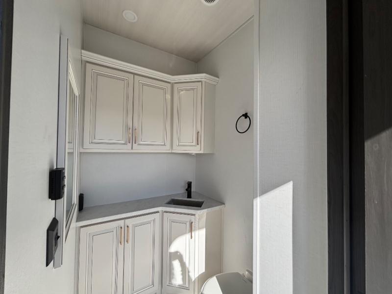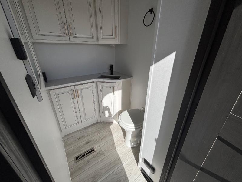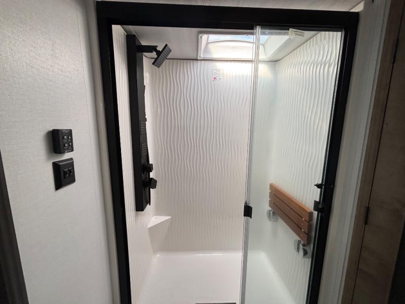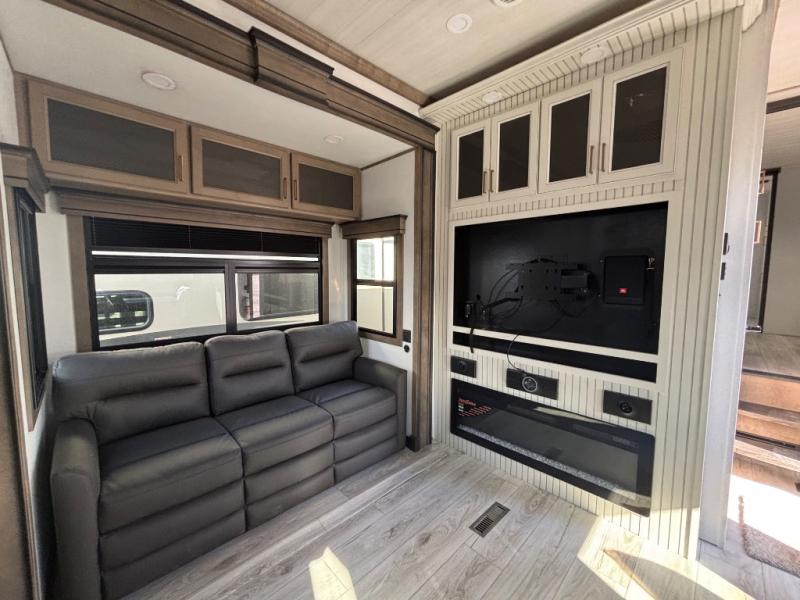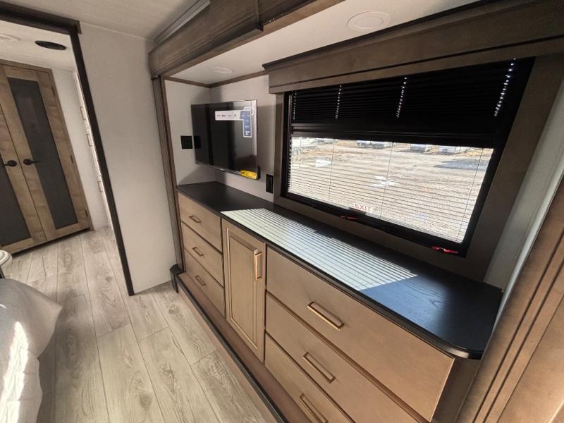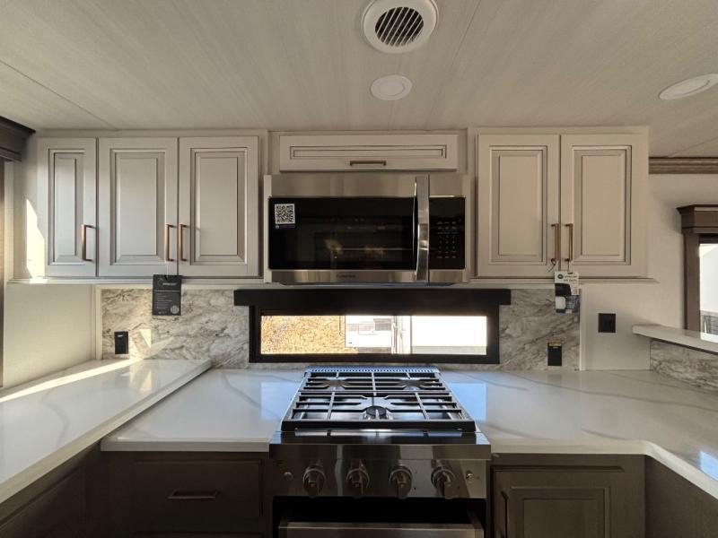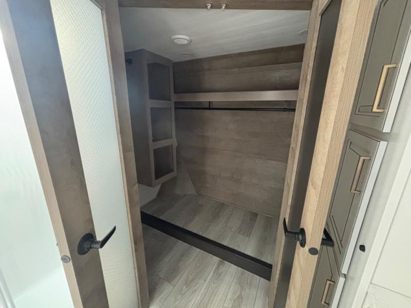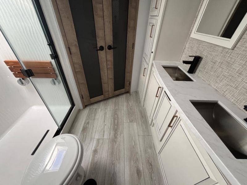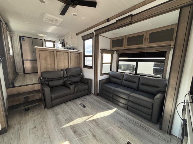 The perfect RV when you like to take "home"' with you when you travel! This Montana fifth wheel gives you the space you want and it feels like home with plenty of features to love and keep you comfortable when you are out enjoying your adventures. Five slides in total give each space plenty of room, the raised rear kitchen has everything you need to cook up meals and snacks just like at home. An 18 cu. ft. residential refrigerator with an ice maker, convection microwave oven and large sink, plus pantry space will make any chef happy. The mid-coach space just inside the door features a living room and half bath for convenience. There is also a dinette with storage within the roadside slide. Step up in front through a sliding barn door to a double slide space with a king bed and dresser. A second sliding barn door leads into the front spacious master bath featuring dual sinks, a 48" x 30" shower, and a large walk-in wardrobe with washer and dryer prep!