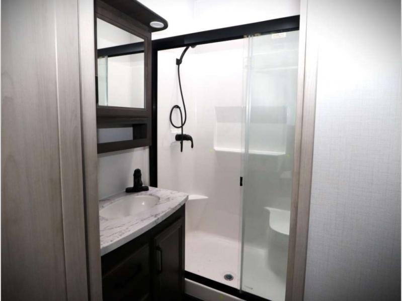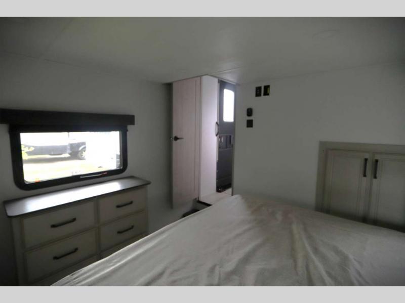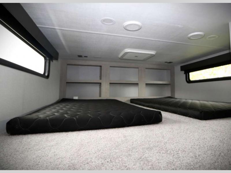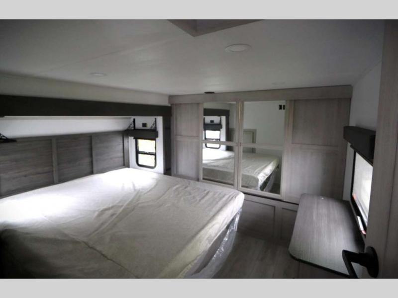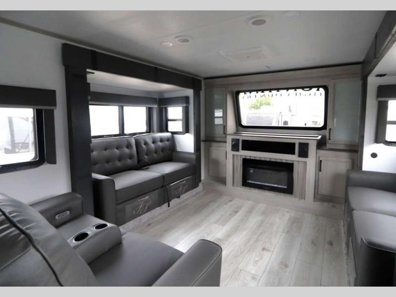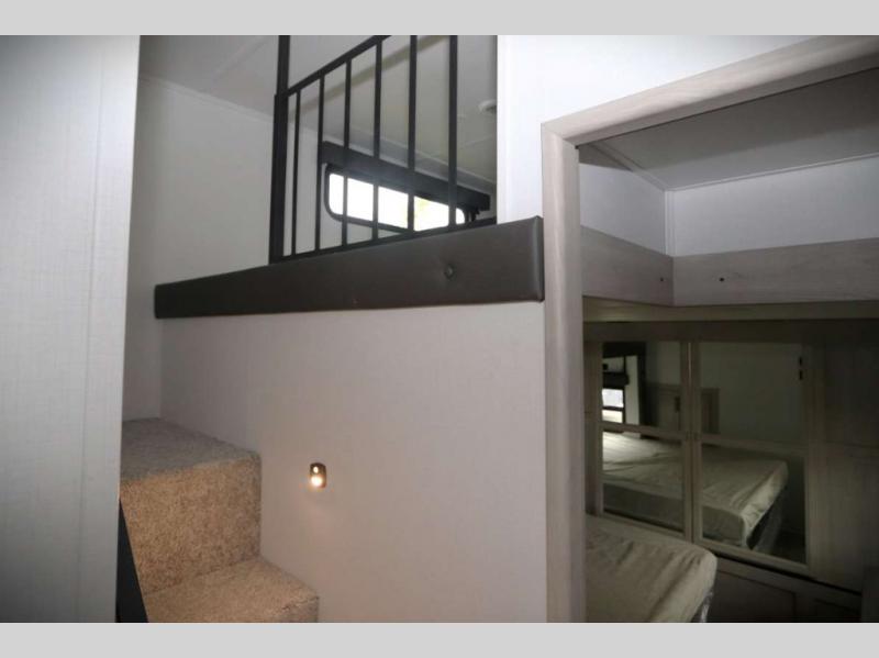 Include all of your favorite people on your next adventure in this Montana High Country fifth wheel! Not only is there a rear private bedroom with a king-size bed for you, but there is also a loft above with stairs that take you to the bunk mats. Now your kids will have their own space too. You can even host a few other travelers up front in the separate living room on the two hide-a-bed sofas. This area will be perfect for cozy sleeping because of the fireplace, and you can even watch a movie as you drift off to sleep because of the 50" LCD TV too. The full bathroom has a pivot-hinge door and a 48" x 30" shower with seat, and the kitchen has a breakfast bar that you can sit at to eat your cereal each morning