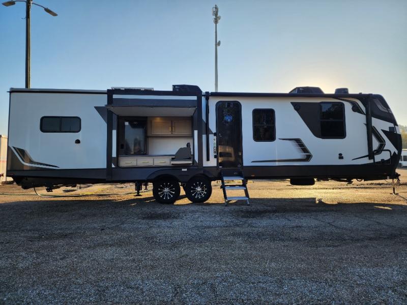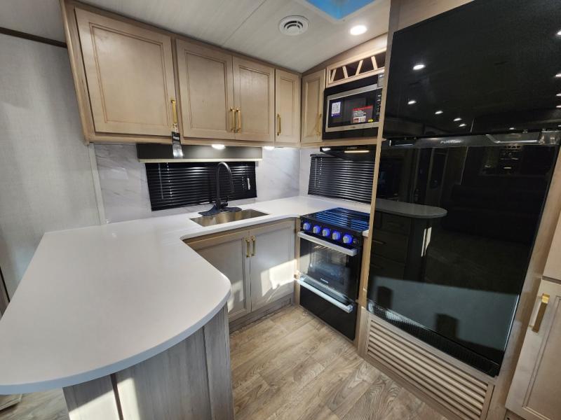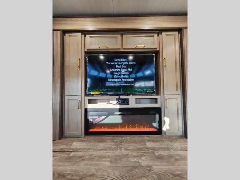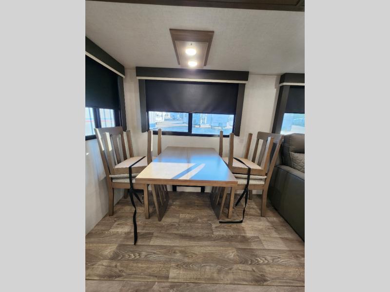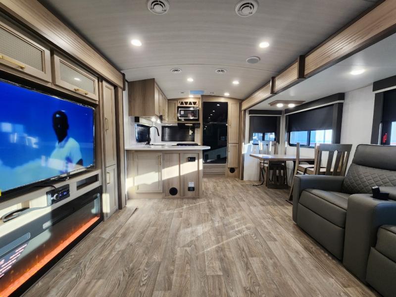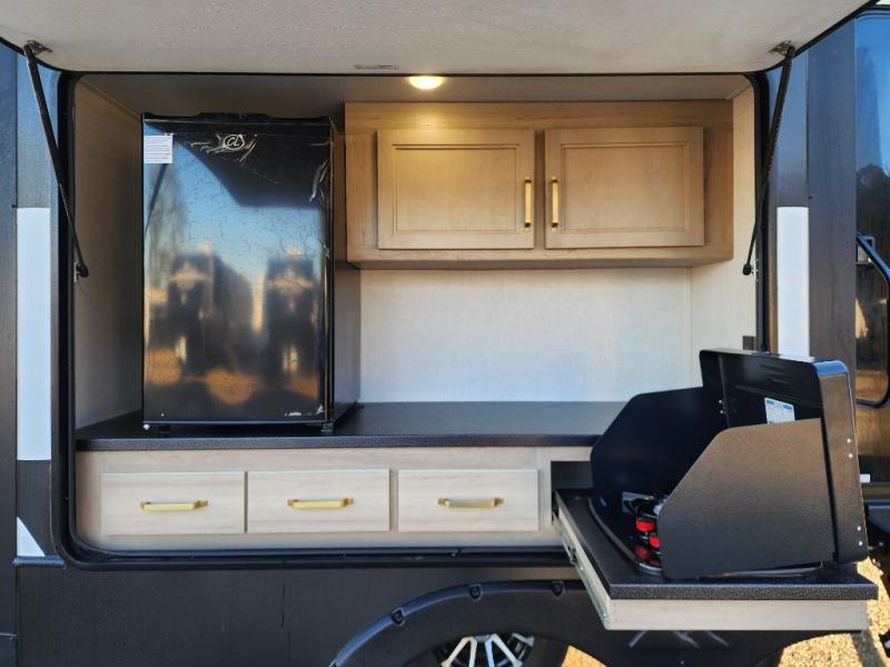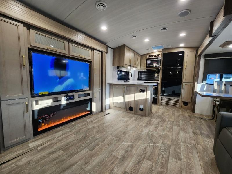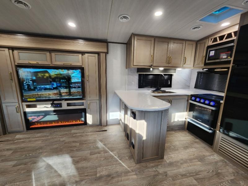 Get ready for fun in the great outdoors with this travel trailer at your favorite campsite! You can hike, visit with other RVers, and enjoy a spacious middle living area and rear kitchen to relax in after making a meal. There is a sleeper sofa and theater seating as well as a booth dinette or choose the table and chairs option if you prefer that type of seating. The 50" TV provides inside entertainment and the fireplace is cozy and inviting. The kitchen offers a U-shaped counter for more prep space, full kitchen amenities including a 10 cu. ft. refrigerator and a pantry for all your food. The cook will have the choice of making meals using the outside kitchen that offers a flip-out stove and outside refrigerator to hold more beverages. There is a double entry bathroom for convenience, a king bed slide for extra floor space in the front bedroom, and lots of clothing storage. There is even washer/dryer prep that will give you the option to add these appliances!