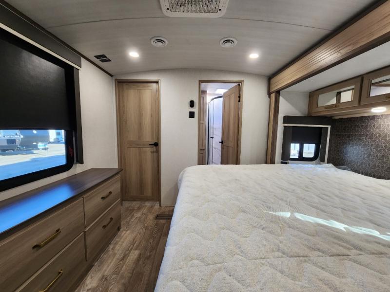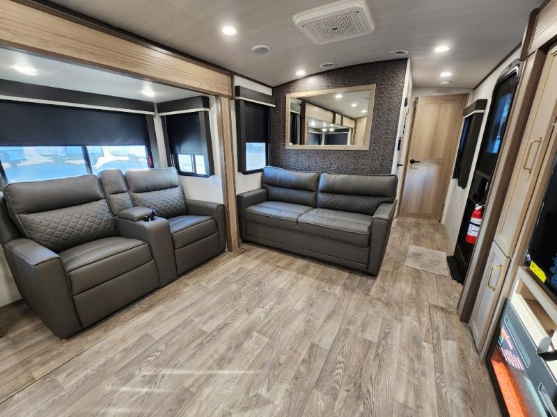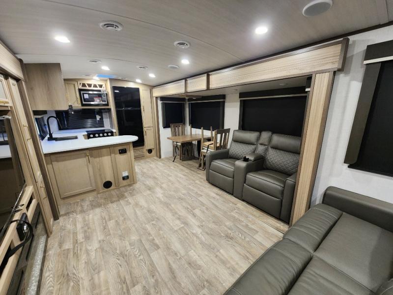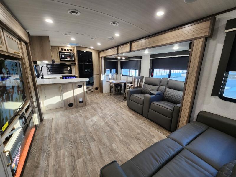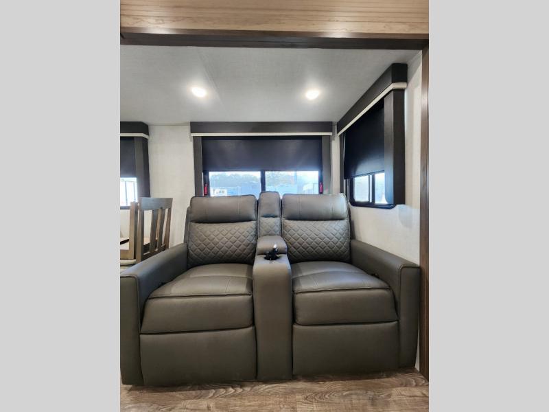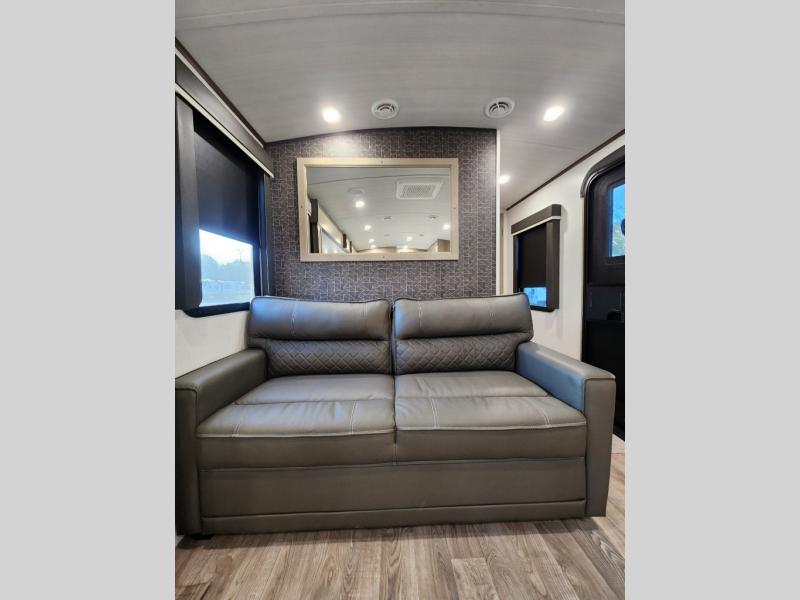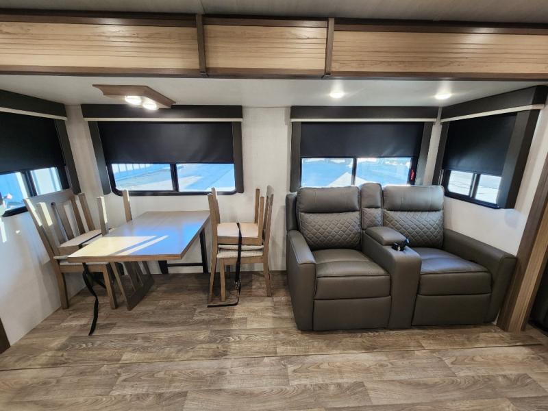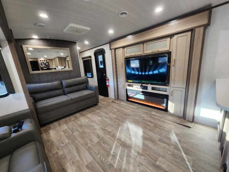 Get ready for fun in the great outdoors with this travel trailer at your favorite campsite! You can hike, visit with other RVers, and enjoy a spacious middle living area and rear kitchen to relax in after making a meal. There is a sleeper sofa and theater seating as well as a booth dinette or choose the table and chairs option if you prefer that type of seating. The 50" TV provides inside entertainment and the fireplace is cozy and inviting. The kitchen offers a U-shaped counter for more prep space, full kitchen amenities including a 10 cu. ft. refrigerator and a pantry for all your food. The cook will have the choice of making meals using the outside kitchen that offers a flip-out stove and outside refrigerator to hold more beverages. There is a double entry bathroom for convenience, a king bed slide for extra floor space in the front bedroom, and lots of clothing storage. There is even washer/dryer prep that will give you the option to add these appliances!