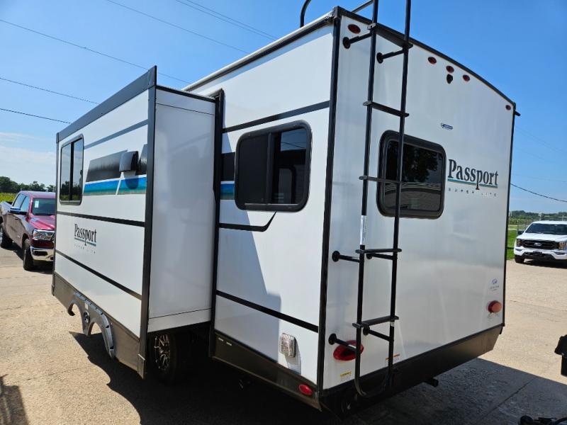 You can take many different kinds of trips with this Passport SL travel trailer! Once you get to the campsite and set up the 19' awning, you can remove your travel gear from the exterior pass-through storage to create your own little retreat. On the interior, the front private bedroom provides you with a queen-size bed, nightstands, and bedside wardrobes so that you can easily get changed every morning and night. The large slide out in the main living area will add to the amount of living space on the interior without adding to the overall width of the trailer. As the night comes to a close, you can heat up a bag of popcorn in the microwave before sitting down in the tri-fold sofa sleeper which could be switched out for the optional theater seating.