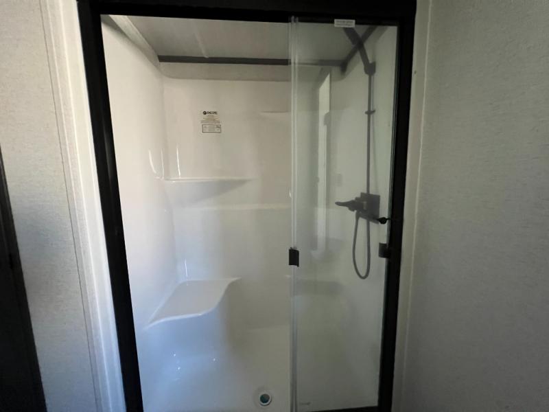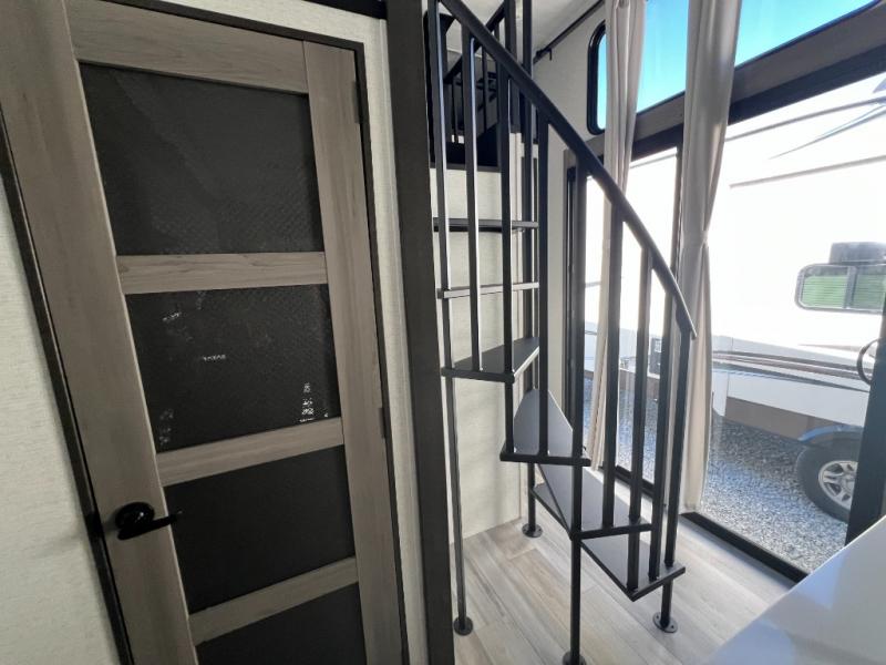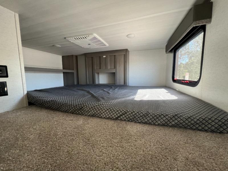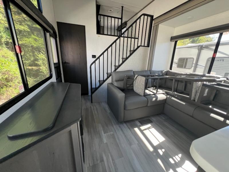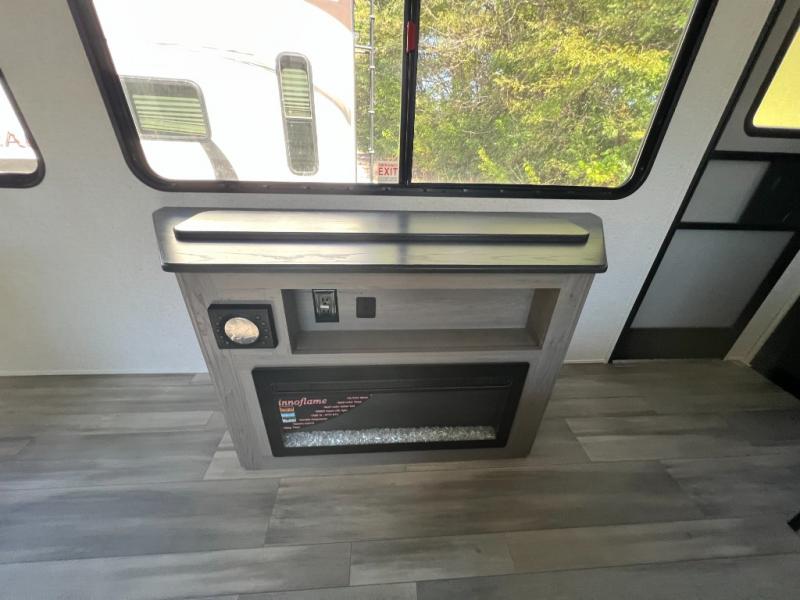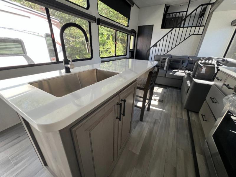 This destination trailer is so accommodating, you may just want to camp all year long! The owners will have the front bedroom all to themselves with a king bed slide out, dresser, and master closet so everything has a place. Above this room is the front loft with stairs that includes three 39" x 74" beds/sleeping spaces and storage shelves, making it perfect for little ones! The spacious full rear bath includes dual bath sinks, a large shower with a seat, and a closet with washer/dryer prep if you want to add these appliances. And just outside the bath, you'll find the second set of stairs that leads to the rear loft with a 54" x 81" bed, an entertainment center, and storage shelves for your guests. During the day, everyone can meet in the combined living area and kitchen that features a large slide for more space, a sectional sofa, a kitchen island with four barstools, plus an entertainment center with a fireplace!
