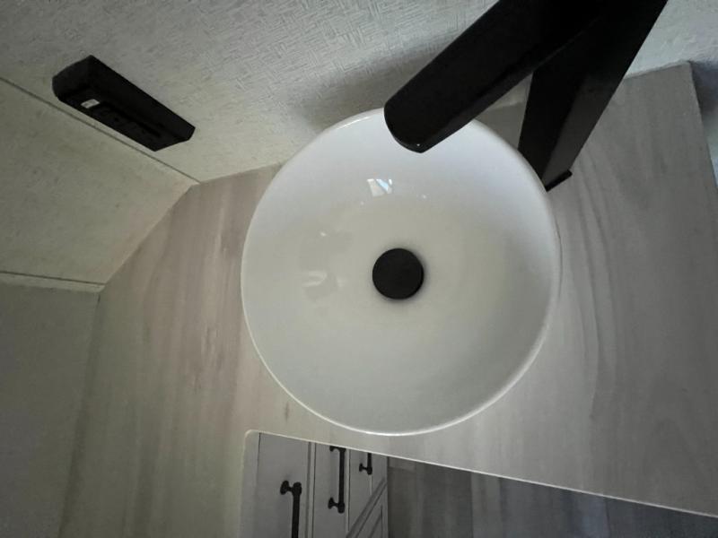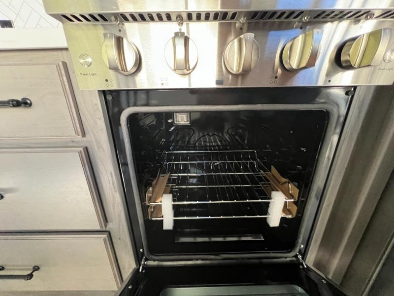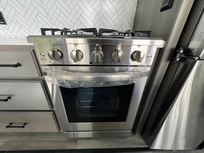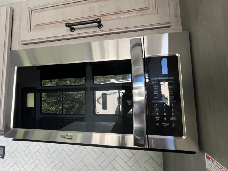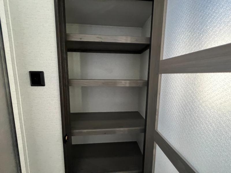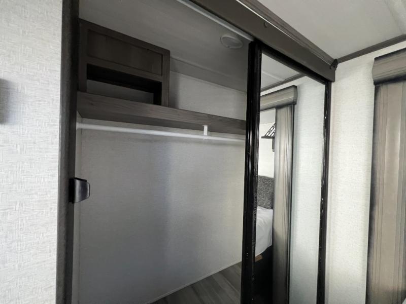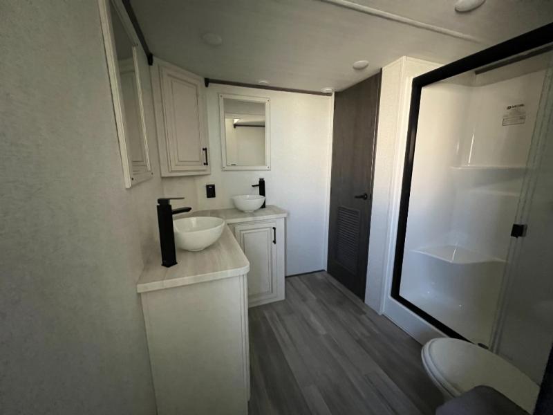 This destination trailer is so accommodating, you may just want to camp all year long! The owners will have the front bedroom all to themselves with a king bed slide out, dresser, and master closet so everything has a place. Above this room is the front loft with stairs that includes three 39" x 74" beds/sleeping spaces and storage shelves, making it perfect for little ones! The spacious full rear bath includes dual bath sinks, a large shower with a seat, and a closet with washer/dryer prep if you want to add these appliances. And just outside the bath, you'll find the second set of stairs that leads to the rear loft with a 54" x 81" bed, an entertainment center, and storage shelves for your guests. During the day, everyone can meet in the combined living area and kitchen that features a large slide for more space, a sectional sofa, a kitchen island with four barstools, plus an entertainment center with a fireplace!