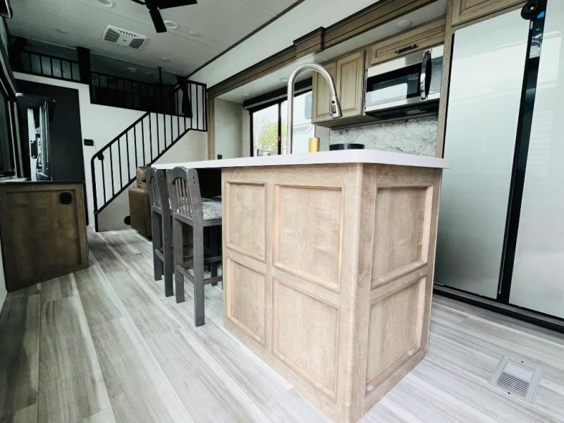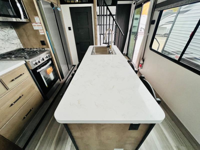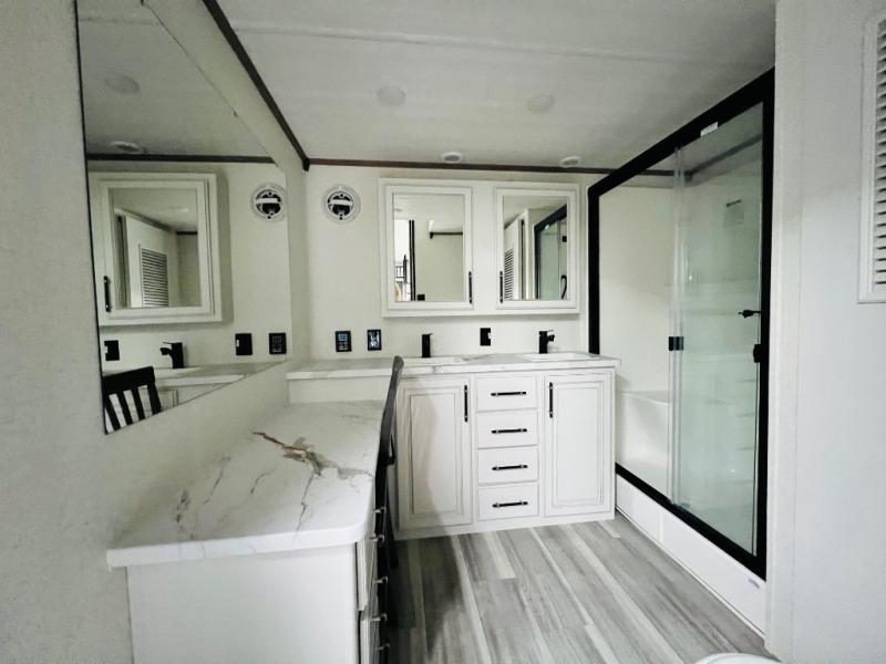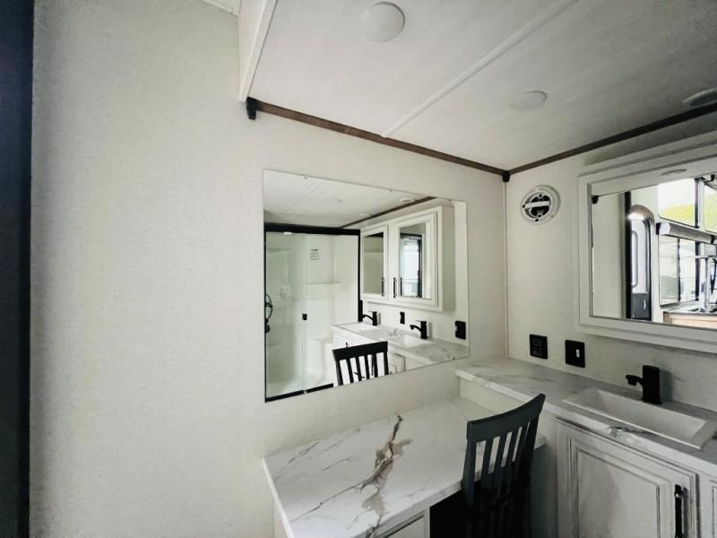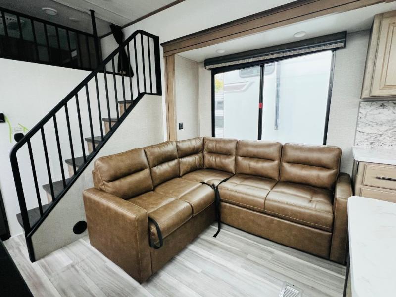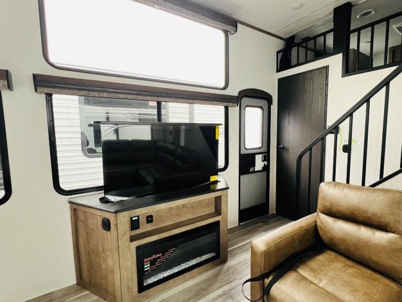 This destination trailer is a home away from home where comfort, relaxation, and entertainment come together in perfect harmony. The rear bathroom is a serene oasis, featuring washer and dryer prep, dual sink, and makeup vanity. Above, the loft area offers a cozy bunk mat, storage shelves, and an entertainment center - perfect for kids or guests. The living area is designed for relaxation and entertainment, featuring a comfortable sectional sofa, entertainment center, and warm fireplace. The kitchen is a gourmet's paradise, boasting a refrigerator, pantry, three-burner cooktop, kitchen island with chairs, and spacious pantry. The front bedroom is a peaceful retreat, complete with a half bath, overhead cabinets, a king bed, a wardrobe, and a dresser. Above, the loft area offers three bunk mats - perfect for kids or guests. Outside, enjoy the shade and protection of our 26' awning and convenient access via two entry/exit doors.