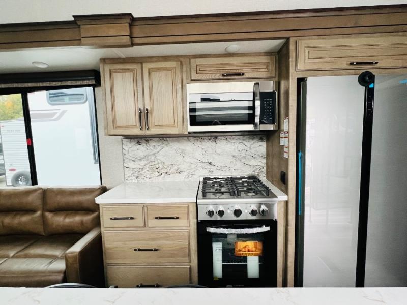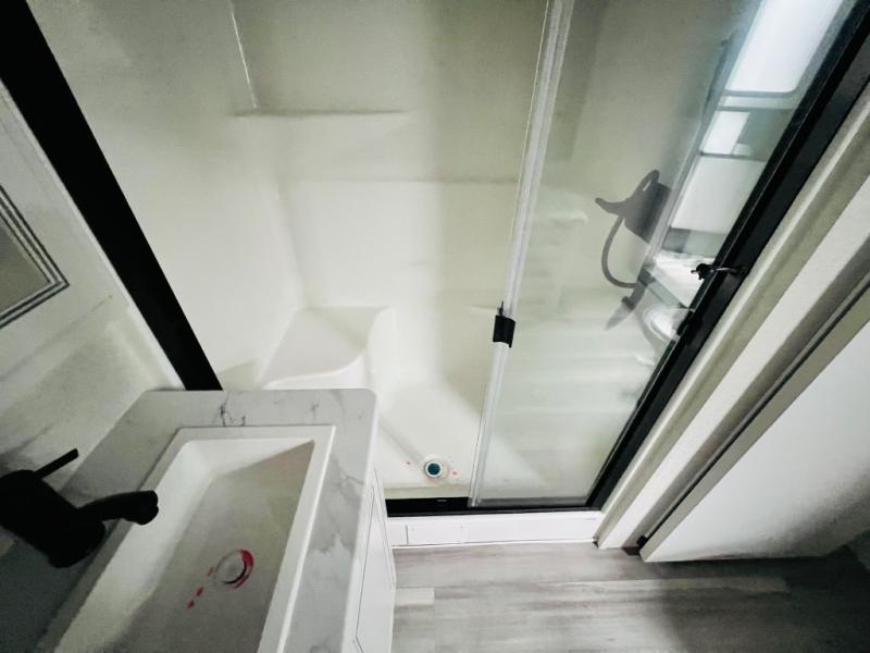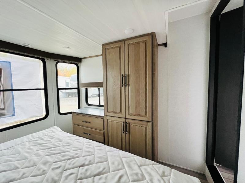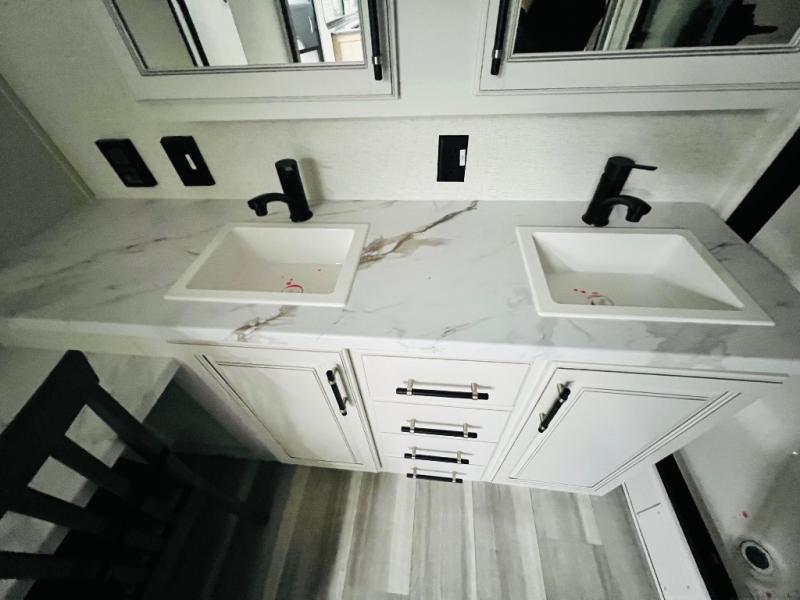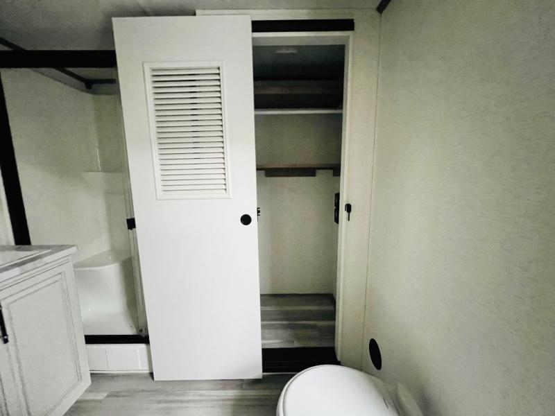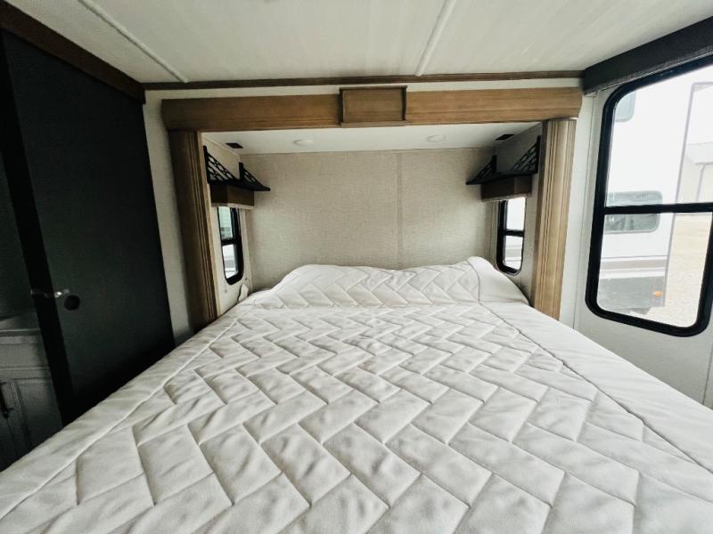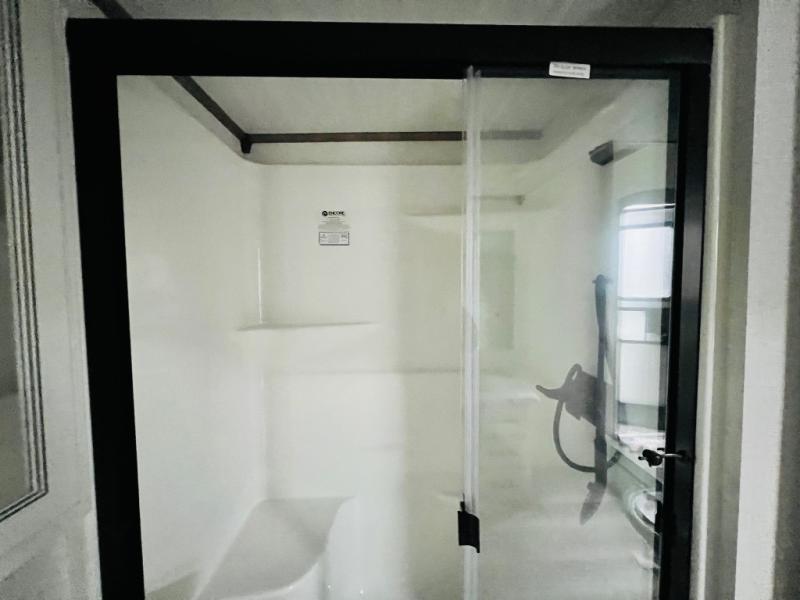 This destination trailer is a home away from home where comfort, relaxation, and entertainment come together in perfect harmony. The rear bathroom is a serene oasis, featuring washer and dryer prep, dual sink, and makeup vanity. Above, the loft area offers a cozy bunk mat, storage shelves, and an entertainment center - perfect for kids or guests. The living area is designed for relaxation and entertainment, featuring a comfortable sectional sofa, entertainment center, and warm fireplace. The kitchen is a gourmet's paradise, boasting a refrigerator, pantry, three-burner cooktop, kitchen island with chairs, and spacious pantry. The front bedroom is a peaceful retreat, complete with a half bath, overhead cabinets, a king bed, a wardrobe, and a dresser. Above, the loft area offers three bunk mats - perfect for kids or guests. Outside, enjoy the shade and protection of our 26' awning and convenient access via two entry/exit doors.