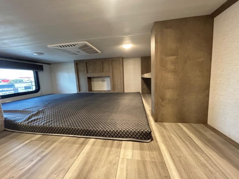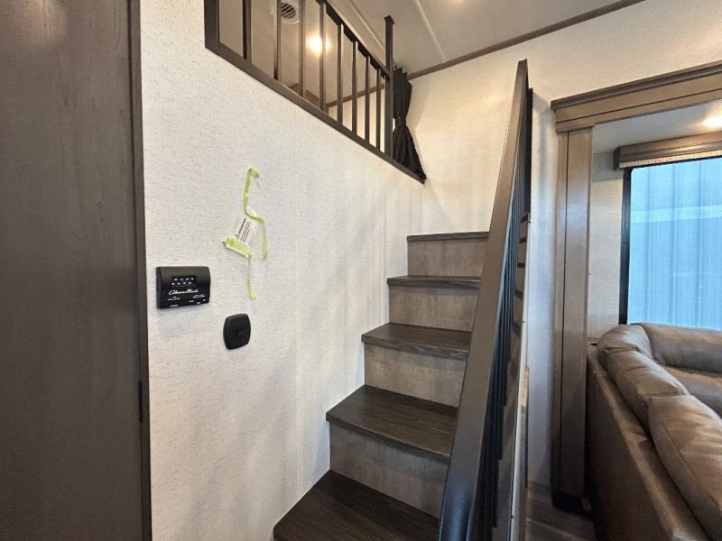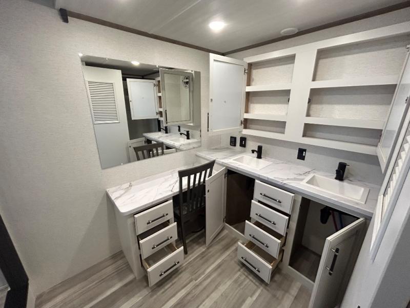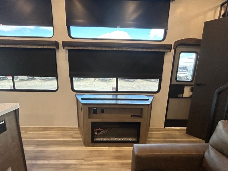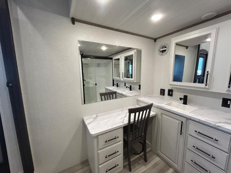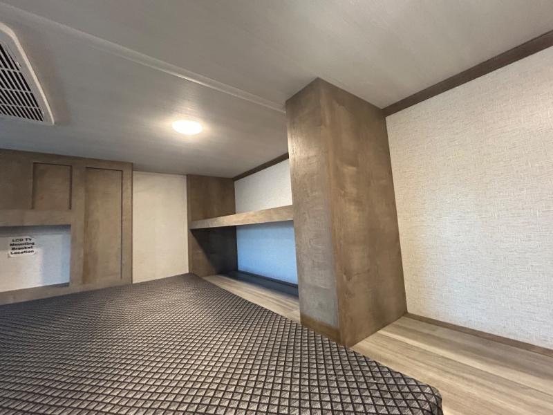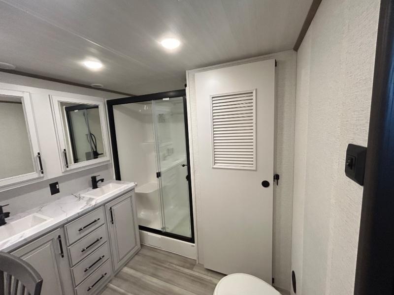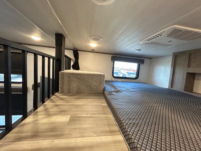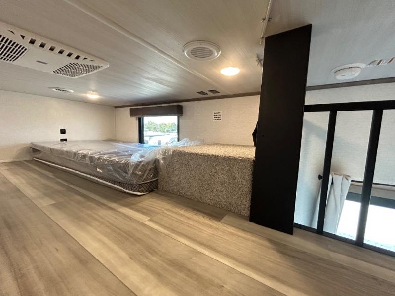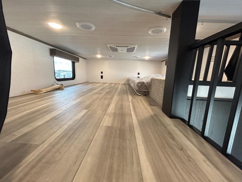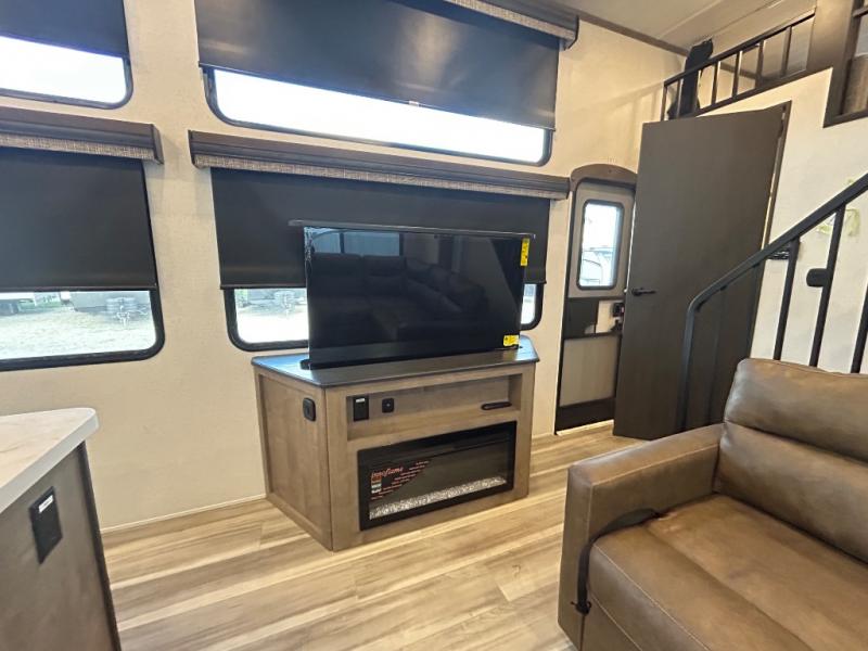This destination trailer is a home away from home where comfort, relaxation, and entertainment come together in perfect harmony. The rear bathroom is a serene oasis, featuring washer and dryer prep, dual sink, and makeup vanity. Above, the loft area offers a cozy bunk mat, storage shelves, and an entertainment center - perfect for kids or guests. The living area is designed for relaxation and entertainment, featuring a comfortable sectional sofa, entertainment center, and warm fireplace. The kitchen is a gourmet's paradise, boasting a refrigerator, pantry, three-burner cooktop, kitchen island with chairs, and spacious pantry. The front bedroom is a peaceful retreat, complete with a half bath, overhead cabinets, a king bed, a wardrobe, and a dresser. Above, the loft area offers three bunk mats - perfect for kids or guests. Outside, enjoy the shade and protection of our 26' awning and convenient access via two entry/exit doors.