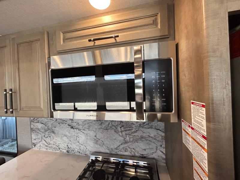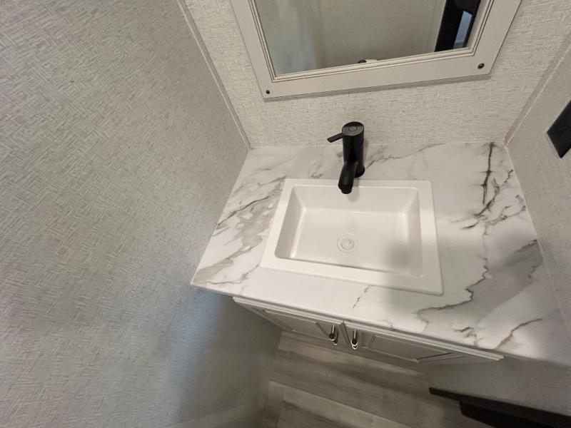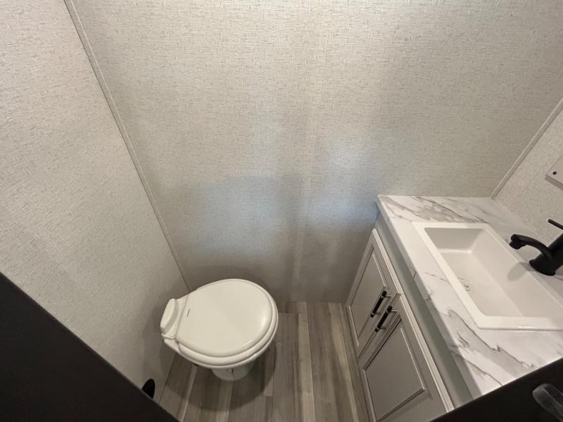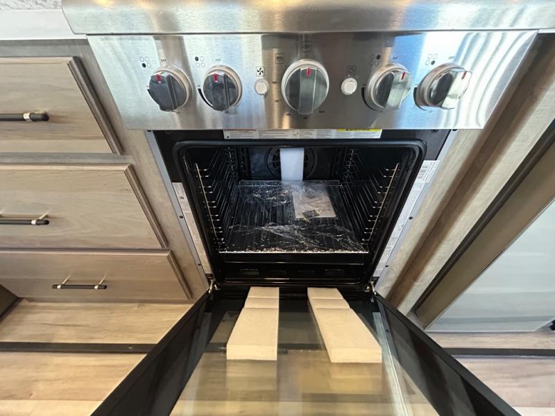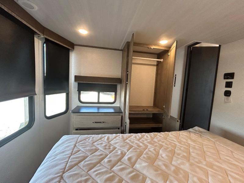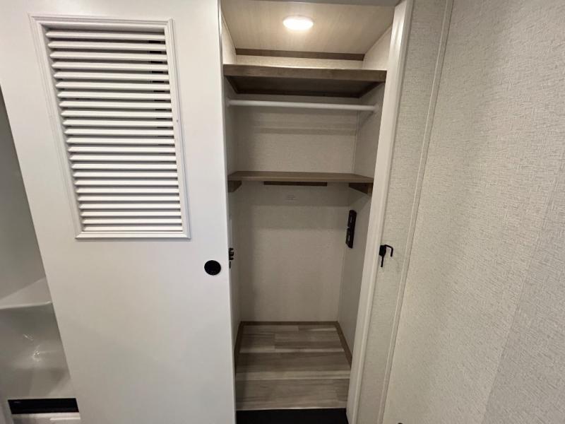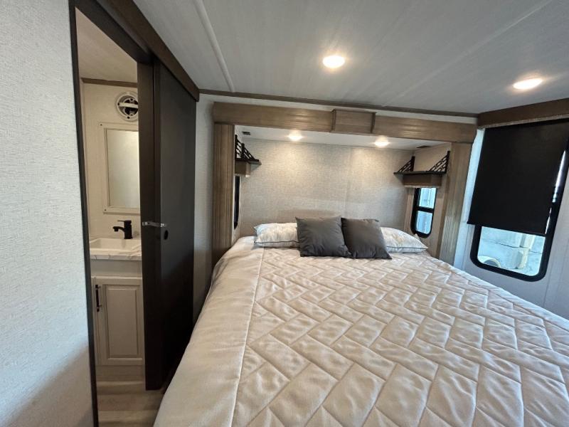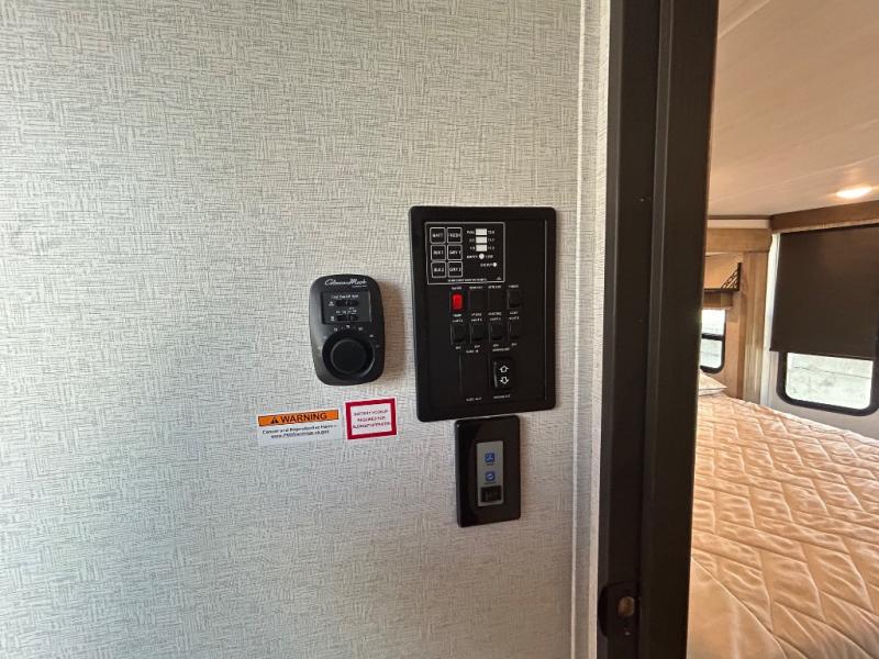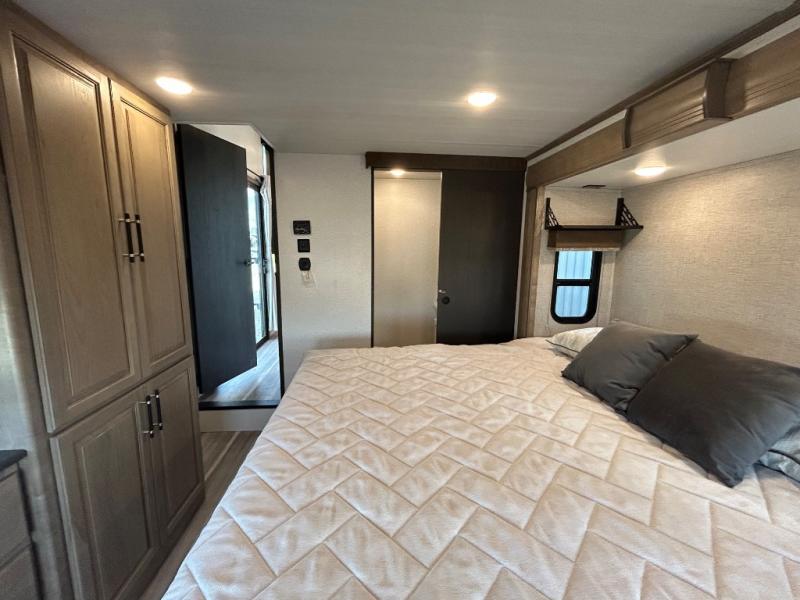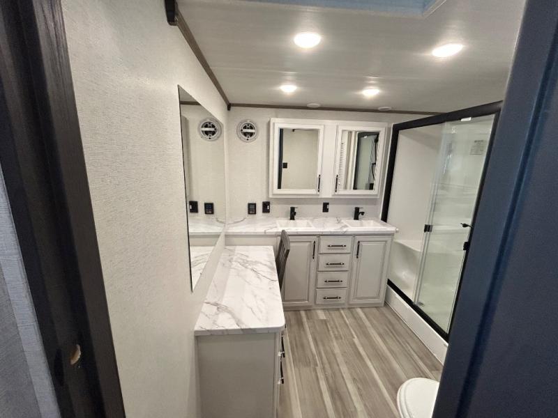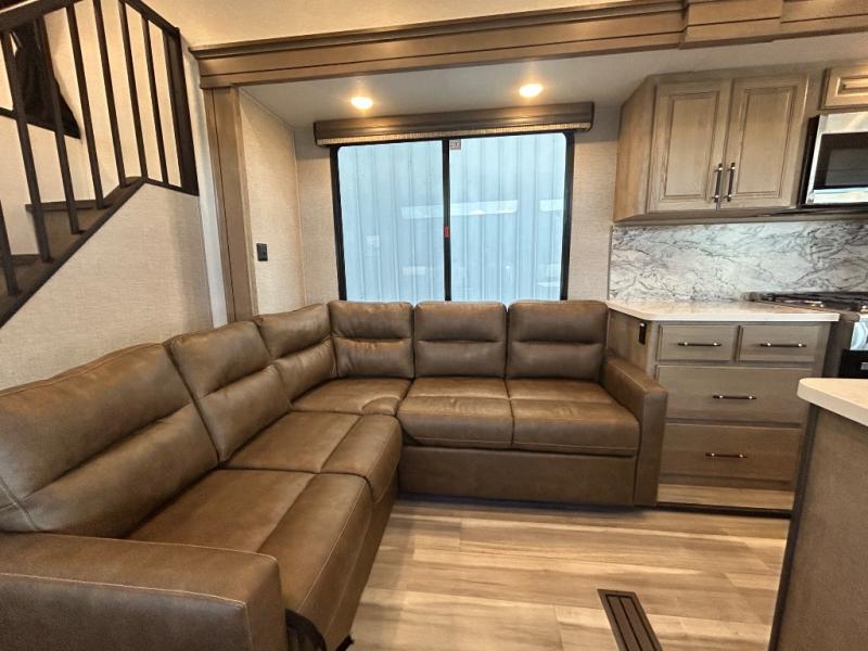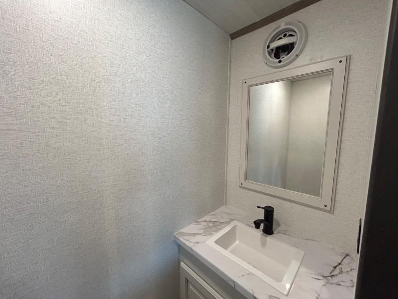 This destination trailer is a home away from home where comfort, relaxation, and entertainment come together in perfect harmony. The rear bathroom is a serene oasis, featuring washer and dryer prep, dual sink, and makeup vanity. Above, the loft area offers a cozy bunk mat, storage shelves, and an entertainment center - perfect for kids or guests. The living area is designed for relaxation and entertainment, featuring a comfortable sectional sofa, entertainment center, and warm fireplace. The kitchen is a gourmet's paradise, boasting a refrigerator, pantry, three-burner cooktop, kitchen island with chairs, and spacious pantry. The front bedroom is a peaceful retreat, complete with a half bath, overhead cabinets, a king bed, a wardrobe, and a dresser. Above, the loft area offers three bunk mats - perfect for kids or guests. Outside, enjoy the shade and protection of our 26' awning and convenient access via two entry/exit doors.