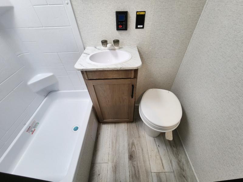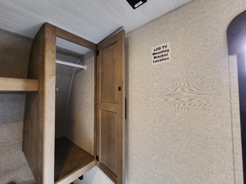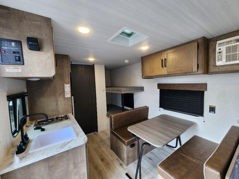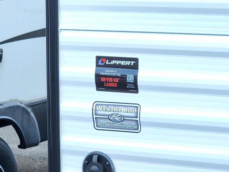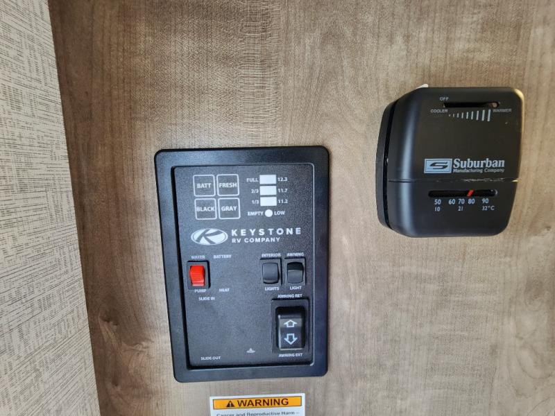 Get ready for outdoor fun with your favorite people when you have this trailer in tow! Once at your campsite, you can easily setup the 10' power awning, grab your camping chairs from the pass-thru storage, and relax or start playing. The cook will love the galley kitchen with the two burner cooktop, plus a refrigerator for cold items. If you like, you can eat inside at the booth dinette which doubles as sleeping space, and of course the kids will love the bunk beds next to the full bathroom. And you will sleep soundly on the front queen bed.