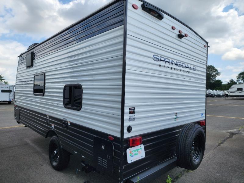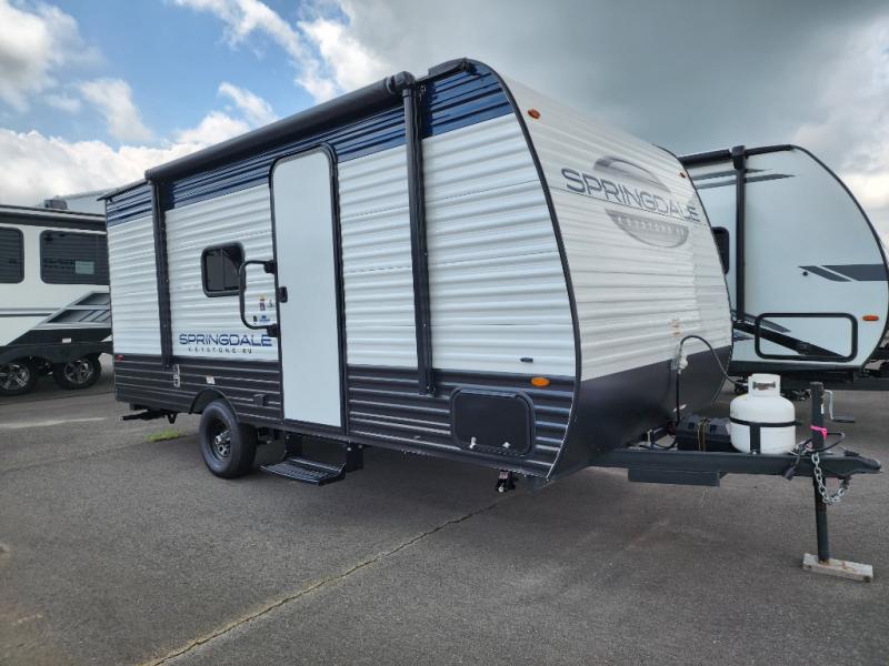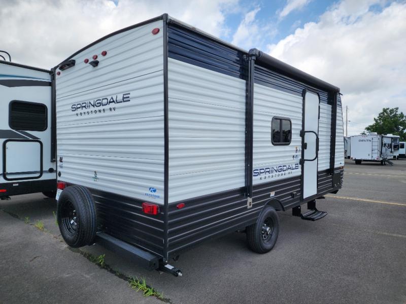 With any Springdale Classic Mini travel trailer by Keystone, you will enjoy lightweight towing thanks to their single-axle! You'll find the XL entry assist handle will make entering and exiting your unit easier than ever, and the power awning will provide protection from the sun as you relax in your camp chairs outside. Each model includes blackout night shades, solid wood cabinet doors and drawers, a shower skylight for more standing room, plus many more interior comforts. There is also a 5,000 BTU sidewall A/C and 20K BTU furnace to keep you comfortable, plus a Girard tankless water heater for endless hot showers!