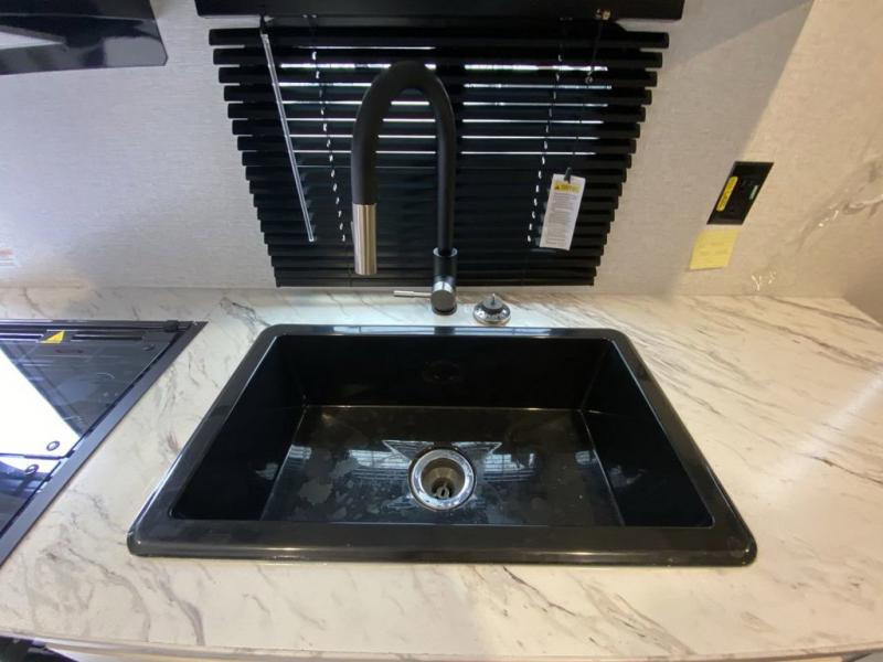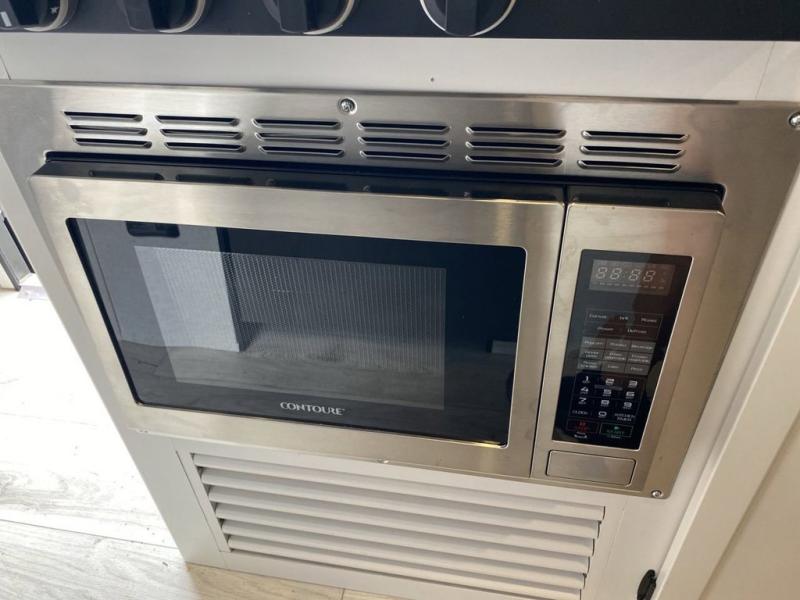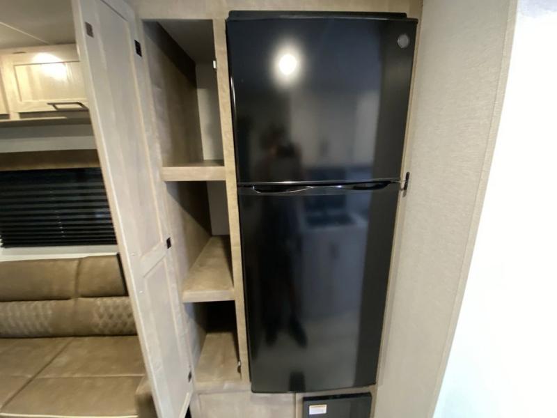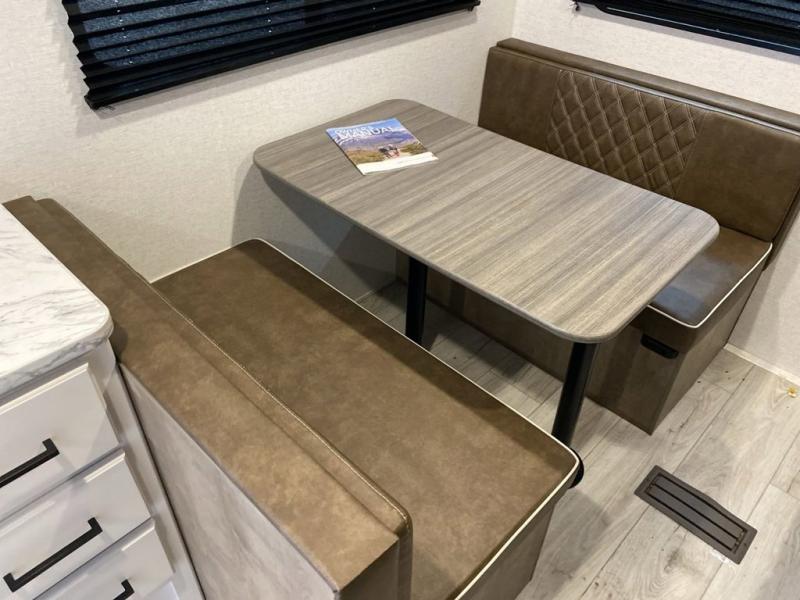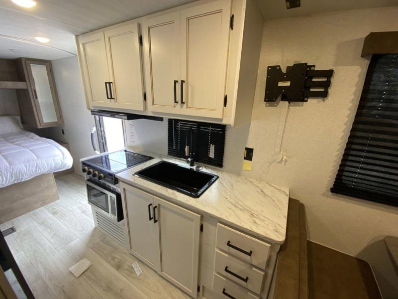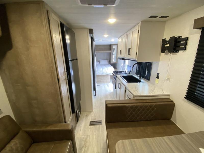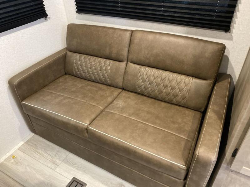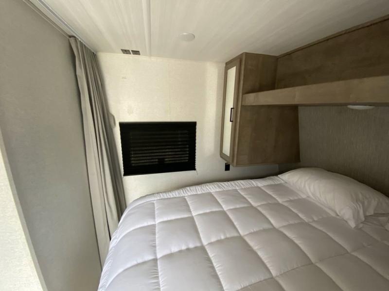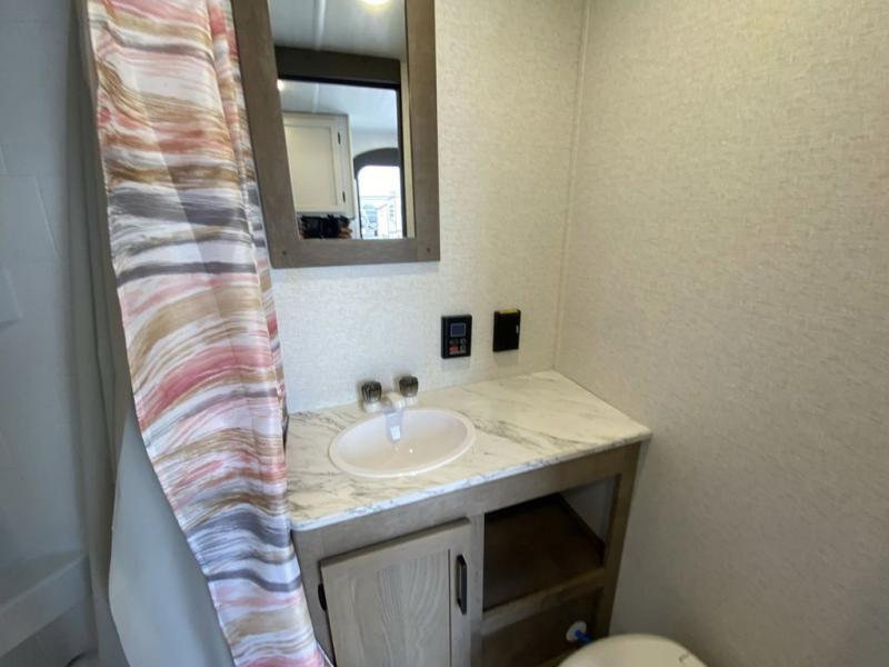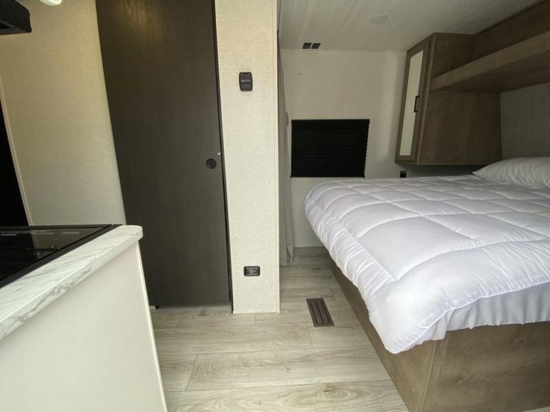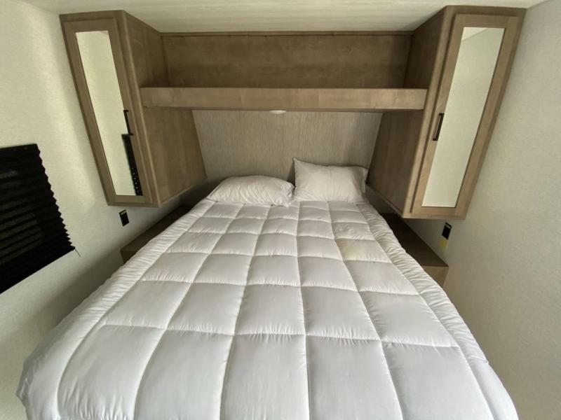 This trailer is perfect for your crew of four to six. There is a queen bed in the semi-private bedroom, along with dual closets and nightstands to keep your things tidy. You can dine each day on the booth dinette, relax on the sofa, and house additional guests here at night. The kitchen includes everything you need to prepare meals each day, including a gas range, microwave, and a 10 cu. ft. 12V refrigerator for cold items. And the full bath on board lets you stay clean throughout each camping trip!