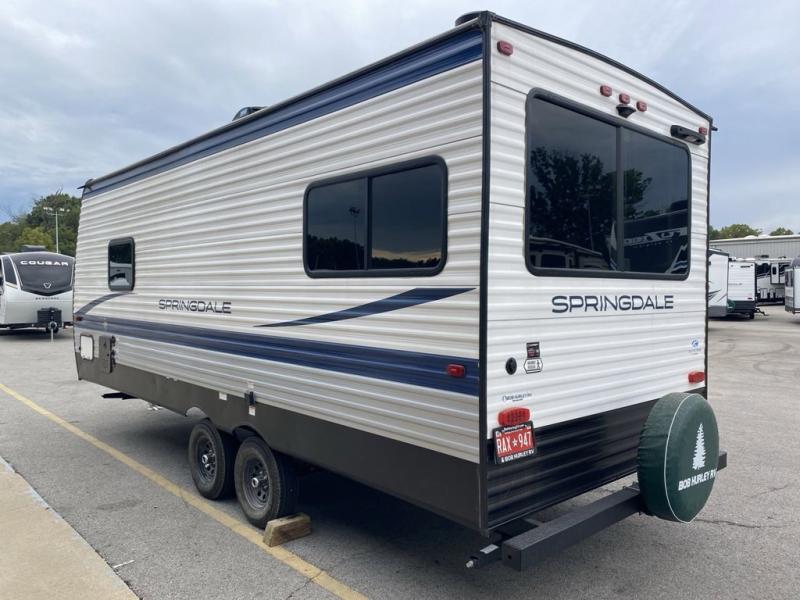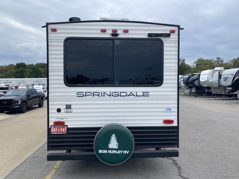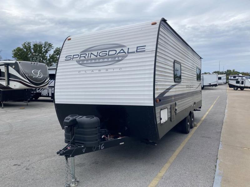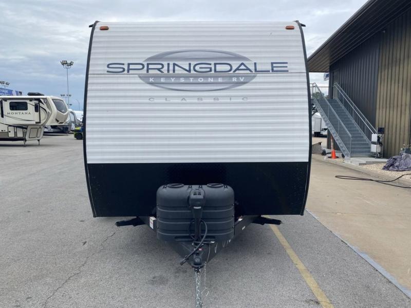 The Springdale Classic travel trailers by Keystone will provide you and your family many great outdoor experiences and it will also be kind to your pocketbook. Each one is constructed with an aluminum exterior, a walkable roof, and an I-beam frame with stamped steel cross-members and outriggers for added strength. There are also heavy duty stabilizer jacks and power tongue jacks outside, along with an XL entry assist handle for added convenience. Each travel trailer includes LED lighting, bedside outlets, and blackout night shades inside that will provide you with more privacy at night.