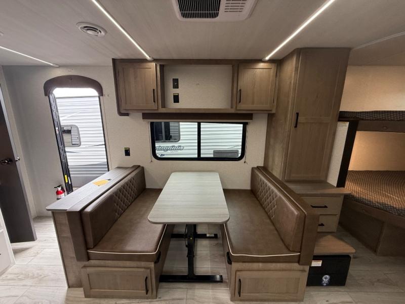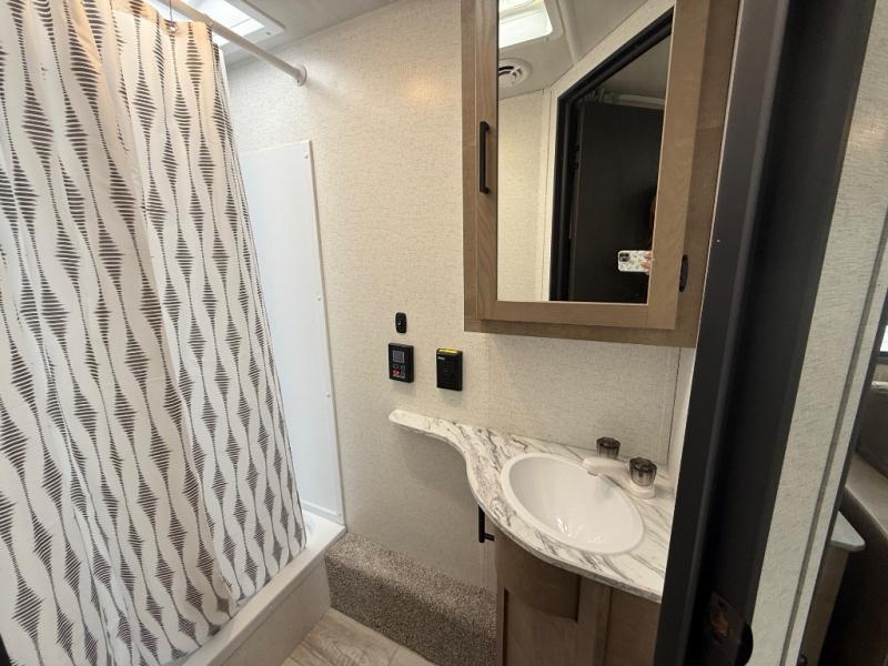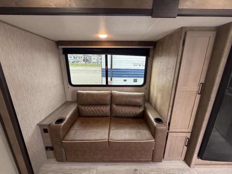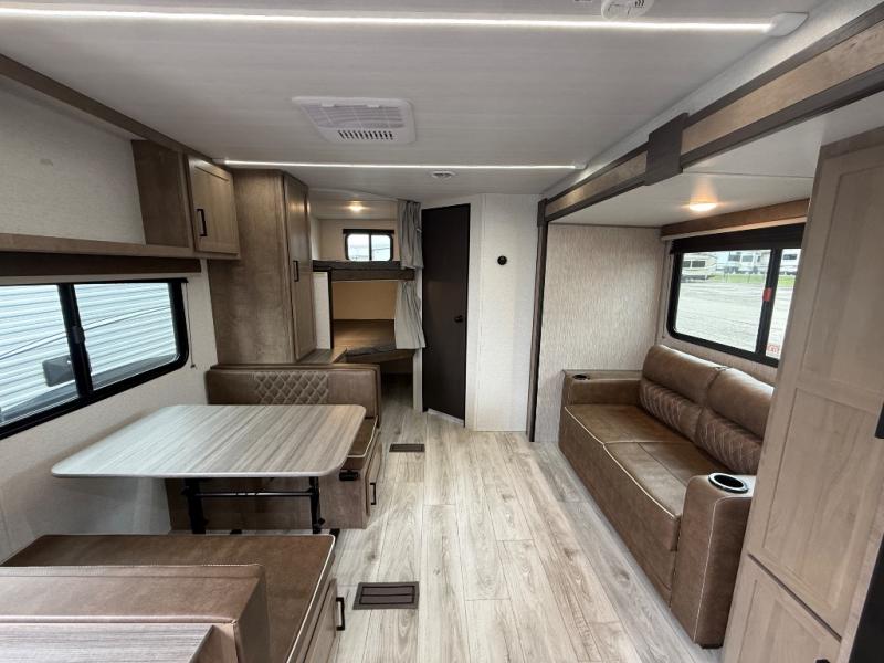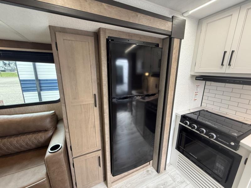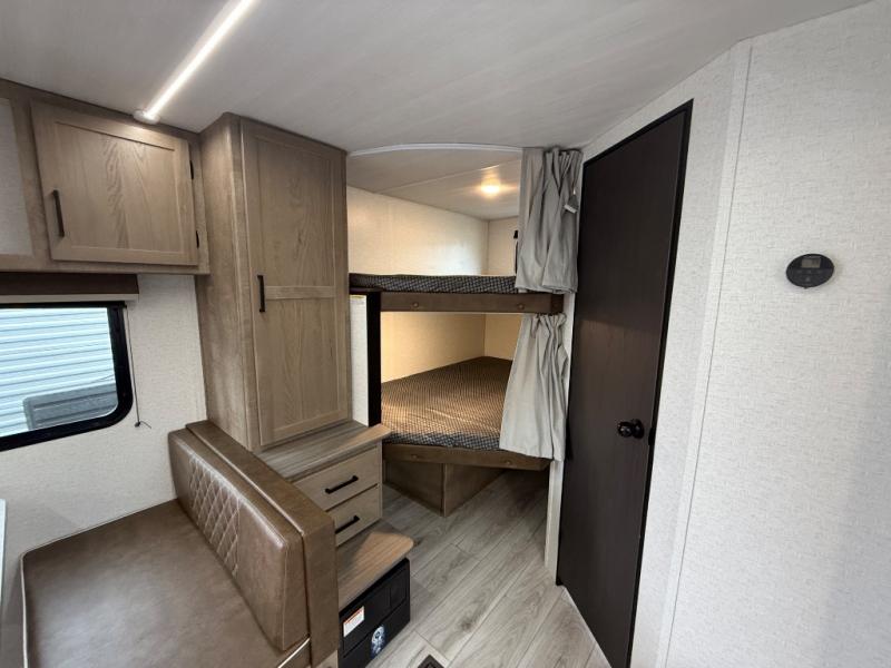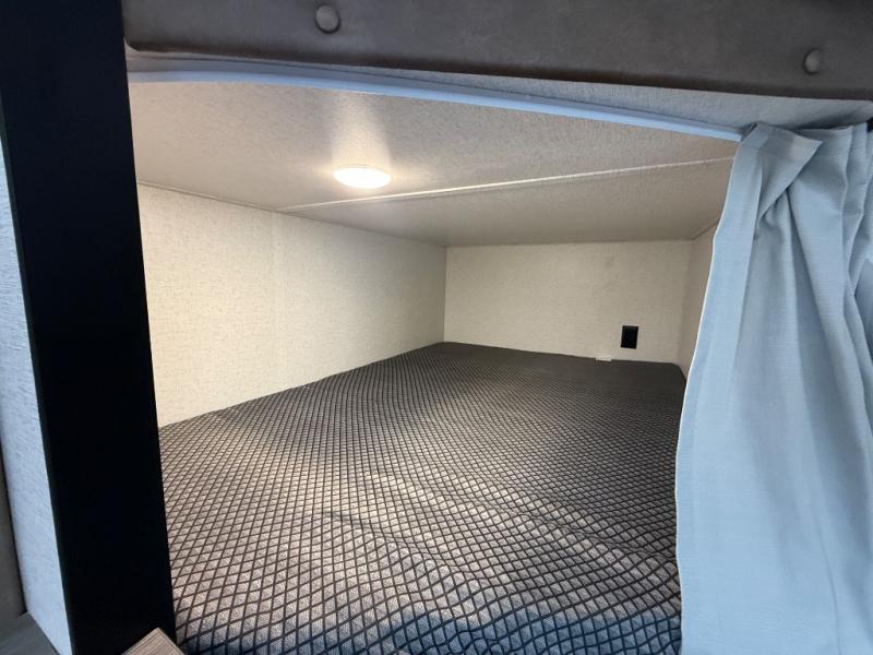 Camping trips in this spacious trailer are sure to bring lasting memories! The little ones or your guests will love the double-size bunks with a flip-up bottom bunk to easily store luggage away. You will have a cozy queen bed in the front bedroom, along with dual closets and nightstands and a laundry chute that will go straight to the pass-through storage. Everyone can meet in the middle living room on the tri-fold sofa, and this will double as additional sleeping space for more campers. And don't overlook the full kitchen with a three burner cooktop, air fryer microwave oven, and 10 cu. ft. refrigerator. There is even an outdoor refrigerator so you can grab a cold drink while relaxing under the 14' awning!