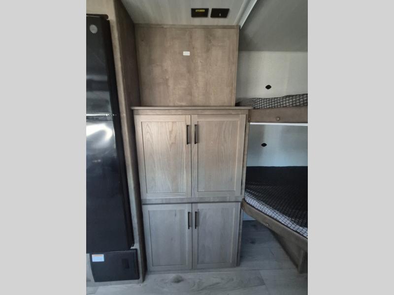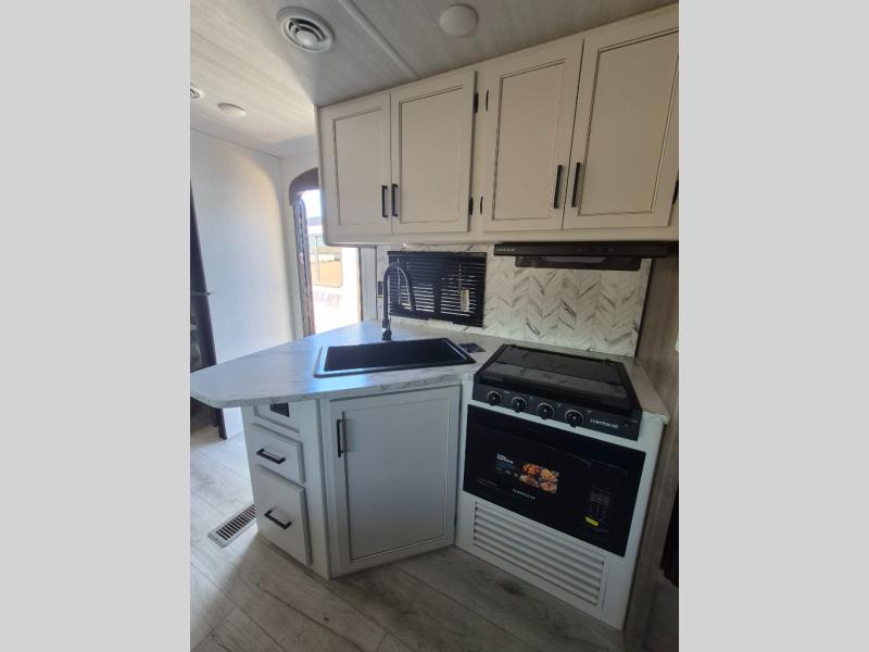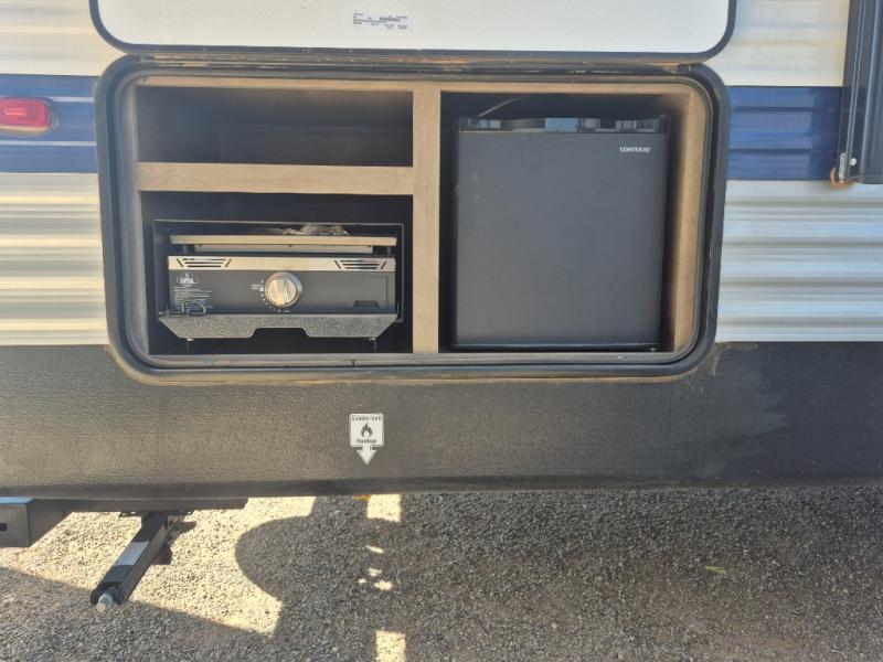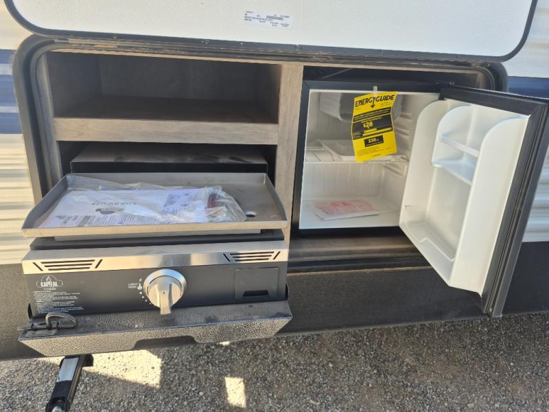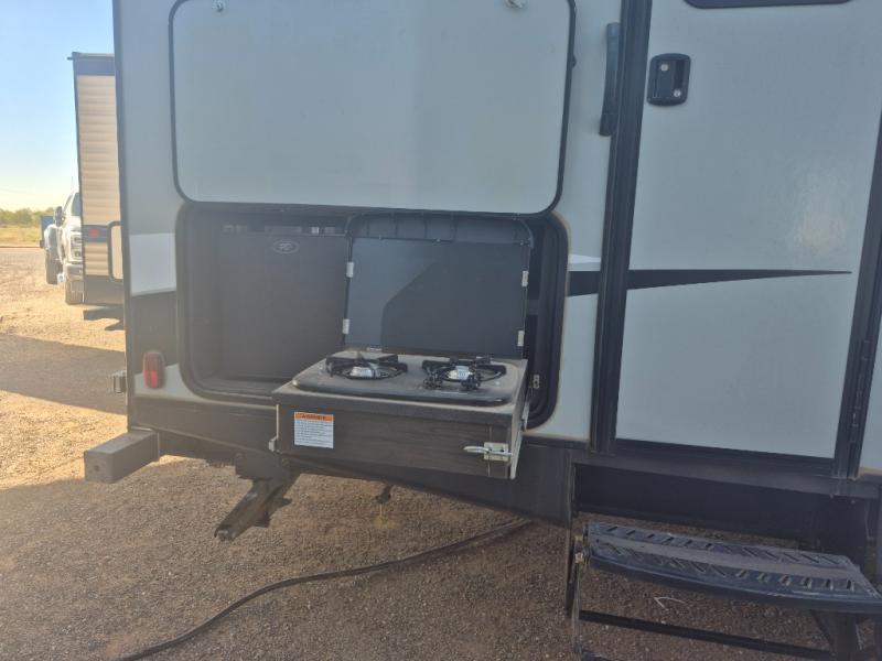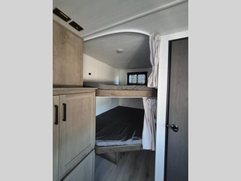 What could be better than camping with double-size bunks for guests? How about a front private bedroom for you, a full bath to clean up in, and a large slide out for maximum space! The chef of your group can prepare breakfast on the three burner gas range in the morning, or use the microwave if you're on the go. There is a U-shaped dinette to dine at, or you can take your plate outdoors to sit under the power awning.