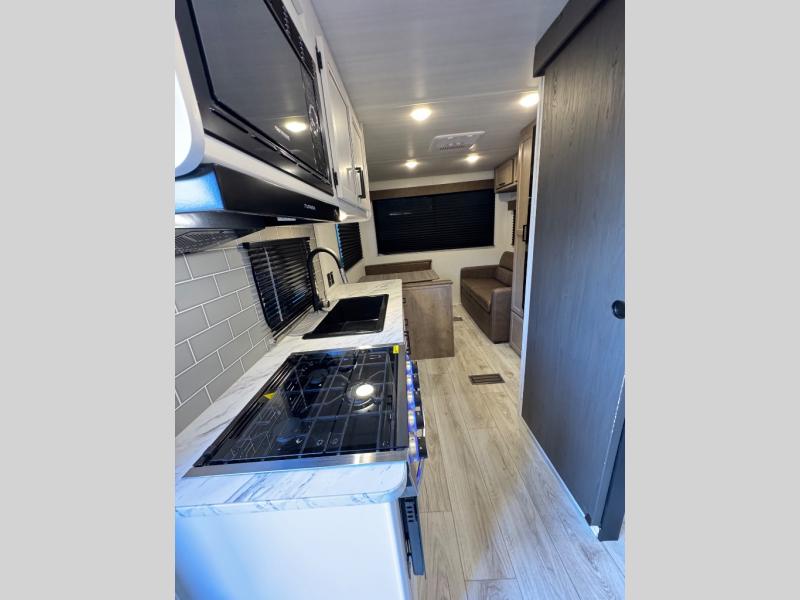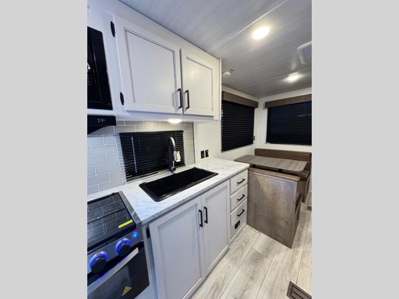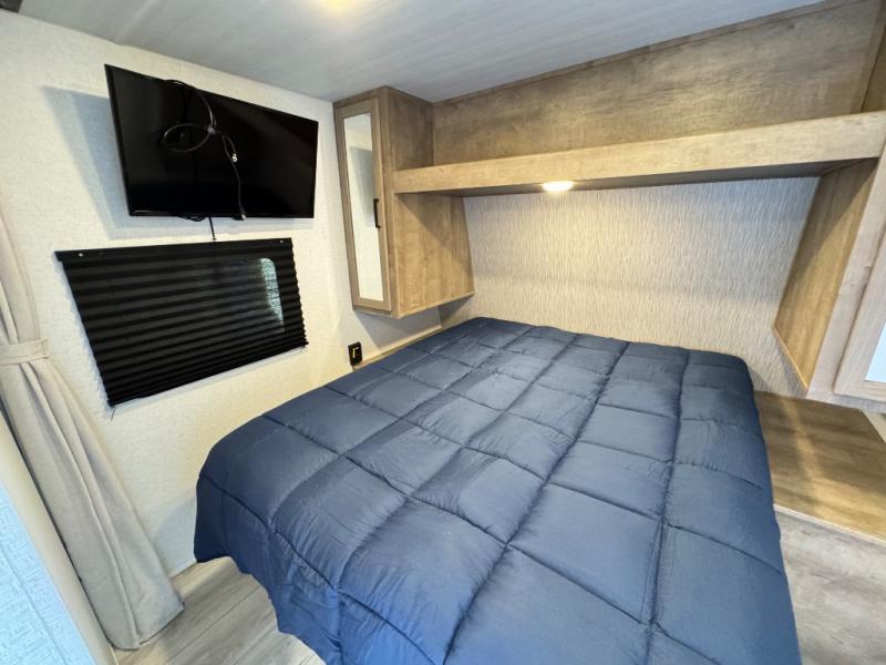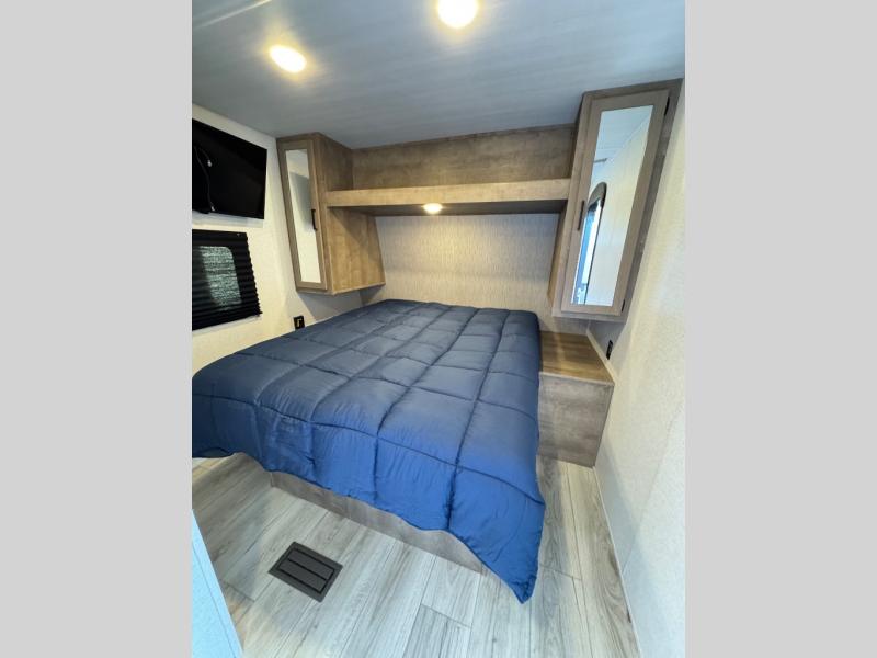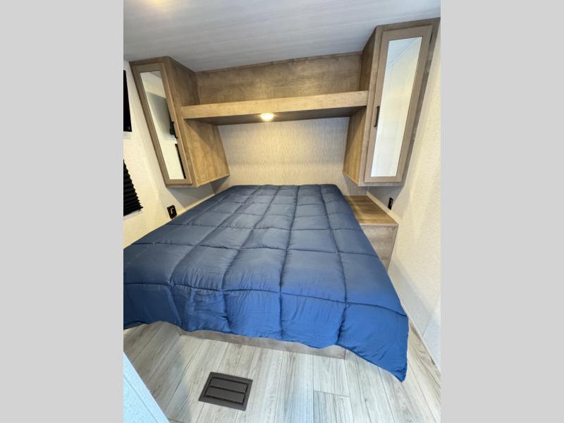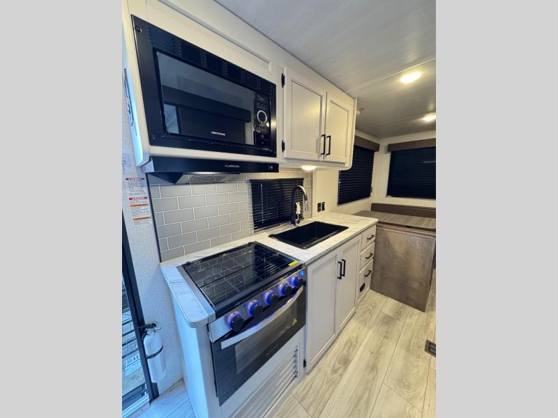 This trailer is perfect for your crew of four to six. There is a queen bed in the semi-private bedroom, along with dual closets and nightstands to keep your things tidy. You can dine each day on the booth dinette, relax on the sofa, and house additional guests here at night. The kitchen includes everything you need to prepare meals each day, including a gas range, microwave, and a 10 cu. ft. 12V refrigerator for cold items. And the full bath on board lets you stay clean throughout each camping trip!