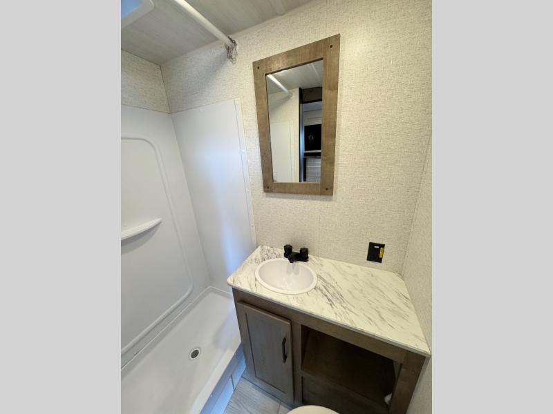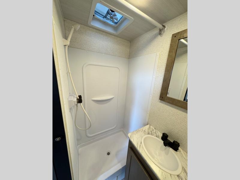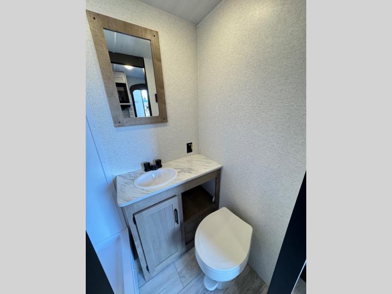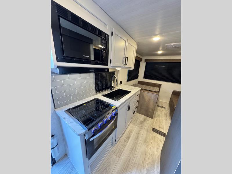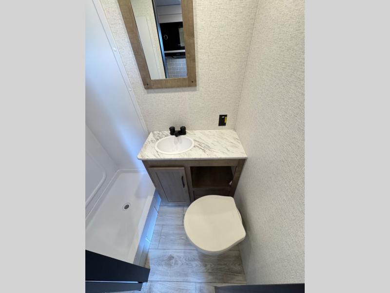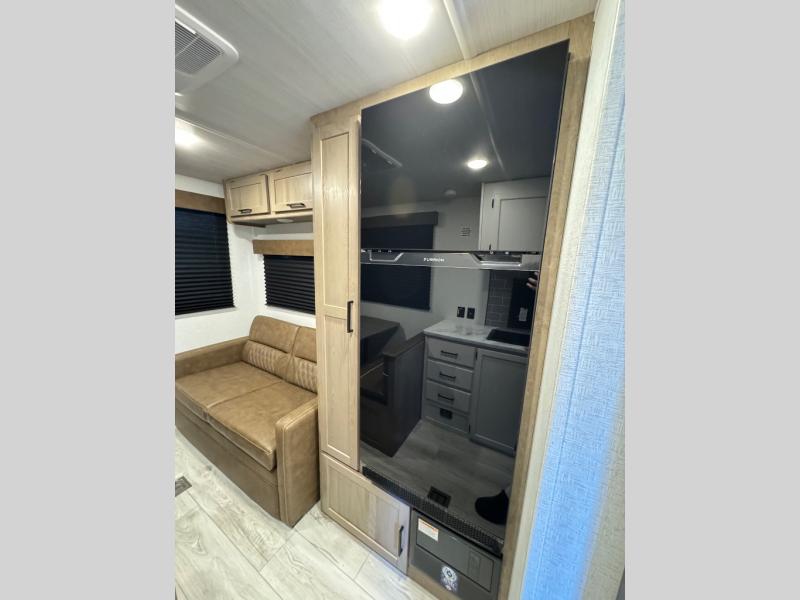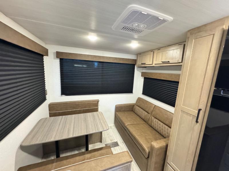 This trailer is perfect for your crew of four to six. There is a queen bed in the semi-private bedroom, along with dual closets and nightstands to keep your things tidy. You can dine each day on the booth dinette, relax on the sofa, and house additional guests here at night. The kitchen includes everything you need to prepare meals each day, including a gas range, microwave, and a 10 cu. ft. 12V refrigerator for cold items. And the full bath on board lets you stay clean throughout each camping trip!