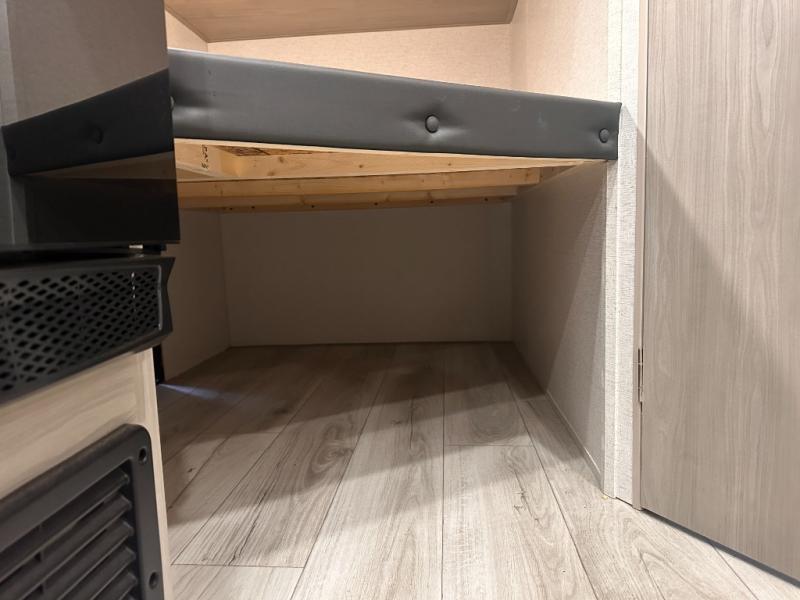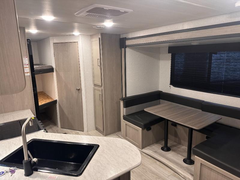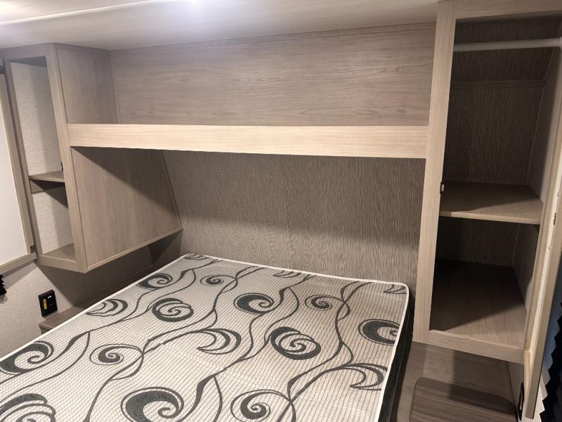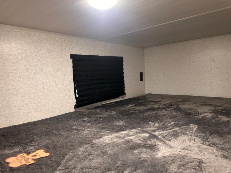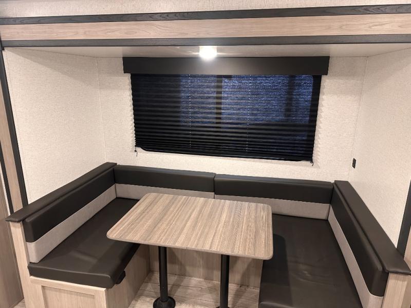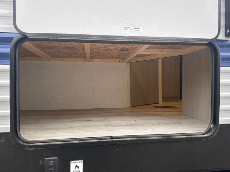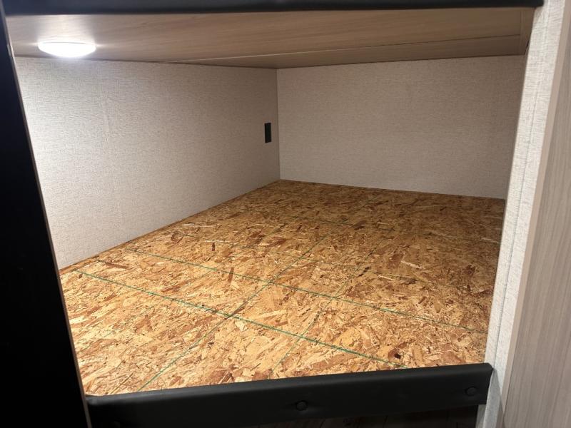 This bunkhouse travel trailer has room for your whole crowd! Enjoy the rear bunks or flip up the bottom one for more space. The front bedroom has a sliding door for privacy, plus dual closets and night stands. The kitchen features a three-burner range and 10 cu. ft. 12V refrigerator. Everyone will gather at the U-shape dinette. An entertainment center is standard and prepped for a TV. There is a front pass-through for housing all of your outdoor gear, as well as additional protection from the elements.