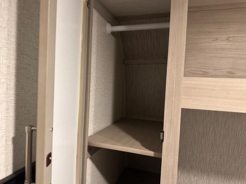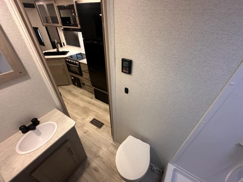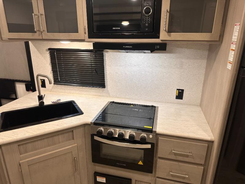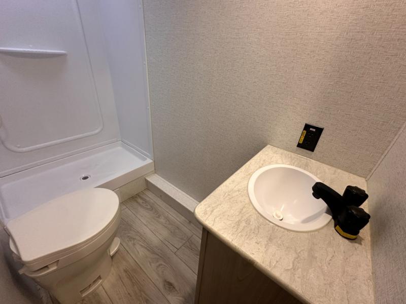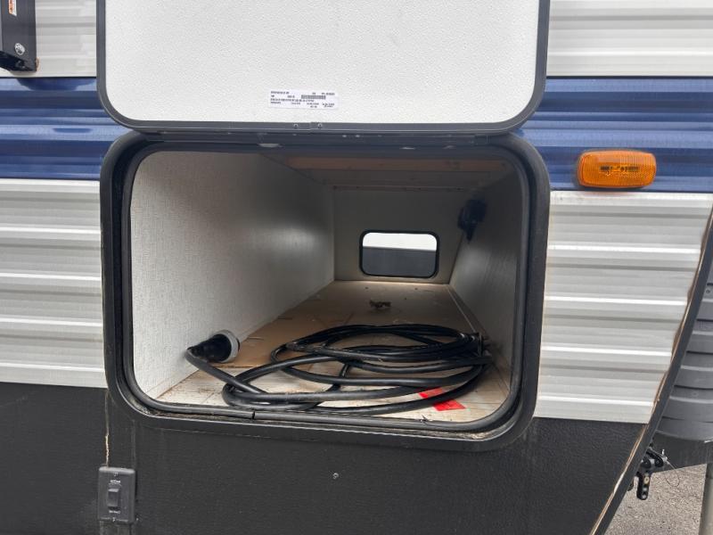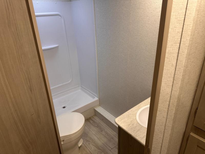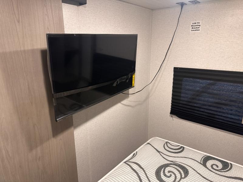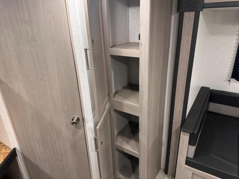 This bunkhouse travel trailer has room for your whole crowd! Enjoy the rear bunks or flip up the bottom one for more space. The front bedroom has a sliding door for privacy, plus dual closets and night stands. The kitchen features a three-burner range and 10 cu. ft. 12V refrigerator. Everyone will gather at the U-shape dinette. An entertainment center is standard and prepped for a TV. There is a front pass-through for housing all of your outdoor gear, as well as additional protection from the elements.