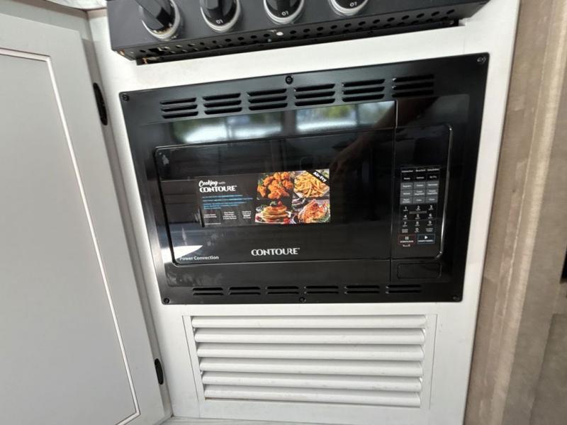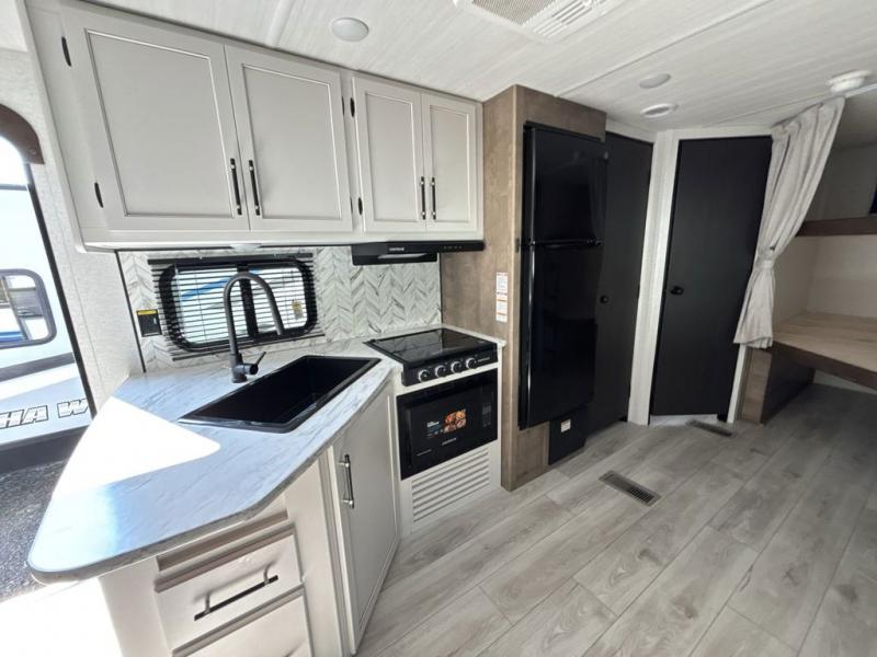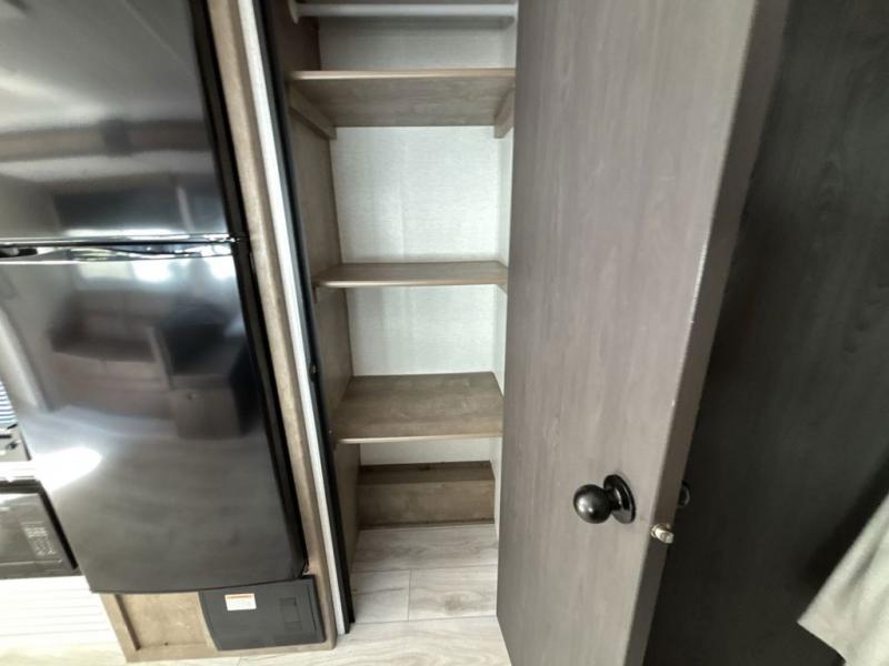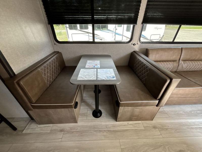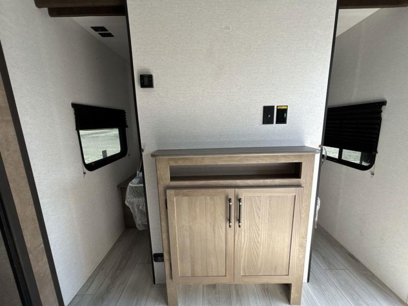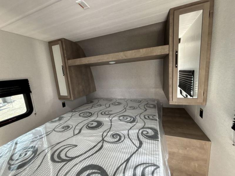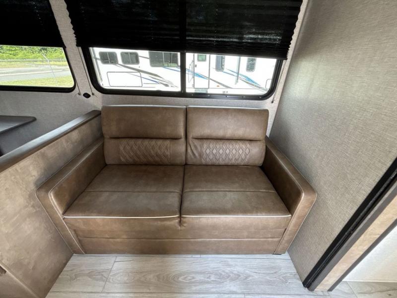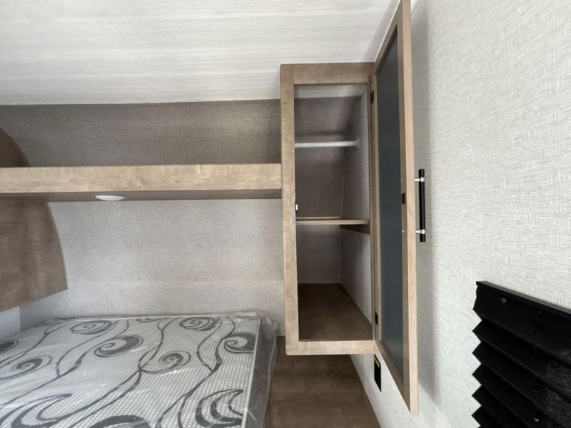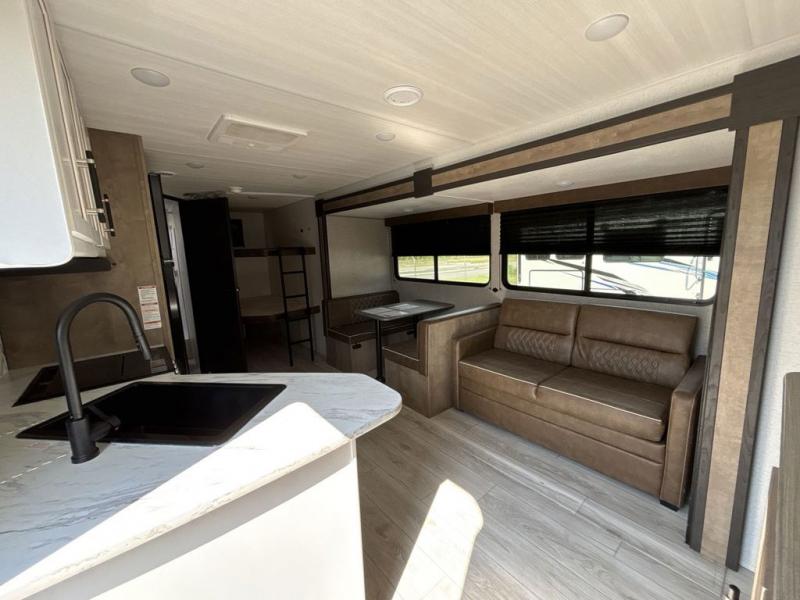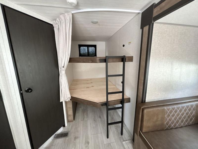 You'll have additional space to stretch out in this travel trailer for eight to ten! Within the slide you'll find the booth dinette and sofa that will be perfect for meal times, relaxing, and sleeping more guests, and there is an entertainment with TV prep for movie nights. The little ones will love the double-size bunks, and the full bath is close by for easy nighttime use. You'll have the front private bedroom with a queen bed all to yourselves, plus there are dual closets and nightstands for your things. This model also includes an exterior pass-through storage outside and a 16' power awning for protection against the sun!