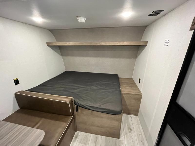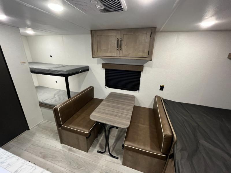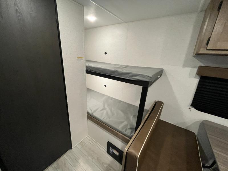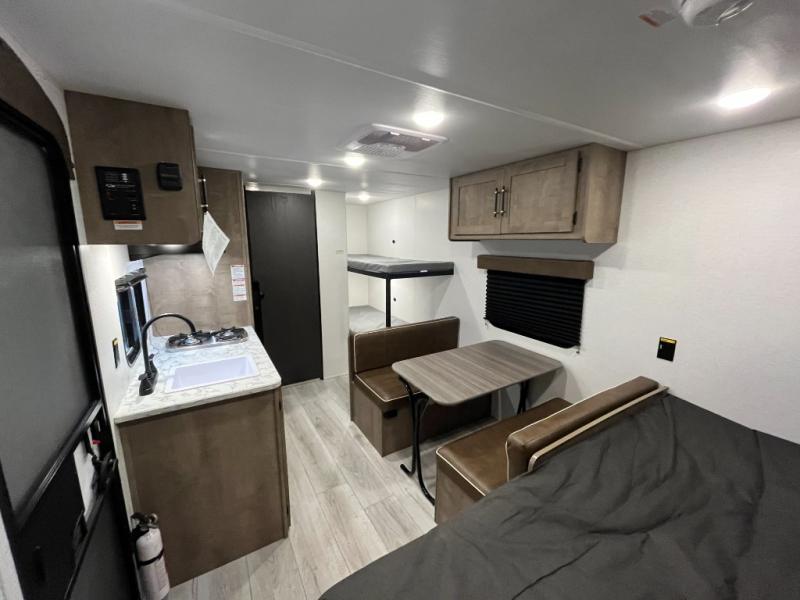 Get ready for outdoor fun with your favorite people when you have this trailer in tow! Once at your campsite, you can easily setup the 10' power awning, grab your camping chairs from the pass-thru storage, and relax or start playing. The cook will love the galley kitchen with the two burner cooktop, plus a refrigerator for cold items. If you like, you can eat inside at the booth dinette which doubles as sleeping space, and of course the kids will love the bunk beds next to the full bathroom. And you will sleep soundly on the front queen bed.