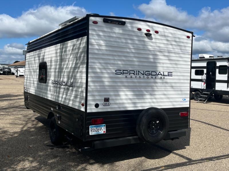 With any Springdale Classic Mini travel trailer by Keystone, you will enjoy lightweight towing thanks to their single-axle! You'll find the XL entry assist handle will make entering and exiting your unit easier than ever, and the power awning will provide protection from the sun as you relax in your camp chairs outside. Each model includes blackout night shades, solid wood cabinet doors and drawers, a shower skylight for more standing room, plus many more interior comforts. There is also a 5,000 BTU sidewall A/C and 20K BTU furnace to keep you comfortable, plus a Girard tankless water heater for endless hot showers!