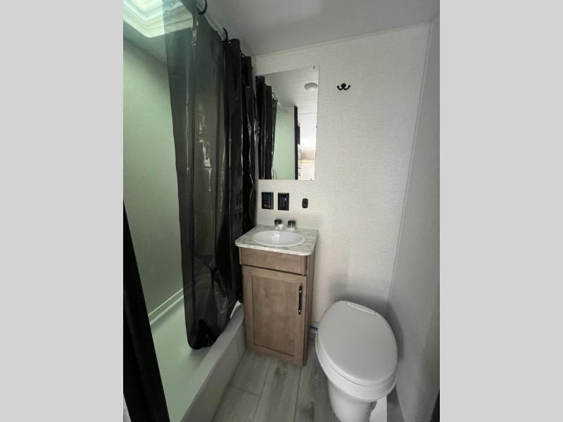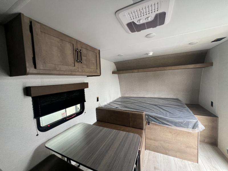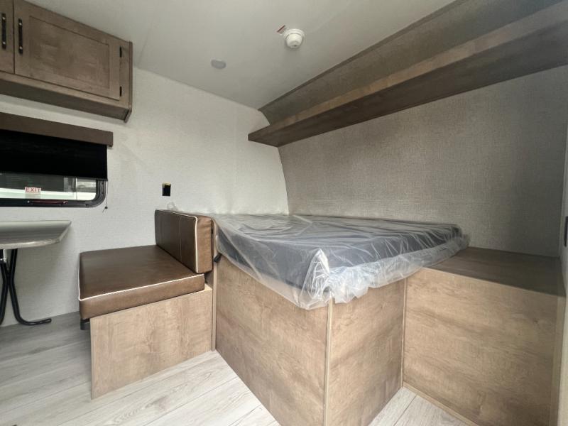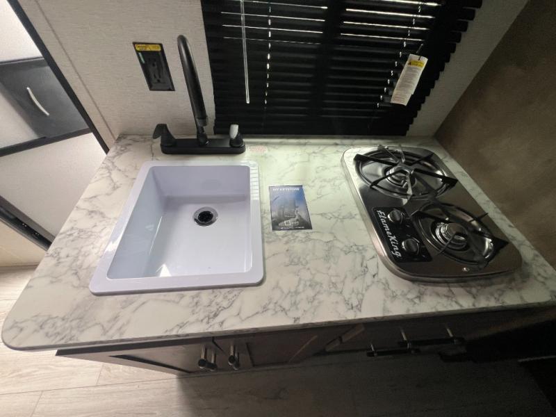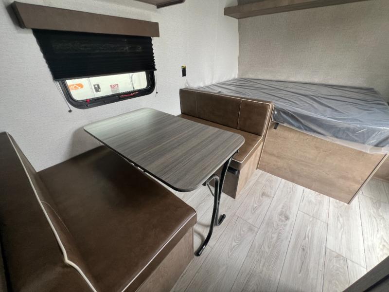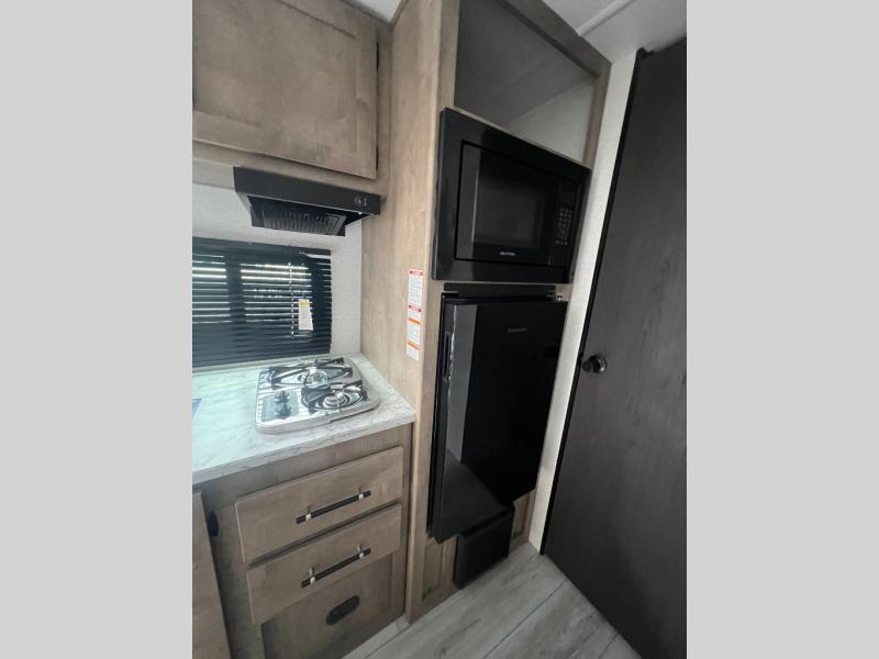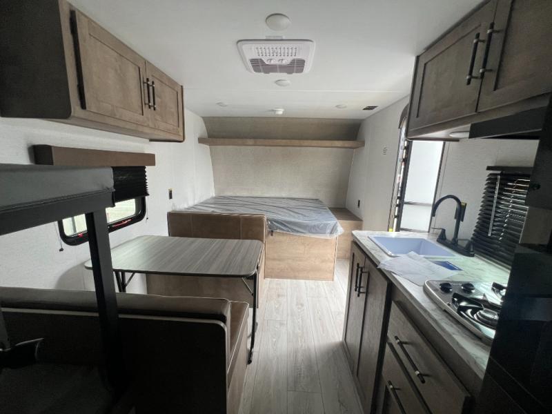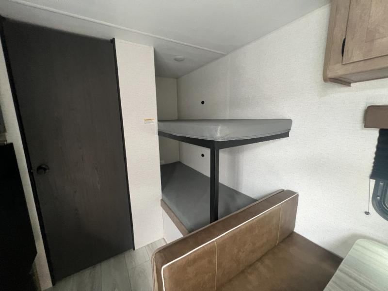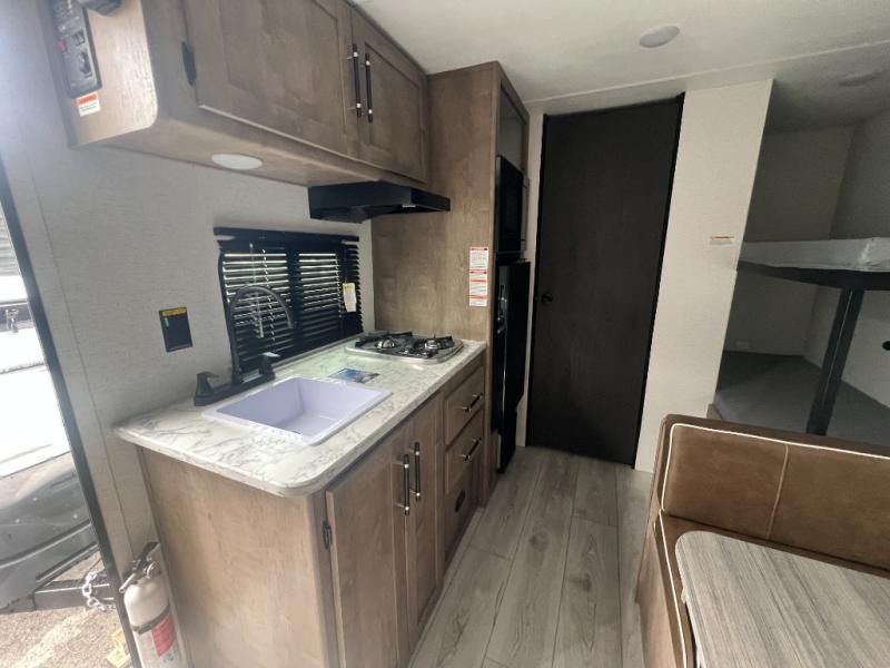 Get ready for outdoor fun with your favorite people when you have this trailer in tow! Once at your campsite, you can easily setup the 10' power awning, grab your camping chairs from the pass-thru storage, and relax or start playing. The cook will love the galley kitchen with the two burner cooktop, plus a refrigerator for cold items. If you like, you can eat inside at the booth dinette which doubles as sleeping space, and of course the kids will love the bunk beds next to the full bathroom. And you will sleep soundly on the front queen bed.