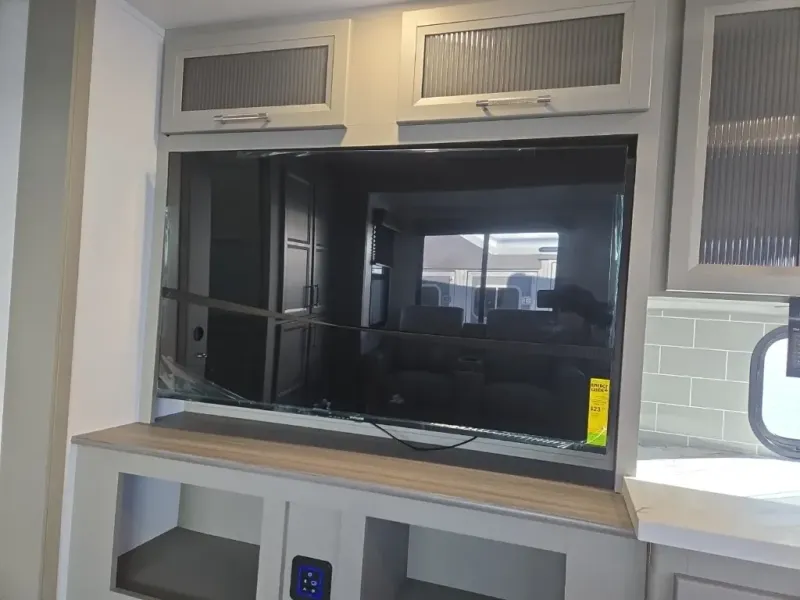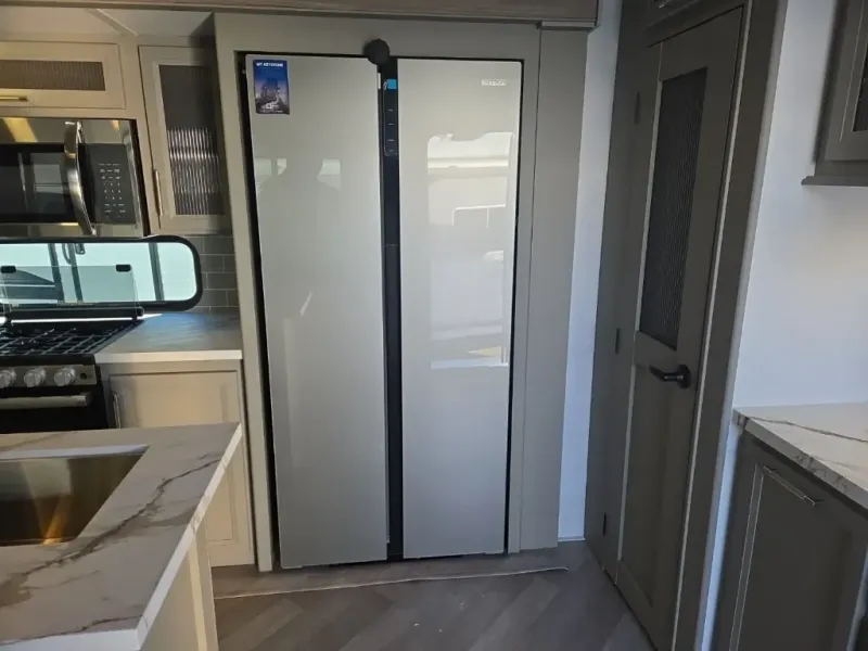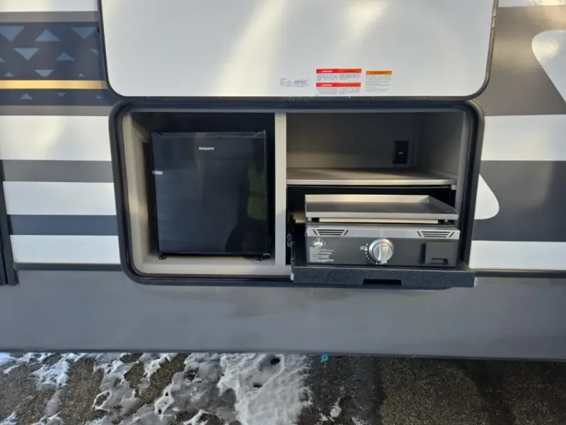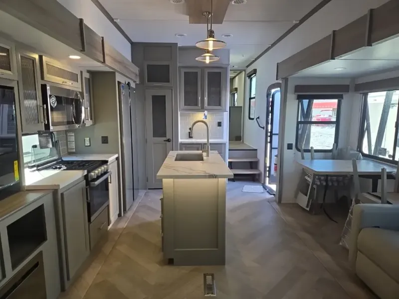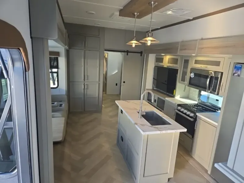A great family bunkhouse fifth wheel featuring quad slides that really open this entire unit up to provide spacious living throughout. A booth dinette or optional free standing dinette is great for meals, and full reclining theater seating with massage, lights, and USB connectivity make movie night a real treat! The kids will love the rear bunkhouse with a separate bath and private entry for easy access when outside. There is even a loft area above for storage, so they can bring a few friends along as well. The kitchen has all of the features needed to allow you to cook and entertain when you want with a three burner range including a glass top, a 16 cu. ft. 12 volt refrigerator, pantry, hutch for dishes and things, plus a solid surface countertop on the center island that houses your sink. In the bedroom, a king bed slides out to offer more floor space to move about, plus you will find ample storage in the front wardrobe which has also been prepped for a washer and dryer if you choose to add. You can also add a TV in the bedroom since it has been prepped for one as well. And let's not forget the outside two burner cooktop and refrigerator!