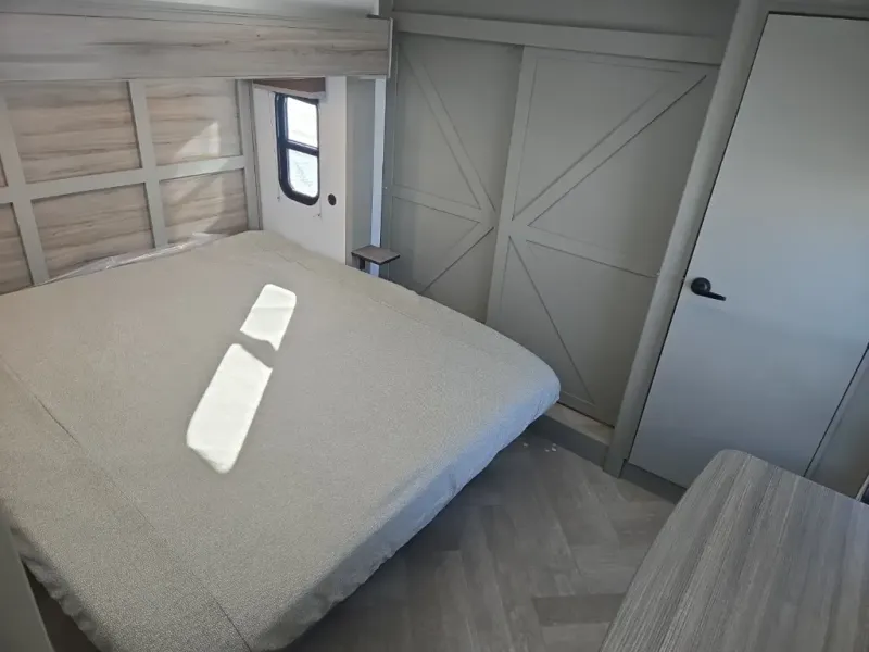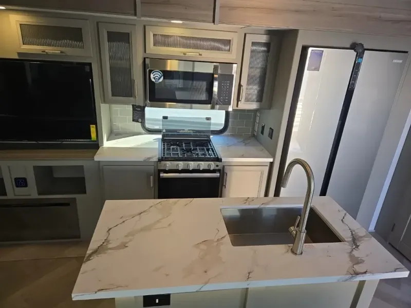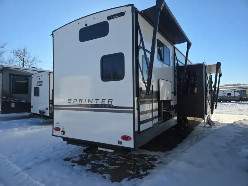 The Sprinter fifth wheels by Keystone feature spacious living areas, plenty of storage, and outstanding towability. Each unit is constructed with 2" aluminum framed and laminated sidewalls, a fully walkable roof, and dual layer insulation to help extend your camping season. The heated pass-through storage includes lockable slam latch baggage doors so you can easily pack your gear, and the one-touch 4-point leveling system features return hookup memory to have you set up in no-time. Head inside to find Congoleum vinyl flooring, Thomas Payne luxury collection furniture, residential style seamless marbled countertops, and an upgraded bedspread to name a few comforts. The Sprinter also includes a Girard tankless on-demand water heater, a central command center, plus a 30k BTU furnace and two A/C units to ensure your comfort!