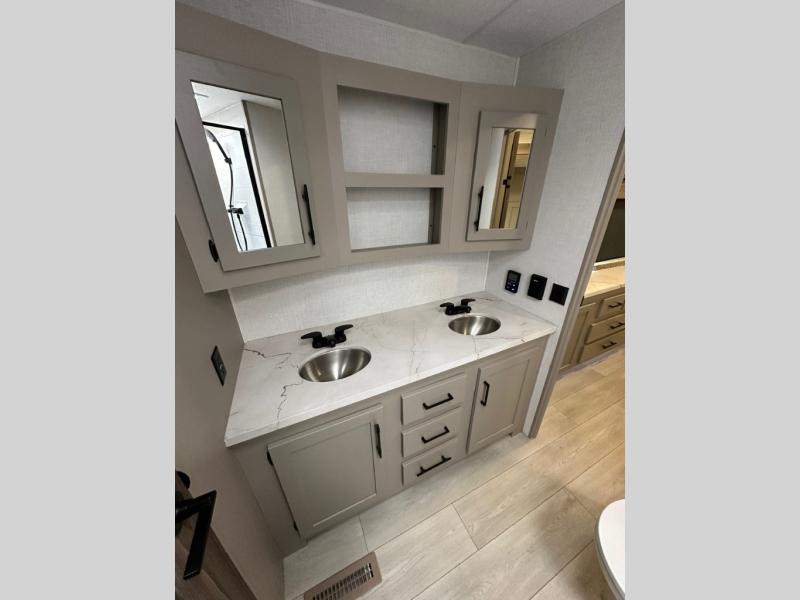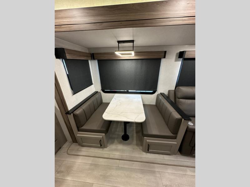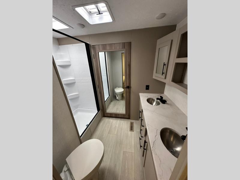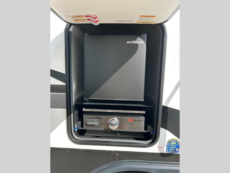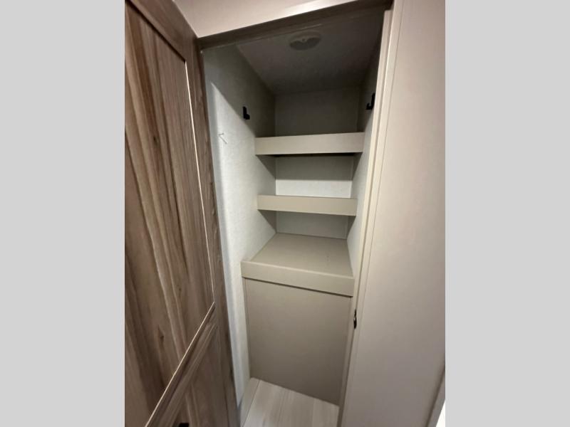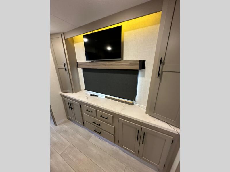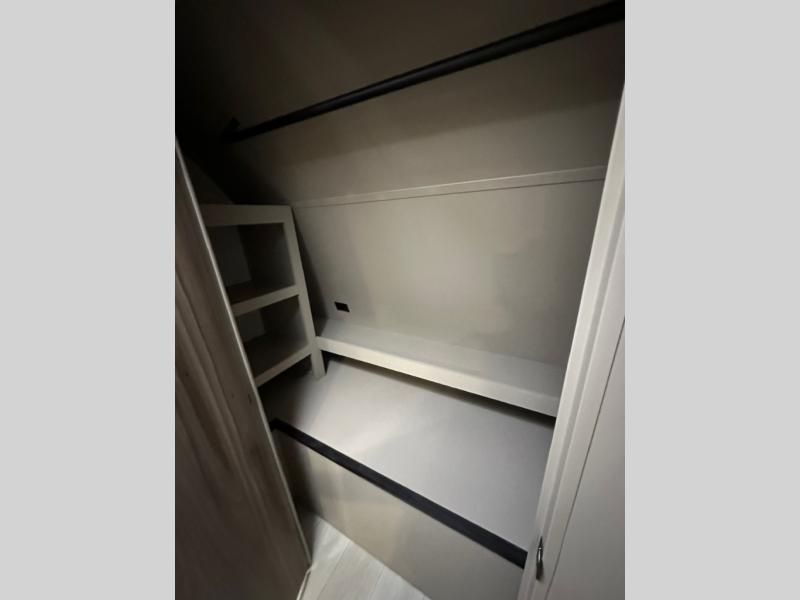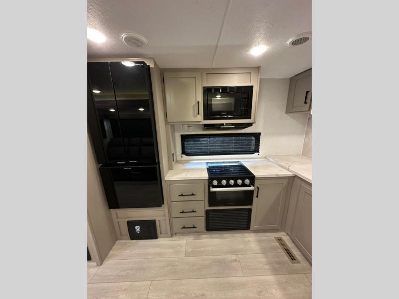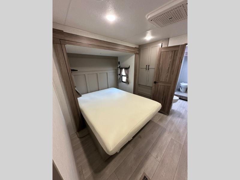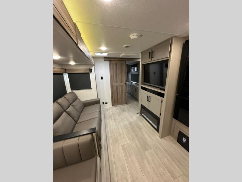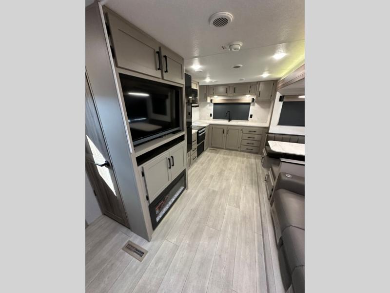 Pack your bags and head to the lake in this cozy travel trailer for five. Once you unload your gear from the pass-through storage, prepare a quick lunch on the mini outside kitchen with a griddle and relax under the patio awning. If the weather is raining on your parade, just head indoors to cook on the three burner cooktop, and you'll find ample counter space in this rear kitchen to set out drinks and sides. Your crew can relax on the hide-a-bed sofa and booth dinette within the large slide out, and there is an LED TV and a 34" fireplace for a more at-home atmosphere. One of your favorite features of this trailer will probably be the master suite with a king bed slide out, a dresser and an entertainment center, plus easy access to the front full bath. Here, you'll find dual bath sinks, a spacious shower, plus a walk-in closet with a closet rod to keep your outfits wrinkle free. There is even a wardrobe in the bedroom with washer and dryer prep so you can keep all those clothes fresh and clean!