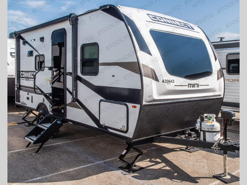 With any Connect Mini travel trailer by KZ, you will enjoy lightweight towing, interior comforts, and a price point you're sure to appreciate. Each model is constructed with durable 1-piece Tufflex material, 5/8" tongue and groove plywood flooring, and a molded fiberglass front cap with a windshield to let of your outdoor views in! You will love the look of the full glass friction hinged entry door, and the power awning with an LED light strip will provide a place to visit outdoors with friends and family. A hot and cold exterior shower also comes standard, along with nitrogen filled tires, a folding grab handle plus roof mounted solar prep and backup camera prep. Head inside to find residential grade linoleum, seamless countertops, roller shades, and painted hardwood cabinet doors. The 42,000 BTU tankless hot water heater will provide endless hot showers, and the low profile 13,500 BTU A/C will keep you comfortable during the summer!