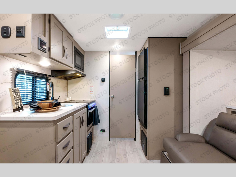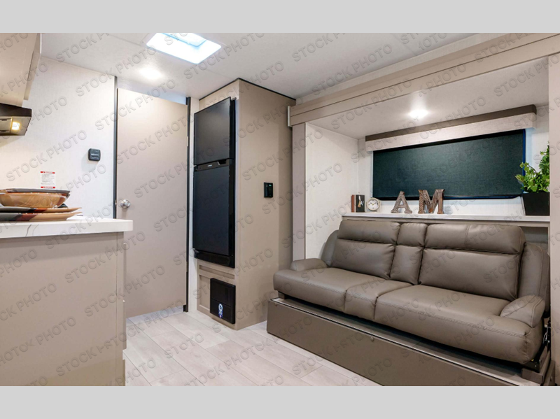 If you're wanting to upgrade from a tent to a travel trailer, this unit will be perfect for two to three campers. Instead of an air mattress, you'll sleep soundly on the front RV queen bed, and there are dual bedroom wardrobes so you don't have to live out of suitcases. The full rear bath is sure to come in handy, especially at night and you'll find more storage space here in the bath closet. When you're not wanting to grill on an open flame outdoors, the 17" oven with a three burner cooktop and the microwave oven will let you cook meals for your crew. There is also a 64" Jackknife sofa slide that will provide seating space, sleeping space for a guest, and extra floor space!