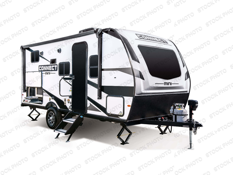With any Connect Mini travel trailer by KZ, you will enjoy lightweight towing, interior comforts, and a price point you're sure to appreciate. Each model is constructed with durable 1-piece Tufflex material, 5/8" tongue and groove plywood flooring, and a molded fiberglass front cap with a windshield to let of your outdoor views in! You will love the look of the full glass friction hinged entry door, and the power awning with an LED light strip will provide a place to visit outdoors with friends and family. A hot and cold exterior shower also comes standard, along with nitrogen filled tires, a folding grab handle plus roof mounted solar prep and backup camera prep. Head inside to find residential grade linoleum, seamless countertops, roller shades, and painted hardwood cabinet doors. The 42,000 BTU tankless hot water heater will provide endless hot showers, and the low profile 13,500 BTU A/C will keep you comfortable during the summer!