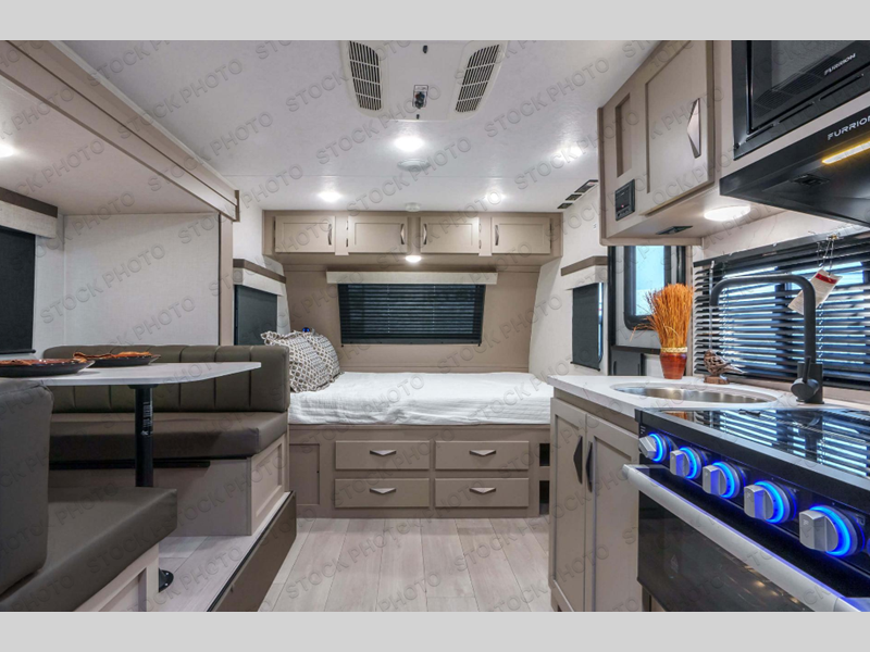 If you are looking for a little more sleeping space in a lightweight trailer, take a look at this Connect Mini. The 28" x 74" bunk beds will be perfect for guests or little ones, and the full bath is close by for easy nighttime use. You can take the front RV queen bed, and if you have any more guests, they can sleep on the booth dinette. A full kitchen, complete with a 17" oven and a microwave will let you cook breakfast each morning, and the radio included will let you listen to your favorite tunes. There is also an outside kitchen with a griddle and a refrigerator, exterior trunk doors, plus a 14' power awning with LED lights!