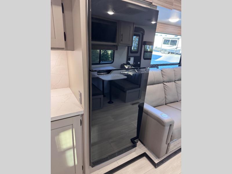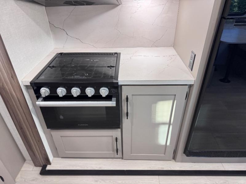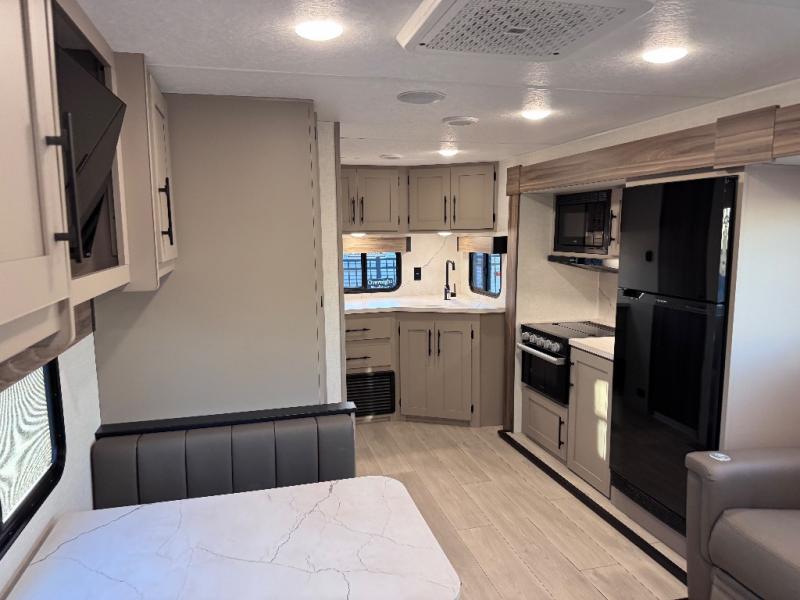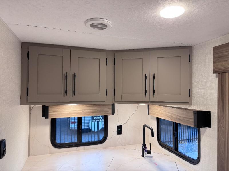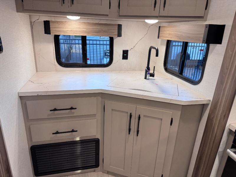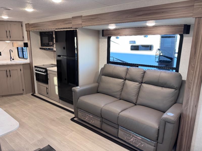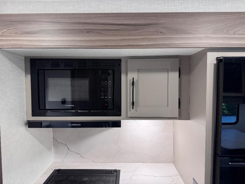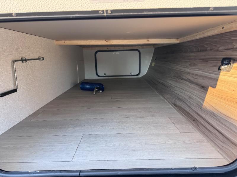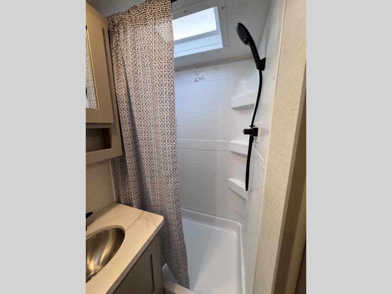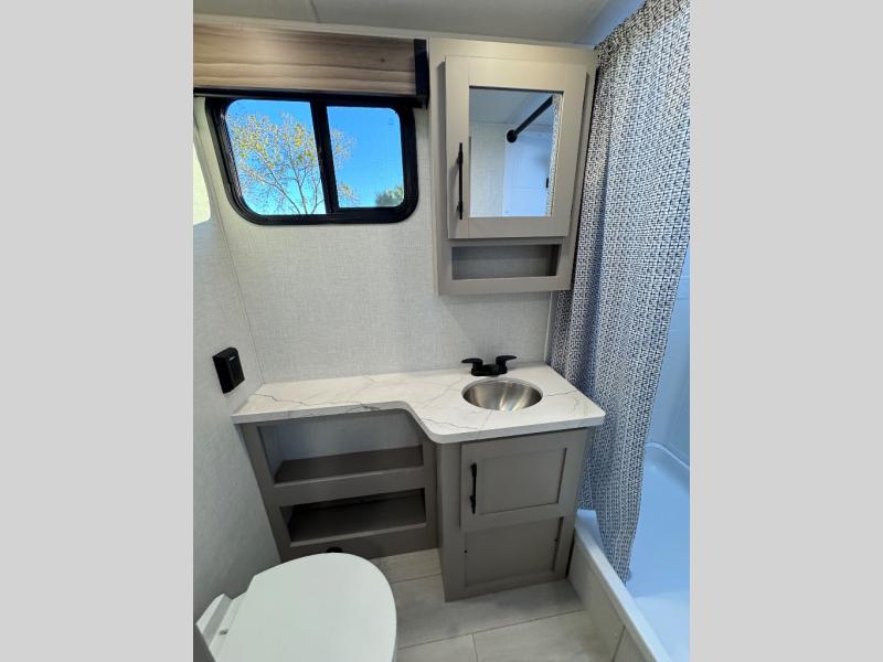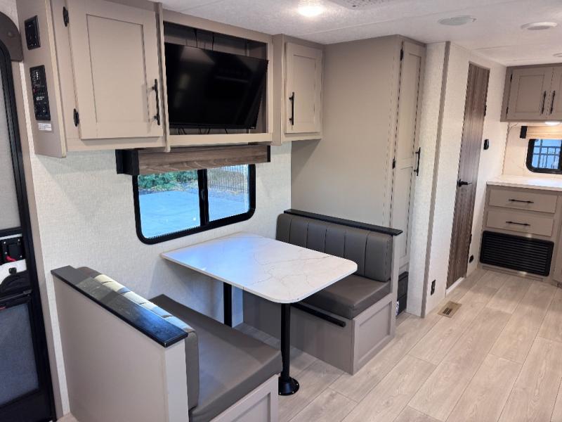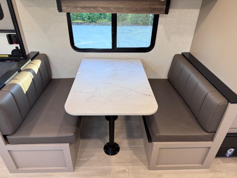 Travel on weekends, weekdays or whenever you want with this spacious trailer that has a large slide out that holds the theater seats with cupholders and USB ports, the 10 cu. ft. 12V refrigerator, and the cooking appliances. The rear corner has the kitchen sink and more counter space, giving the cook plenty of space to whip up camping meals. You can dine at the booth dinette or outside under the 18' power awning after grabbing your camping chairs from the pass-through storage. At night, get cleaned in the full bathroom with a nice amount of counter space for your toiletries, and fall quickly to sleep on your own queen bed up front with dual wardrobes for your clothing.