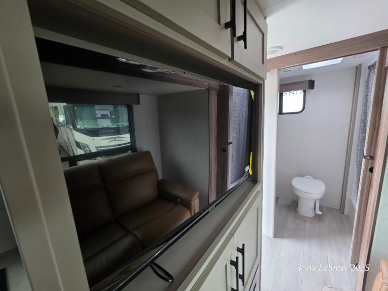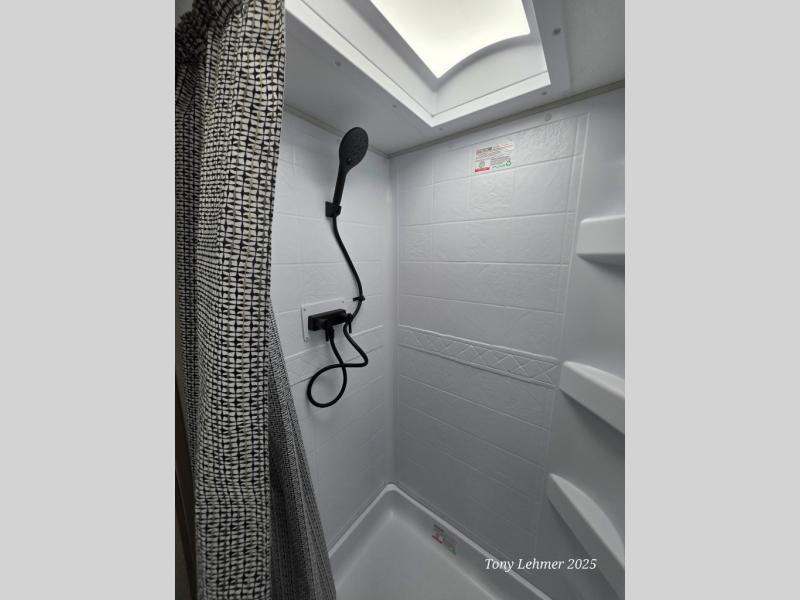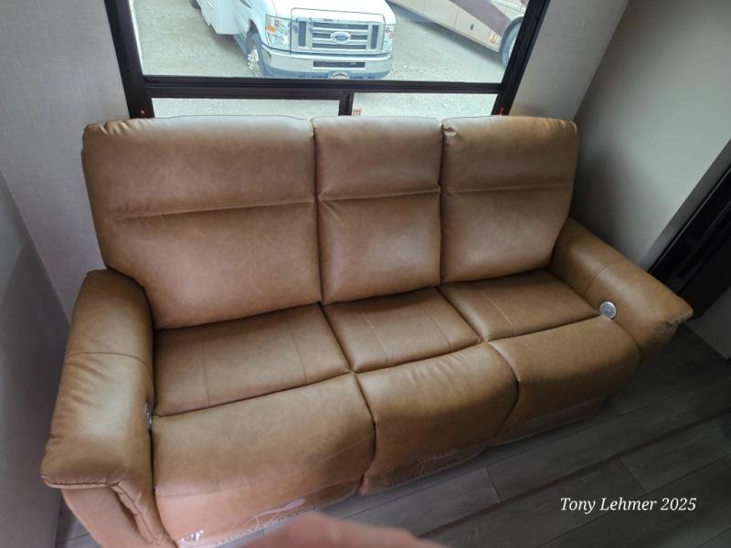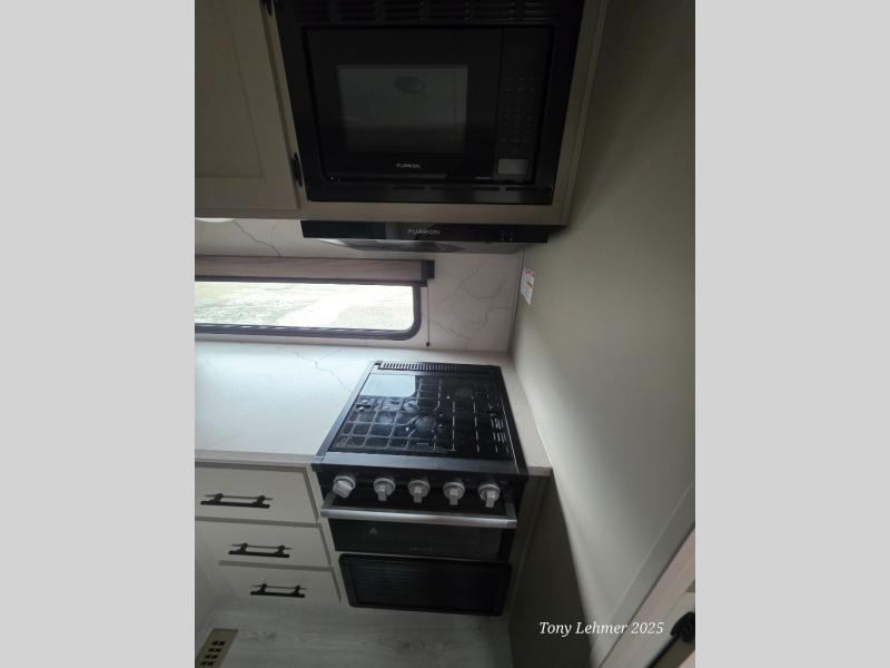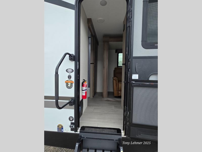 Inside comforts are found throughout this trailer from the theater dinette with a table and a 10 cu. ft. refrigerator within the slide out, to the rear full bathroom with a space saving door. Outside, you will find comfort under the 16' power awning while relaxing as you decide what to do next. The pass-through storage gives you a place for your larger items like camping chairs, portable stove, charcoal and outdoor games. The cook will love the L-shaped countertop and kitchen appliances, plus the walk-in pantry includes coat hooks. At night, head to the front to enjoy your own queen bed with clothing storage on each side, plus there is a TV mount if you want to add your own TV.
