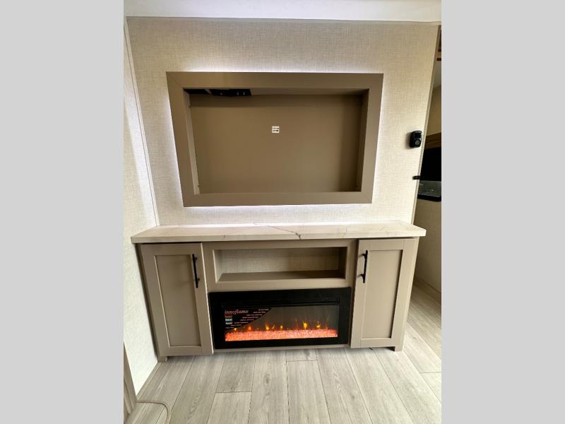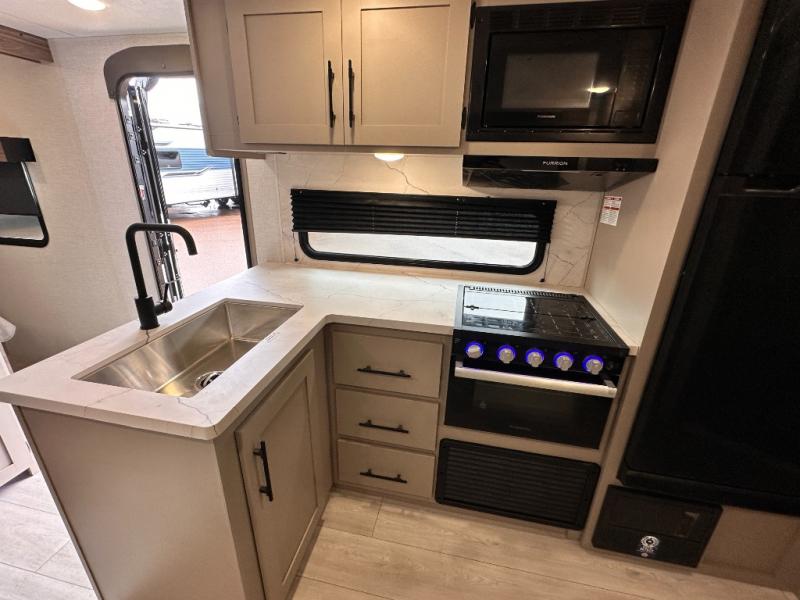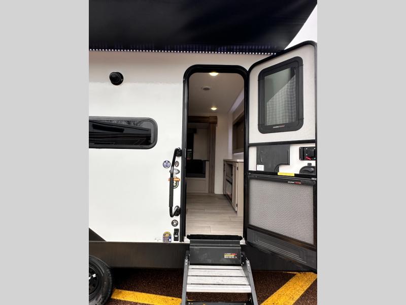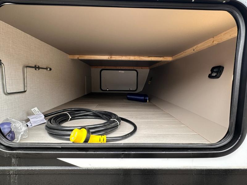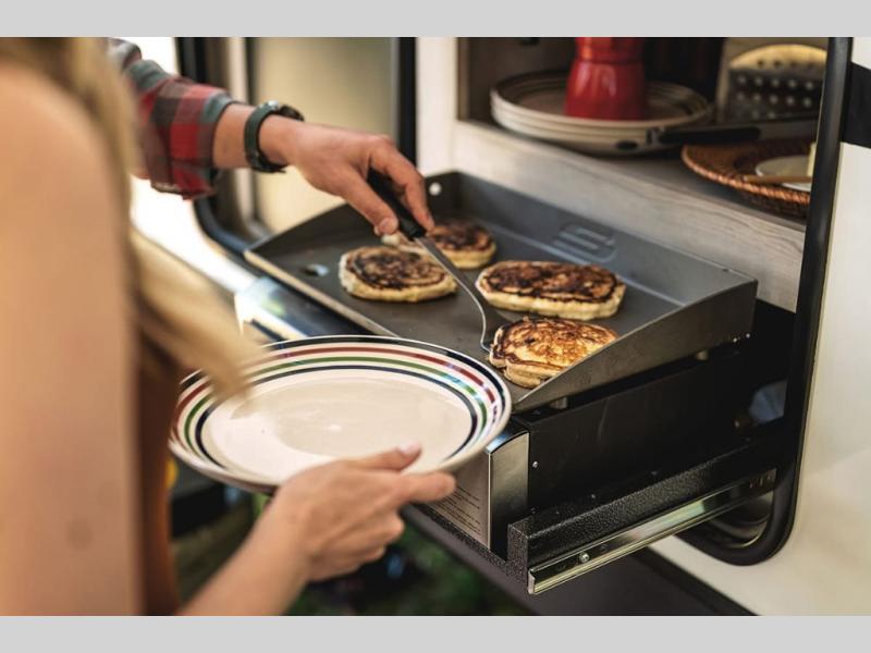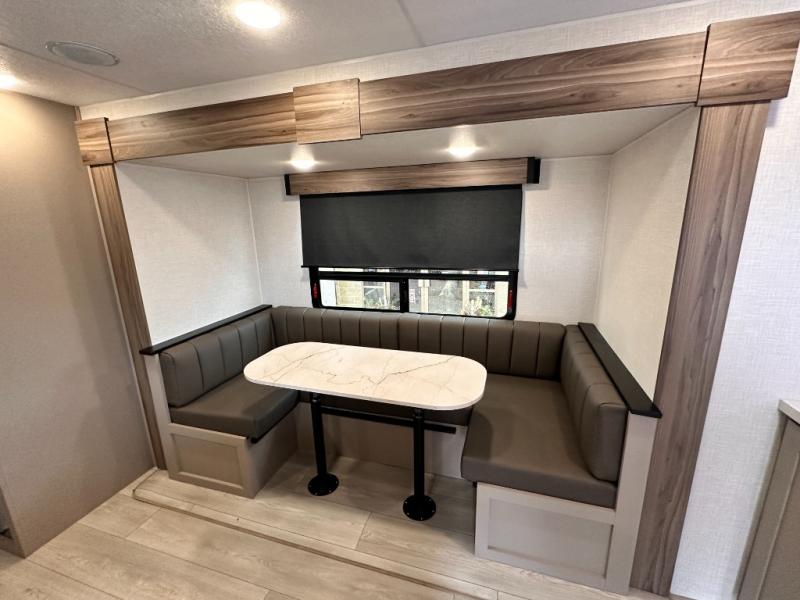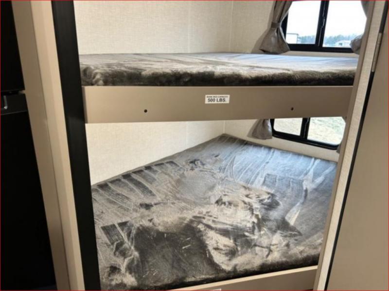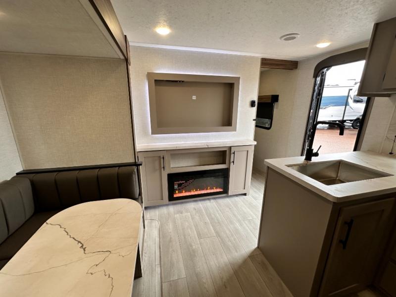 Get ready for outdoor fun at your favorite campground or RV park, and relaxation both outside and inside this trailer! The 18' power awning provides protection from the elements and the LED light strip allows you to stay up late, the outside kitchen and griddle provide amenities to make meals in the great outdoors, plus the trunk door and the pass-through storage give you access to stow items away. When you are ready to call it a night, there is a queen bed in the front private bedroom, double-size bunks next to the full bathroom, and a U-shaped dinette slide offers extra sleeping space. The next morning, the cook can make meals using the L-shaped kitchen with full amenities, or head back outdoors to use the outside amenities.